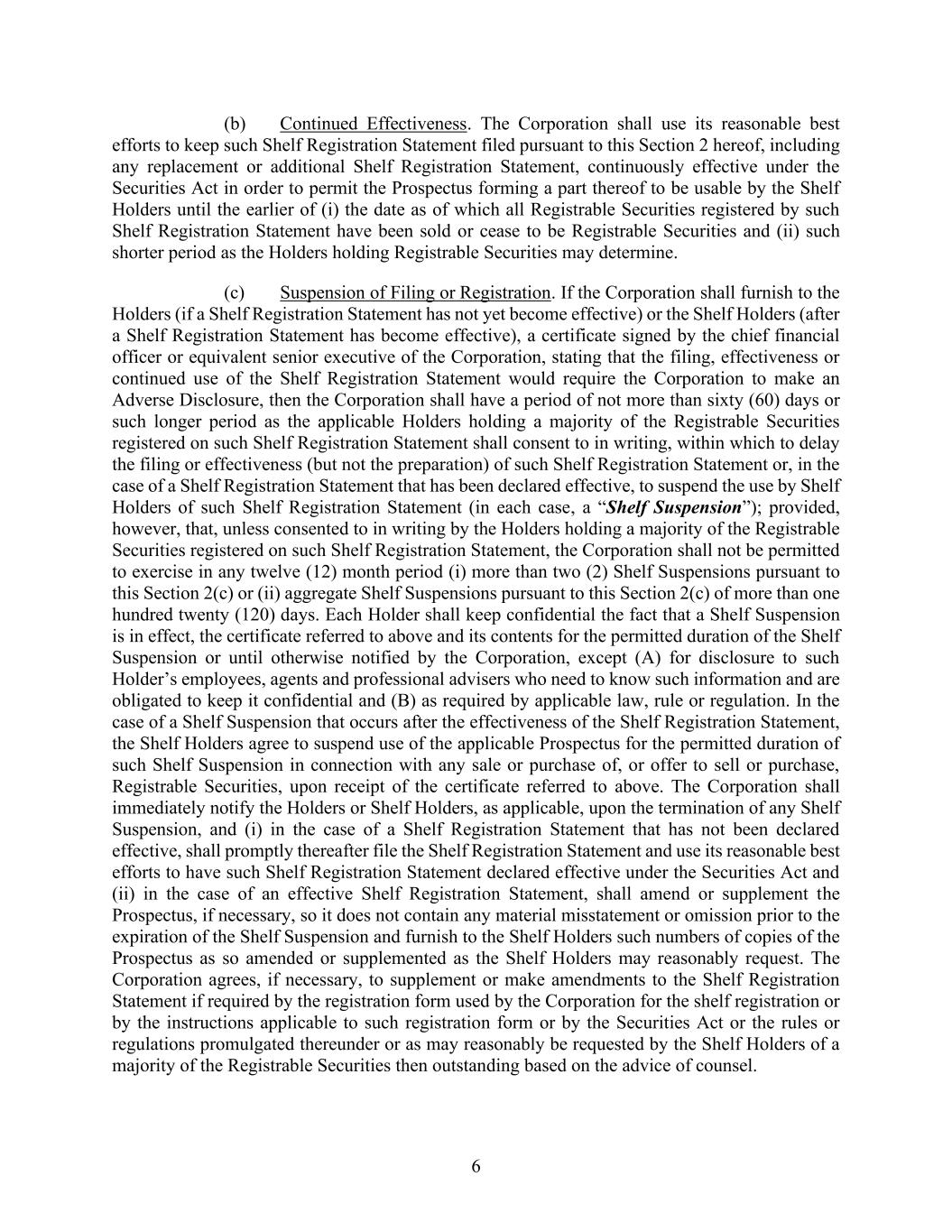 6 (b) Continued Effectiveness. The Corporation shall use its reasonable best efforts to keep such Shelf Registration Statement filed pursuant to this Section 2 hereof, including any replacement or additional Shelf Registration Statement, continuously effective under the Securities Act in order to permit the Prospectus forming a part thereof to be usable by the Shelf Holders until the earlier of (i) the date as of which all Registrable Securities registered by such Shelf Registration Statement have been sold or cease to be Registrable Securities and (ii) such shorter period as the Holders holding Registrable Securities may determine. (c) Suspension of Filing or Registration. If the Corporation shall furnish to the Holders (if a Shelf Registration Statement has not yet become effective) or the Shelf Holders (after a Shelf Registration Statement has become effective), a certificate signed by the chief financial officer or equivalent senior executive of the Corporation, stating that the filing, effectiveness or continued use of the Shelf Registration Statement would require the Corporation to make an Adverse Disclosure, then the Corporation shall have a period of not more than sixty (60) days or such longer period as the applicable Holders holding a majority of the Registrable Securities registered on such Shelf Registration Statement shall consent to in writing, within which to delay the filing or effectiveness (but not the preparation) of such Shelf Registration Statement or, in the case of a Shelf Registration Statement that has been declared effective, to suspend the use by Shelf Holders of such Shelf Registration Statement (in each case, a “Shelf Suspension”); provided, however, that, unless consented to in writing by the Holders holding a majority of the Registrable Securities registered on such Shelf Registration Statement, the Corporation shall not be permitted to exercise in any twelve (12) month period (i) more than two (2) Shelf Suspensions pursuant to this Section 2(c) or (ii) aggregate Shelf Suspensions pursuant to this Section 2(c) of more than one hundred twenty (120) days. Each Holder shall keep confidential the fact that a Shelf Suspension is in effect, the certificate referred to above and its contents for the permitted duration of the Shelf Suspension or until otherwise notified by the Corporation, except (A) for disclosure to such Holder’s employees, agents and professional advisers who need to know such information and are obligated to keep it confidential and (B) as required by applicable law, rule or regulation. In the case of a Shelf Suspension that occurs after the effectiveness of the Shelf Registration Statement, the Shelf Holders agree to suspend use of the applicable Prospectus for the permitted duration of such Shelf Suspension in connection with any sale or purchase of, or offer to sell or purchase, Registrable Securities, upon receipt of the certificate referred to above. The Corporation shall immediately notify the Holders or Shelf Holders, as applicable, upon the termination of any Shelf Suspension, and (i) in the case of a Shelf Registration Statement that has not been declared effective, shall promptly thereafter file the Shelf Registration Statement and use its reasonable best efforts to have such Shelf Registration Statement declared effective under the Securities Act and (ii) in the case of an effective Shelf Registration Statement, shall amend or supplement the Prospectus, if necessary, so it does not contain any material misstatement or omission prior to the expiration of the Shelf Suspension and furnish to the Shelf Holders such numbers of copies of the Prospectus as so amended or supplemented as the Shelf Holders may reasonably request. The Corporation agrees, if necessary, to supplement or make amendments to the Shelf Registration Statement if required by the registration form used by the Corporation for the shelf registration or by the instructions applicable to such registration form or by the Securities Act or the rules or regulations promulgated thereunder or as may reasonably be requested by the Shelf Holders of a majority of the Registrable Securities then outstanding based on the advice of counsel.