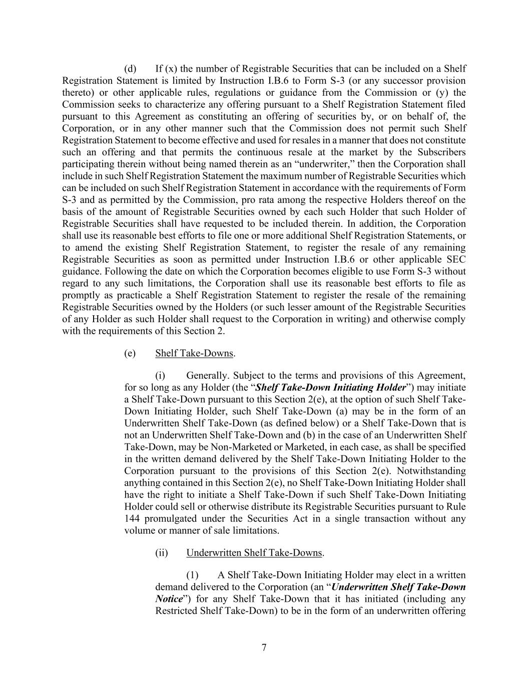 7 (d) If (x) the number of Registrable Securities that can be included on a Shelf Registration Statement is limited by Instruction I.B.6 to Form S-3 (or any successor provision thereto) or other applicable rules, regulations or guidance from the Commission or (y) the Commission seeks to characterize any offering pursuant to a Shelf Registration Statement filed pursuant to this Agreement as constituting an offering of securities by, or on behalf of, the Corporation, or in any other manner such that the Commission does not permit such Shelf Registration Statement to become effective and used for resales in a manner that does not constitute such an offering and that permits the continuous resale at the market by the Subscribers participating therein without being named therein as an “underwriter,” then the Corporation shall include in such Shelf Registration Statement the maximum number of Registrable Securities which can be included on such Shelf Registration Statement in accordance with the requirements of Form S-3 and as permitted by the Commission, pro rata among the respective Holders thereof on the basis of the amount of Registrable Securities owned by each such Holder that such Holder of Registrable Securities shall have requested to be included therein. In addition, the Corporation shall use its reasonable best efforts to file one or more additional Shelf Registration Statements, or to amend the existing Shelf Registration Statement, to register the resale of any remaining Registrable Securities as soon as permitted under Instruction I.B.6 or other applicable SEC guidance. Following the date on which the Corporation becomes eligible to use Form S-3 without regard to any such limitations, the Corporation shall use its reasonable best efforts to file as promptly as practicable a Shelf Registration Statement to register the resale of the remaining Registrable Securities owned by the Holders (or such lesser amount of the Registrable Securities of any Holder as such Holder shall request to the Corporation in writing) and otherwise comply with the requirements of this Section 2. (e) Shelf Take-Downs. (i) Generally. Subject to the terms and provisions of this Agreement, for so long as any Holder (the “Shelf Take-Down Initiating Holder”) may initiate a Shelf Take-Down pursuant to this Section 2(e), at the option of such Shelf Take- Down Initiating Holder, such Shelf Take-Down (a) may be in the form of an Underwritten Shelf Take-Down (as defined below) or a Shelf Take-Down that is not an Underwritten Shelf Take-Down and (b) in the case of an Underwritten Shelf Take-Down, may be Non-Marketed or Marketed, in each case, as shall be specified in the written demand delivered by the Shelf Take-Down Initiating Holder to the Corporation pursuant to the provisions of this Section 2(e). Notwithstanding anything contained in this Section 2(e), no Shelf Take-Down Initiating Holder shall have the right to initiate a Shelf Take-Down if such Shelf Take-Down Initiating Holder could sell or otherwise distribute its Registrable Securities pursuant to Rule 144 promulgated under the Securities Act in a single transaction without any volume or manner of sale limitations. (ii) Underwritten Shelf Take-Downs. (1) A Shelf Take-Down Initiating Holder may elect in a written demand delivered to the Corporation (an “Underwritten Shelf Take-Down Notice”) for any Shelf Take-Down that it has initiated (including any Restricted Shelf Take-Down) to be in the form of an underwritten offering