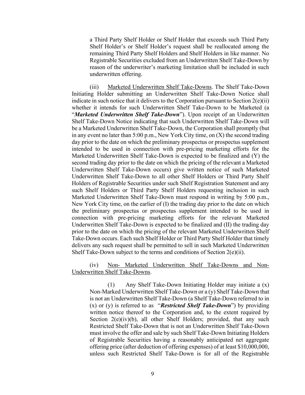 9 a Third Party Shelf Holder or Shelf Holder that exceeds such Third Party Shelf Holder’s or Shelf Holder’s request shall be reallocated among the remaining Third Party Shelf Holders and Shelf Holders in like manner. No Registrable Securities excluded from an Underwritten Shelf Take-Down by reason of the underwriter’s marketing limitation shall be included in such underwritten offering. (iii) Marketed Underwritten Shelf Take-Downs. The Shelf Take-Down Initiating Holder submitting an Underwritten Shelf Take-Down Notice shall indicate in such notice that it delivers to the Corporation pursuant to Section 2(e)(ii) whether it intends for such Underwritten Shelf Take-Down to be Marketed (a “Marketed Underwritten Shelf Take-Down”). Upon receipt of an Underwritten Shelf Take-Down Notice indicating that such Underwritten Shelf Take-Down will be a Marketed Underwritten Shelf Take-Down, the Corporation shall promptly (but in any event no later than 5:00 p.m., New York City time, on (X) the second trading day prior to the date on which the preliminary prospectus or prospectus supplement intended to be used in connection with pre-pricing marketing efforts for the Marketed Underwritten Shelf Take-Down is expected to be finalized and (Y) the second trading day prior to the date on which the pricing of the relevant a Marketed Underwritten Shelf Take-Down occurs) give written notice of such Marketed Underwritten Shelf Take-Down to all other Shelf Holders or Third Party Shelf Holders of Registrable Securities under such Shelf Registration Statement and any such Shelf Holders or Third Party Shelf Holders requesting inclusion in such Marketed Underwritten Shelf Take-Down must respond in writing by 5:00 p.m., New York City time, on the earlier of (I) the trading day prior to the date on which the preliminary prospectus or prospectus supplement intended to be used in connection with pre-pricing marketing efforts for the relevant Marketed Underwritten Shelf Take-Down is expected to be finalized and (II) the trading day prior to the date on which the pricing of the relevant Marketed Underwritten Shelf Take-Down occurs. Each such Shelf Holder or Third Party Shelf Holder that timely delivers any such request shall be permitted to sell in such Marketed Underwritten Shelf Take-Down subject to the terms and conditions of Section 2(e)(ii). (iv) Non- Marketed Underwritten Shelf Take-Downs and Non- Underwritten Shelf Take-Downs. (1) Any Shelf Take-Down Initiating Holder may initiate a (x) Non-Marked Underwritten Shelf Take-Down or a (y) Shelf Take-Down that is not an Underwritten Shelf Take-Down (a Shelf Take-Down referred to in (x) or (y) is referred to as “Restricted Shelf Take-Down”) by providing written notice thereof to the Corporation and, to the extent required by Section 2(e)(iv)(b), all other Shelf Holders; provided, that any such Restricted Shelf Take-Down that is not an Underwritten Shelf Take-Down must involve the offer and sale by such Shelf Take-Down Initiating Holders of Registrable Securities having a reasonably anticipated net aggregate offering price (after deduction of offering expenses) of at least $10,000,000, unless such Restricted Shelf Take-Down is for all of the Registrable