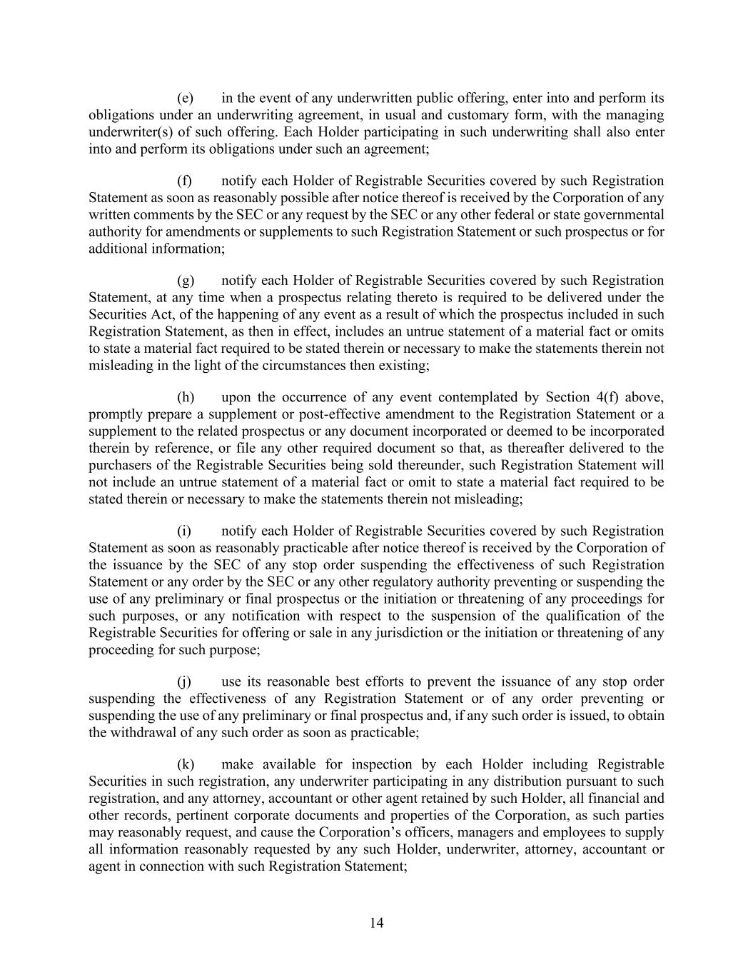 14 (e) in the event of any underwritten public offering, enter into and perform its obligations under an underwriting agreement, in usual and customary form, with the managing underwriter(s) of such offering. Each Holder participating in such underwriting shall also enter into and perform its obligations under such an agreement; (f) notify each Holder of Registrable Securities covered by such Registration Statement as soon as reasonably possible after notice thereof is received by the Corporation of any written comments by the SEC or any request by the SEC or any other federal or state governmental authority for amendments or supplements to such Registration Statement or such prospectus or for additional information; (g) notify each Holder of Registrable Securities covered by such Registration Statement, at any time when a prospectus relating thereto is required to be delivered under the Securities Act, of the happening of any event as a result of which the prospectus included in such Registration Statement, as then in effect, includes an untrue statement of a material fact or omits to state a material fact required to be stated therein or necessary to make the statements therein not misleading in the light of the circumstances then existing; (h) upon the occurrence of any event contemplated by Section 4(f) above, promptly prepare a supplement or post-effective amendment to the Registration Statement or a supplement to the related prospectus or any document incorporated or deemed to be incorporated therein by reference, or file any other required document so that, as thereafter delivered to the purchasers of the Registrable Securities being sold thereunder, such Registration Statement will not include an untrue statement of a material fact or omit to state a material fact required to be stated therein or necessary to make the statements therein not misleading; (i) notify each Holder of Registrable Securities covered by such Registration Statement as soon as reasonably practicable after notice thereof is received by the Corporation of the issuance by the SEC of any stop order suspending the effectiveness of such Registration Statement or any order by the SEC or any other regulatory authority preventing or suspending the use of any preliminary or final prospectus or the initiation or threatening of any proceedings for such purposes, or any notification with respect to the suspension of the qualification of the Registrable Securities for offering or sale in any jurisdiction or the initiation or threatening of any proceeding for such purpose; (j) use its reasonable best efforts to prevent the issuance of any stop order suspending the effectiveness of any Registration Statement or of any order preventing or suspending the use of any preliminary or final prospectus and, if any such order is issued, to obtain the withdrawal of any such order as soon as practicable; (k) make available for inspection by each Holder including Registrable Securities in such registration, any underwriter participating in any distribution pursuant to such registration, and any attorney, accountant or other agent retained by such Holder, all financial and other records, pertinent corporate documents and properties of the Corporation, as such parties may reasonably request, and cause the Corporation’s officers, managers and employees to supply all information reasonably requested by any such Holder, underwriter, attorney, accountant or agent in connection with such Registration Statement;