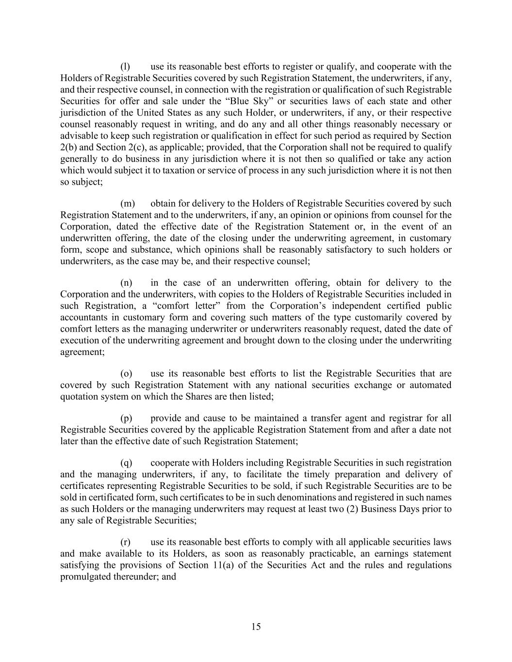 15 (l) use its reasonable best efforts to register or qualify, and cooperate with the Holders of Registrable Securities covered by such Registration Statement, the underwriters, if any, and their respective counsel, in connection with the registration or qualification of such Registrable Securities for offer and sale under the “Blue Sky” or securities laws of each state and other jurisdiction of the United States as any such Holder, or underwriters, if any, or their respective counsel reasonably request in writing, and do any and all other things reasonably necessary or advisable to keep such registration or qualification in effect for such period as required by Section 2(b) and Section 2(c), as applicable; provided, that the Corporation shall not be required to qualify generally to do business in any jurisdiction where it is not then so qualified or take any action which would subject it to taxation or service of process in any such jurisdiction where it is not then so subject; (m) obtain for delivery to the Holders of Registrable Securities covered by such Registration Statement and to the underwriters, if any, an opinion or opinions from counsel for the Corporation, dated the effective date of the Registration Statement or, in the event of an underwritten offering, the date of the closing under the underwriting agreement, in customary form, scope and substance, which opinions shall be reasonably satisfactory to such holders or underwriters, as the case may be, and their respective counsel; (n) in the case of an underwritten offering, obtain for delivery to the Corporation and the underwriters, with copies to the Holders of Registrable Securities included in such Registration, a “comfort letter” from the Corporation’s independent certified public accountants in customary form and covering such matters of the type customarily covered by comfort letters as the managing underwriter or underwriters reasonably request, dated the date of execution of the underwriting agreement and brought down to the closing under the underwriting agreement; (o) use its reasonable best efforts to list the Registrable Securities that are covered by such Registration Statement with any national securities exchange or automated quotation system on which the Shares are then listed; (p) provide and cause to be maintained a transfer agent and registrar for all Registrable Securities covered by the applicable Registration Statement from and after a date not later than the effective date of such Registration Statement; (q) cooperate with Holders including Registrable Securities in such registration and the managing underwriters, if any, to facilitate the timely preparation and delivery of certificates representing Registrable Securities to be sold, if such Registrable Securities are to be sold in certificated form, such certificates to be in such denominations and registered in such names as such Holders or the managing underwriters may request at least two (2) Business Days prior to any sale of Registrable Securities; (r) use its reasonable best efforts to comply with all applicable securities laws and make available to its Holders, as soon as reasonably practicable, an earnings statement satisfying the provisions of Section 11(a) of the Securities Act and the rules and regulations promulgated thereunder; and