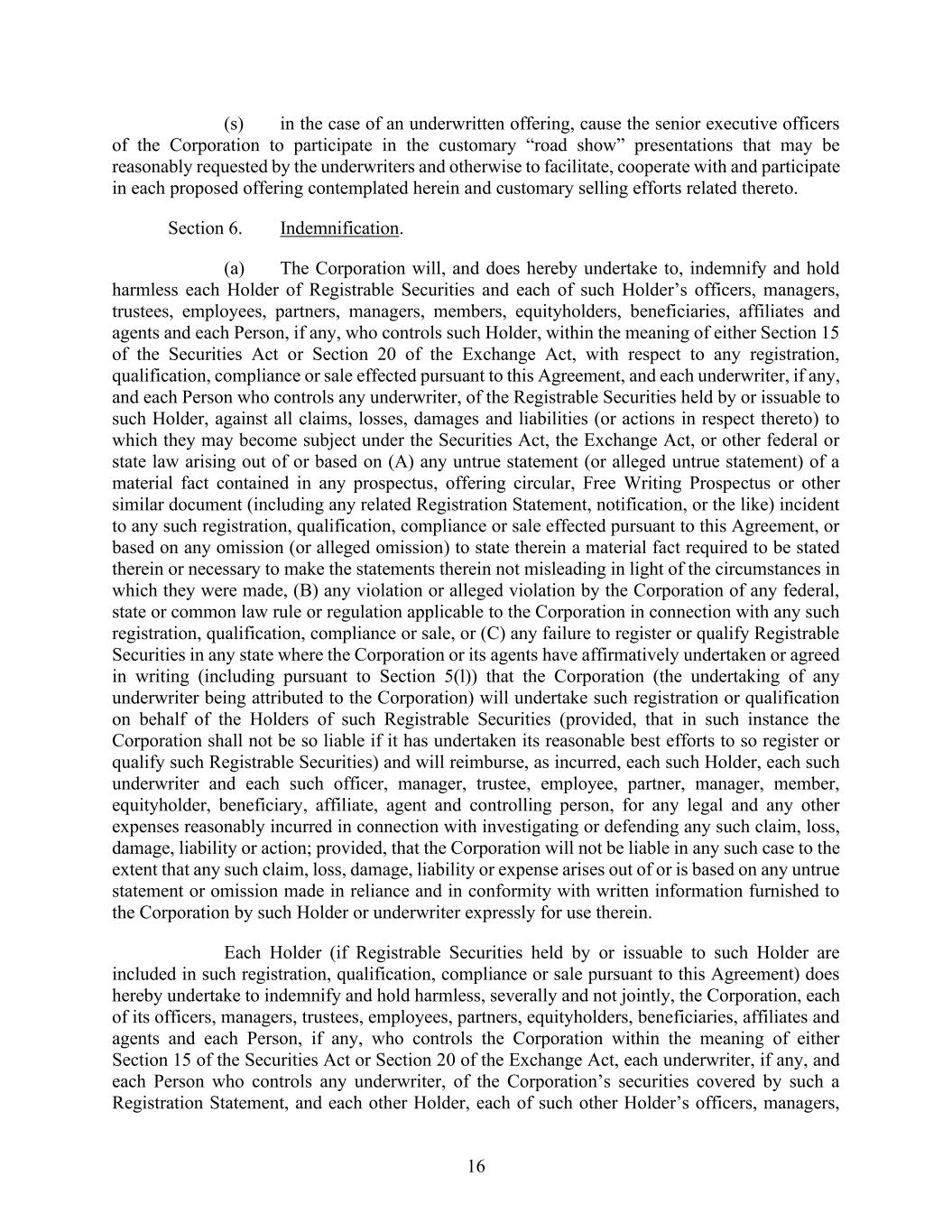 16 (s) in the case of an underwritten offering, cause the senior executive officers of the Corporation to participate in the customary “road show” presentations that may be reasonably requested by the underwriters and otherwise to facilitate, cooperate with and participate in each proposed offering contemplated herein and customary selling efforts related thereto. Section 6. Indemnification. (a) The Corporation will, and does hereby undertake to, indemnify and hold harmless each Holder of Registrable Securities and each of such Holder’s officers, managers, trustees, employees, partners, managers, members, equityholders, beneficiaries, affiliates and agents and each Person, if any, who controls such Holder, within the meaning of either Section 15 of the Securities Act or Section 20 of the Exchange Act, with respect to any registration, qualification, compliance or sale effected pursuant to this Agreement, and each underwriter, if any, and each Person who controls any underwriter, of the Registrable Securities held by or issuable to such Holder, against all claims, losses, damages and liabilities (or actions in respect thereto) to which they may become subject under the Securities Act, the Exchange Act, or other federal or state law arising out of or based on (A) any untrue statement (or alleged untrue statement) of a material fact contained in any prospectus, offering circular, Free Writing Prospectus or other similar document (including any related Registration Statement, notification, or the like) incident to any such registration, qualification, compliance or sale effected pursuant to this Agreement, or based on any omission (or alleged omission) to state therein a material fact required to be stated therein or necessary to make the statements therein not misleading in light of the circumstances in which they were made, (B) any violation or alleged violation by the Corporation of any federal, state or common law rule or regulation applicable to the Corporation in connection with any such registration, qualification, compliance or sale, or (C) any failure to register or qualify Registrable Securities in any state where the Corporation or its agents have affirmatively undertaken or agreed in writing (including pursuant to Section 5(l)) that the Corporation (the undertaking of any underwriter being attributed to the Corporation) will undertake such registration or qualification on behalf of the Holders of such Registrable Securities (provided, that in such instance the Corporation shall not be so liable if it has undertaken its reasonable best efforts to so register or qualify such Registrable Securities) and will reimburse, as incurred, each such Holder, each such underwriter and each such officer, manager, trustee, employee, partner, manager, member, equityholder, beneficiary, affiliate, agent and controlling person, for any legal and any other expenses reasonably incurred in connection with investigating or defending any such claim, loss, damage, liability or action; provided, that the Corporation will not be liable in any such case to the extent that any such claim, loss, damage, liability or expense arises out of or is based on any untrue statement or omission made in reliance and in conformity with written information furnished to the Corporation by such Holder or underwriter expressly for use therein. Each Holder (if Registrable Securities held by or issuable to such Holder are included in such registration, qualification, compliance or sale pursuant to this Agreement) does hereby undertake to indemnify and hold harmless, severally and not jointly, the Corporation, each of its officers, managers, trustees, employees, partners, equityholders, beneficiaries, affiliates and agents and each Person, if any, who controls the Corporation within the meaning of either Section 15 of the Securities Act or Section 20 of the Exchange Act, each underwriter, if any, and each Person who controls any underwriter, of the Corporation’s securities covered by such a Registration Statement, and each other Holder, each of such other Holder’s officers, managers,