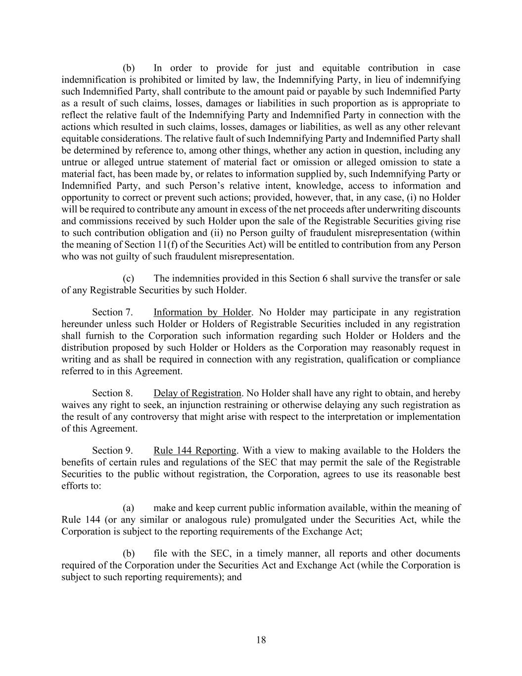 18 (b) In order to provide for just and equitable contribution in case indemnification is prohibited or limited by law, the Indemnifying Party, in lieu of indemnifying such Indemnified Party, shall contribute to the amount paid or payable by such Indemnified Party as a result of such claims, losses, damages or liabilities in such proportion as is appropriate to reflect the relative fault of the Indemnifying Party and Indemnified Party in connection with the actions which resulted in such claims, losses, damages or liabilities, as well as any other relevant equitable considerations. The relative fault of such Indemnifying Party and Indemnified Party shall be determined by reference to, among other things, whether any action in question, including any untrue or alleged untrue statement of material fact or omission or alleged omission to state a material fact, has been made by, or relates to information supplied by, such Indemnifying Party or Indemnified Party, and such Person’s relative intent, knowledge, access to information and opportunity to correct or prevent such actions; provided, however, that, in any case, (i) no Holder will be required to contribute any amount in excess of the net proceeds after underwriting discounts and commissions received by such Holder upon the sale of the Registrable Securities giving rise to such contribution obligation and (ii) no Person guilty of fraudulent misrepresentation (within the meaning of Section 11(f) of the Securities Act) will be entitled to contribution from any Person who was not guilty of such fraudulent misrepresentation. (c) The indemnities provided in this Section 6 shall survive the transfer or sale of any Registrable Securities by such Holder. Section 7. Information by Holder. No Holder may participate in any registration hereunder unless such Holder or Holders of Registrable Securities included in any registration shall furnish to the Corporation such information regarding such Holder or Holders and the distribution proposed by such Holder or Holders as the Corporation may reasonably request in writing and as shall be required in connection with any registration, qualification or compliance referred to in this Agreement. Section 8. Delay of Registration. No Holder shall have any right to obtain, and hereby waives any right to seek, an injunction restraining or otherwise delaying any such registration as the result of any controversy that might arise with respect to the interpretation or implementation of this Agreement. Section 9. Rule 144 Reporting. With a view to making available to the Holders the benefits of certain rules and regulations of the SEC that may permit the sale of the Registrable Securities to the public without registration, the Corporation, agrees to use its reasonable best efforts to: (a) make and keep current public information available, within the meaning of Rule 144 (or any similar or analogous rule) promulgated under the Securities Act, while the Corporation is subject to the reporting requirements of the Exchange Act; (b) file with the SEC, in a timely manner, all reports and other documents required of the Corporation under the Securities Act and Exchange Act (while the Corporation is subject to such reporting requirements); and