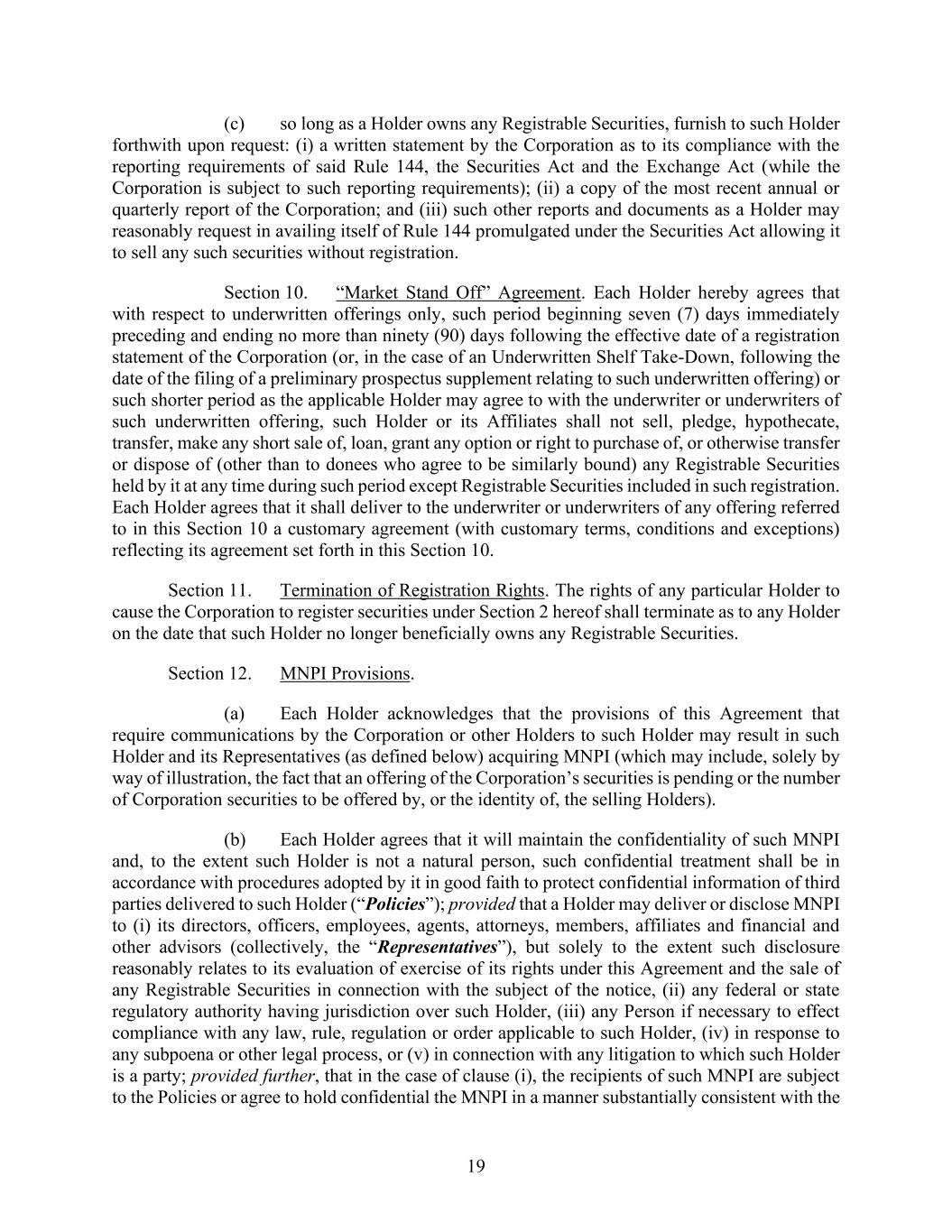 19 (c) so long as a Holder owns any Registrable Securities, furnish to such Holder forthwith upon request: (i) a written statement by the Corporation as to its compliance with the reporting requirements of said Rule 144, the Securities Act and the Exchange Act (while the Corporation is subject to such reporting requirements); (ii) a copy of the most recent annual or quarterly report of the Corporation; and (iii) such other reports and documents as a Holder may reasonably request in availing itself of Rule 144 promulgated under the Securities Act allowing it to sell any such securities without registration. Section 10. “Market Stand Off” Agreement. Each Holder hereby agrees that with respect to underwritten offerings only, such period beginning seven (7) days immediately preceding and ending no more than ninety (90) days following the effective date of a registration statement of the Corporation (or, in the case of an Underwritten Shelf Take-Down, following the date of the filing of a preliminary prospectus supplement relating to such underwritten offering) or such shorter period as the applicable Holder may agree to with the underwriter or underwriters of such underwritten offering, such Holder or its Affiliates shall not sell, pledge, hypothecate, transfer, make any short sale of, loan, grant any option or right to purchase of, or otherwise transfer or dispose of (other than to donees who agree to be similarly bound) any Registrable Securities held by it at any time during such period except Registrable Securities included in such registration. Each Holder agrees that it shall deliver to the underwriter or underwriters of any offering referred to in this Section 10 a customary agreement (with customary terms, conditions and exceptions) reflecting its agreement set forth in this Section 10. Section 11. Termination of Registration Rights. The rights of any particular Holder to cause the Corporation to register securities under Section 2 hereof shall terminate as to any Holder on the date that such Holder no longer beneficially owns any Registrable Securities. Section 12. MNPI Provisions. (a) Each Holder acknowledges that the provisions of this Agreement that require communications by the Corporation or other Holders to such Holder may result in such Holder and its Representatives (as defined below) acquiring MNPI (which may include, solely by way of illustration, the fact that an offering of the Corporation’s securities is pending or the number of Corporation securities to be offered by, or the identity of, the selling Holders). (b) Each Holder agrees that it will maintain the confidentiality of such MNPI and, to the extent such Holder is not a natural person, such confidential treatment shall be in accordance with procedures adopted by it in good faith to protect confidential information of third parties delivered to such Holder (“Policies”); provided that a Holder may deliver or disclose MNPI to (i) its directors, officers, employees, agents, attorneys, members, affiliates and financial and other advisors (collectively, the “Representatives”), but solely to the extent such disclosure reasonably relates to its evaluation of exercise of its rights under this Agreement and the sale of any Registrable Securities in connection with the subject of the notice, (ii) any federal or state regulatory authority having jurisdiction over such Holder, (iii) any Person if necessary to effect compliance with any law, rule, regulation or order applicable to such Holder, (iv) in response to any subpoena or other legal process, or (v) in connection with any litigation to which such Holder is a party; provided further, that in the case of clause (i), the recipients of such MNPI are subject to the Policies or agree to hold confidential the MNPI in a manner substantially consistent with the