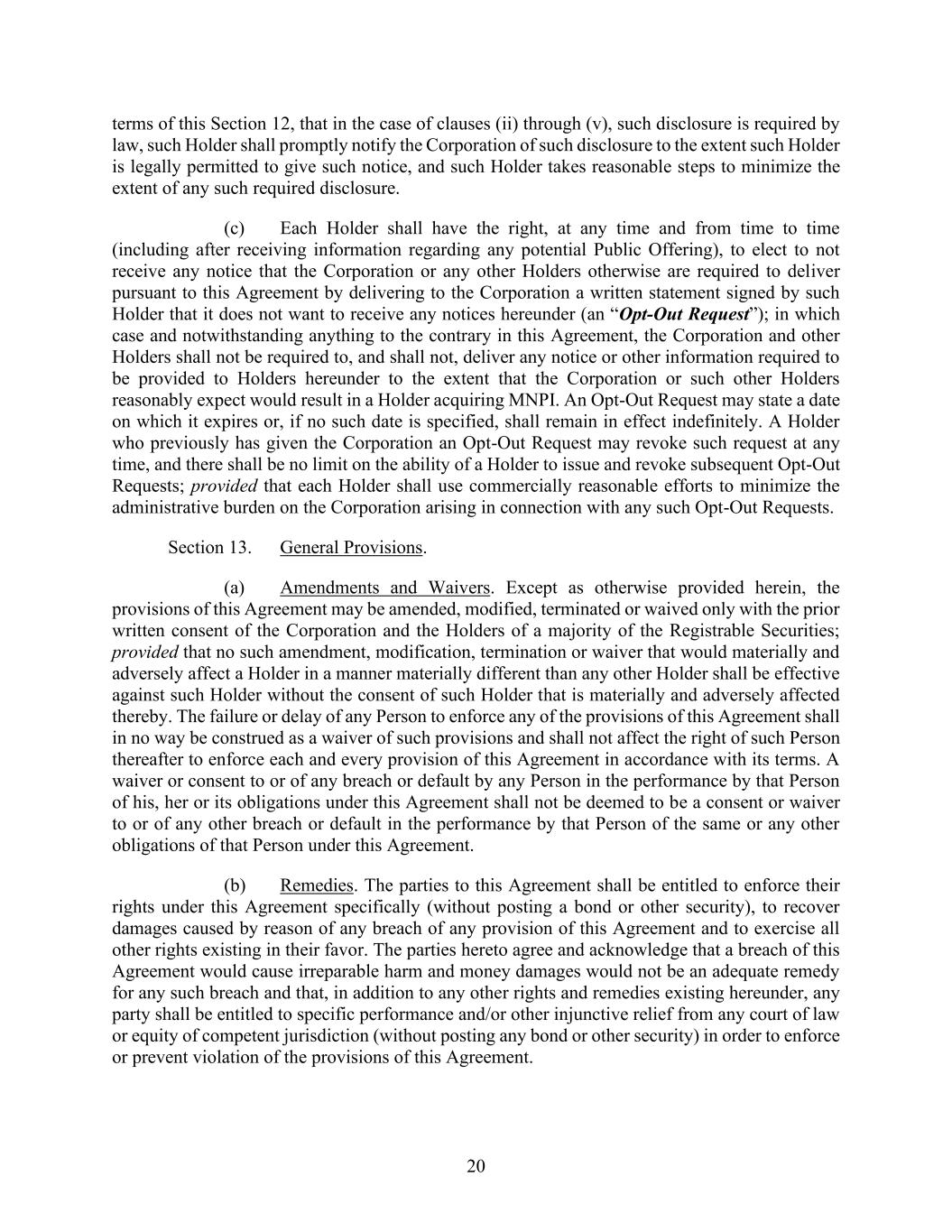 20 terms of this Section 12, that in the case of clauses (ii) through (v), such disclosure is required by law, such Holder shall promptly notify the Corporation of such disclosure to the extent such Holder is legally permitted to give such notice, and such Holder takes reasonable steps to minimize the extent of any such required disclosure. (c) Each Holder shall have the right, at any time and from time to time (including after receiving information regarding any potential Public Offering), to elect to not receive any notice that the Corporation or any other Holders otherwise are required to deliver pursuant to this Agreement by delivering to the Corporation a written statement signed by such Holder that it does not want to receive any notices hereunder (an “Opt-Out Request”); in which case and notwithstanding anything to the contrary in this Agreement, the Corporation and other Holders shall not be required to, and shall not, deliver any notice or other information required to be provided to Holders hereunder to the extent that the Corporation or such other Holders reasonably expect would result in a Holder acquiring MNPI. An Opt-Out Request may state a date on which it expires or, if no such date is specified, shall remain in effect indefinitely. A Holder who previously has given the Corporation an Opt-Out Request may revoke such request at any time, and there shall be no limit on the ability of a Holder to issue and revoke subsequent Opt-Out Requests; provided that each Holder shall use commercially reasonable efforts to minimize the administrative burden on the Corporation arising in connection with any such Opt-Out Requests. Section 13. General Provisions. (a) Amendments and Waivers. Except as otherwise provided herein, the provisions of this Agreement may be amended, modified, terminated or waived only with the prior written consent of the Corporation and the Holders of a majority of the Registrable Securities; provided that no such amendment, modification, termination or waiver that would materially and adversely affect a Holder in a manner materially different than any other Holder shall be effective against such Holder without the consent of such Holder that is materially and adversely affected thereby. The failure or delay of any Person to enforce any of the provisions of this Agreement shall in no way be construed as a waiver of such provisions and shall not affect the right of such Person thereafter to enforce each and every provision of this Agreement in accordance with its terms. A waiver or consent to or of any breach or default by any Person in the performance by that Person of his, her or its obligations under this Agreement shall not be deemed to be a consent or waiver to or of any other breach or default in the performance by that Person of the same or any other obligations of that Person under this Agreement. (b) Remedies. The parties to this Agreement shall be entitled to enforce their rights under this Agreement specifically (without posting a bond or other security), to recover damages caused by reason of any breach of any provision of this Agreement and to exercise all other rights existing in their favor. The parties hereto agree and acknowledge that a breach of this Agreement would cause irreparable harm and money damages would not be an adequate remedy for any such breach and that, in addition to any other rights and remedies existing hereunder, any party shall be entitled to specific performance and/or other injunctive relief from any court of law or equity of competent jurisdiction (without posting any bond or other security) in order to enforce or prevent violation of the provisions of this Agreement.