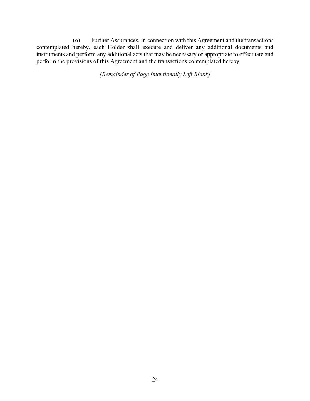 24 (o) Further Assurances. In connection with this Agreement and the transactions contemplated hereby, each Holder shall execute and deliver any additional documents and instruments and perform any additional acts that may be necessary or appropriate to effectuate and perform the provisions of this Agreement and the transactions contemplated hereby. [Remainder of Page Intentionally Left Blank]