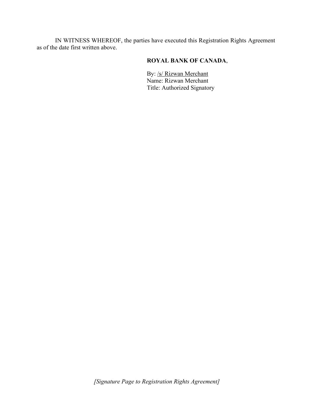 [Signature Page to Registration Rights Agreement] IN WITNESS WHEREOF, the parties have executed this Registration Rights Agreement as of the date first written above. ROYAL BANK OF CANADA, By: /s/ Rizwan Merchant Name: Rizwan Merchant Title: Authorized Signatory