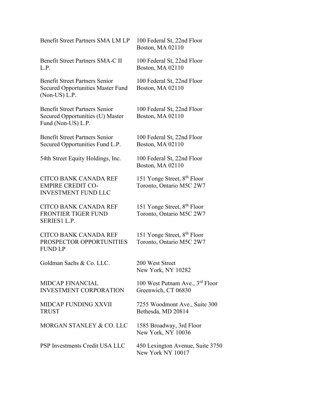 Benefit Street Partners SMA LM LP 100 Federal St, 22nd Floor Boston, MA 02110 Benefit Street Partners SMA-C II L.P. 100 Federal St, 22nd Floor Boston, MA 02110 Benefit Street Partners Senior Secured Opportunities Master Fund (Non-US) L.P. 100 Federal St, 22nd Floor Boston, MA 02110 Benefit Street Partners Senior Secured Opportunities (U) Master Fund (Non-US) L.P. 100 Federal St, 22nd Floor Boston, MA 02110 Benefit Street Partners Senior Secured Opportunities Fund L.P. 100 Federal St, 22nd Floor Boston, MA 02110 54th Street Equity Holdings, Inc. 100 Federal St, 22nd Floor Boston, MA 02110 CITCO BANK CANADA REF EMPIRE CREDIT CO- INVESTMENT FUND LLC 151 Yonge Street, 8th Floor Toronto, Ontario M5C 2W7 CITCO BANK CANADA REF FRONTIER TIGER FUND SERIES1 L.P. 151 Yonge Street, 8th Floor Toronto, Ontario M5C 2W7 CITCO BANK CANADA REF PROSPECTOR OPPORTUNITIES FUND LP 151 Yonge Street, 8th Floor Toronto, Ontario M5C 2W7 Goldman Sachs & Co. LLC. 200 West Street New York, NY 10282 MIDCAP FINANCIAL INVESTMENT CORPORATION 100 West Putnam Ave., 3rd Floor Greenwich, CT 06830 MIDCAP FUNDING XXVII TRUST 7255 Woodmont Ave., Suite 300 Bethesda, MD 20814 MORGAN STANLEY & CO. LLC 1585 Broadway, 3rd Floor New York, NY 10036 PSP Investments Credit USA LLC 450 Lexington Avenue, Suite 3750 New York NY 10017