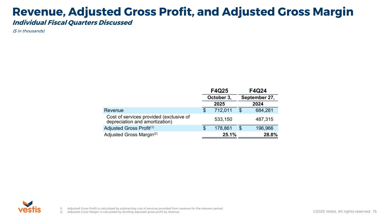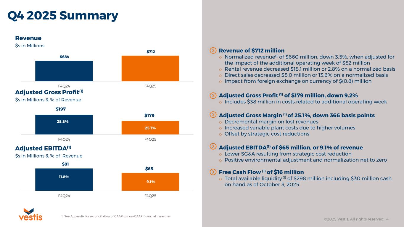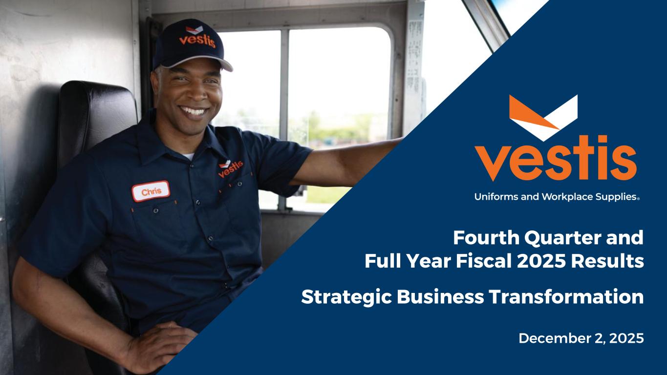 ATLANTA, GA, December 1, 2025 – Vestis Corporation (NYSE: VSTS), a leading provider of uniforms and workplace supplies, today announced its results for the fiscal fourth quarter and full-year periods ended October 3, 2025, both of which reflect an additional week of operations when compared to the same prior year period.