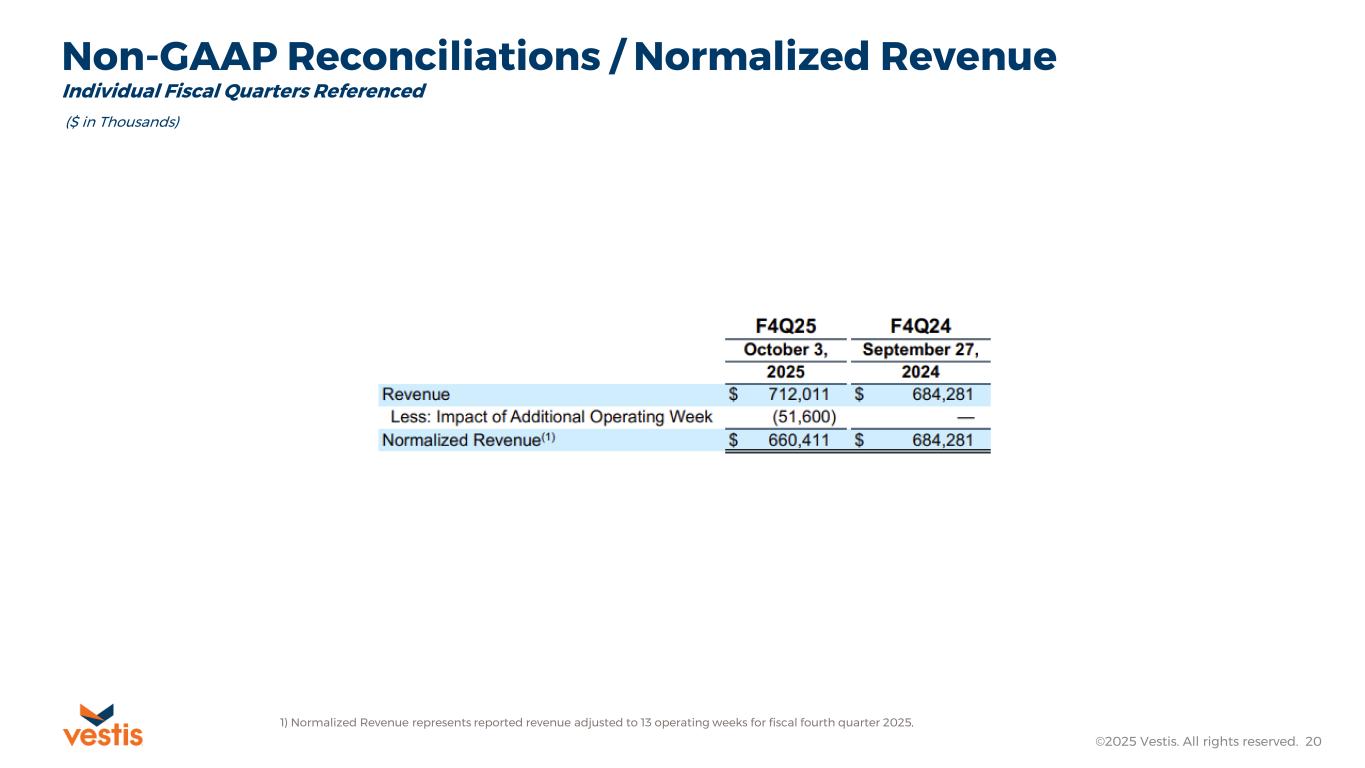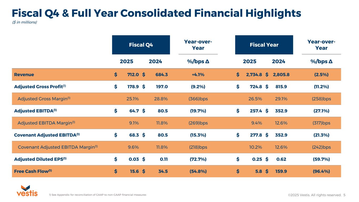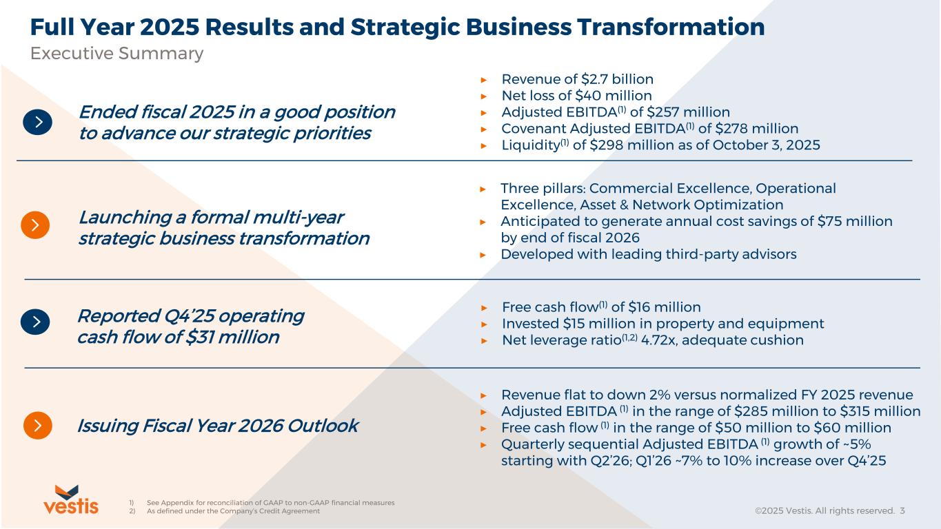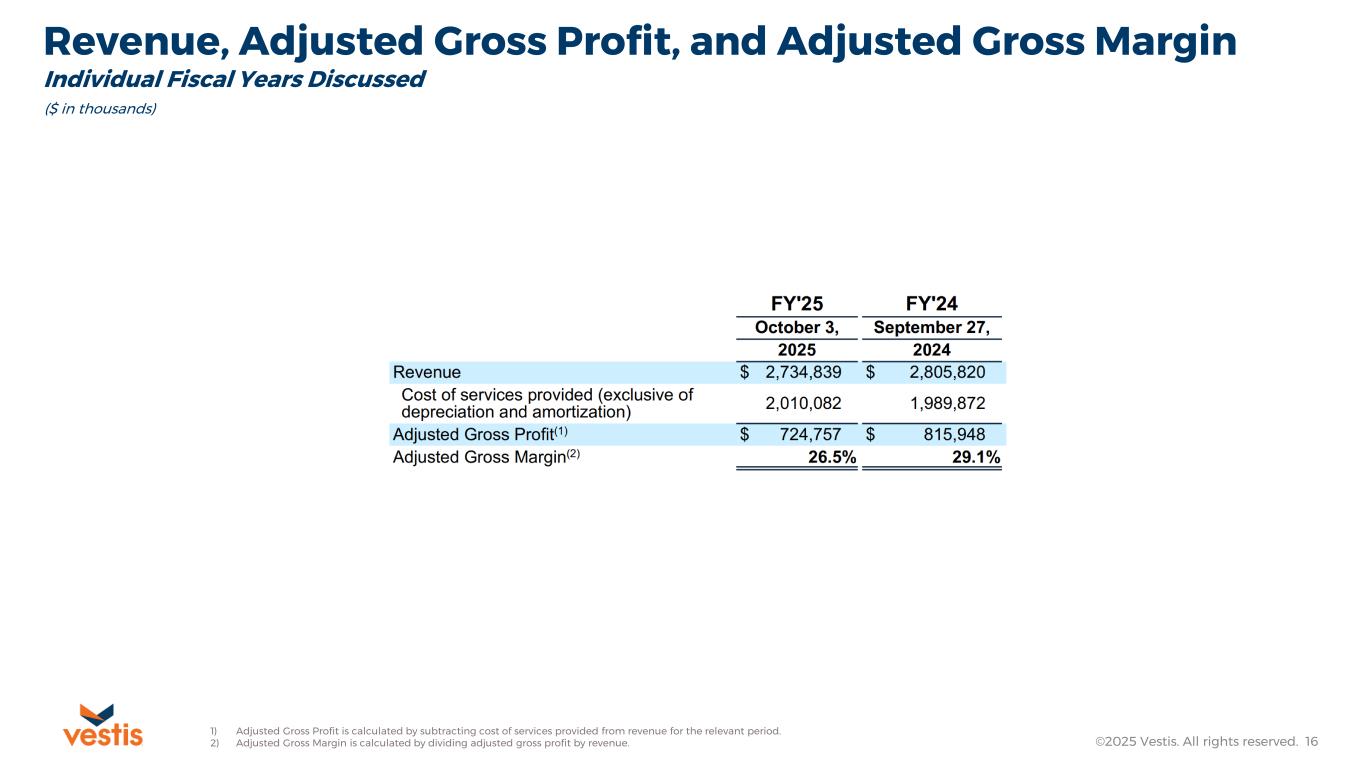 ATLANTA, GA, December 1, 2025 – Vestis Corporation (NYSE: VSTS), a leading provider of uniforms and workplace supplies, today announced its results for the fiscal fourth quarter and full-year periods ended October 3, 2025, both of which reflect an additional week of operations when compared to the same prior year period.