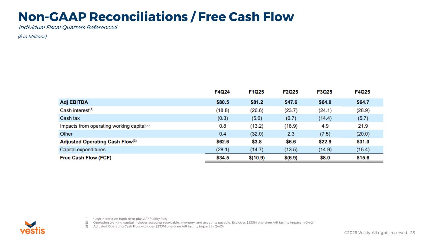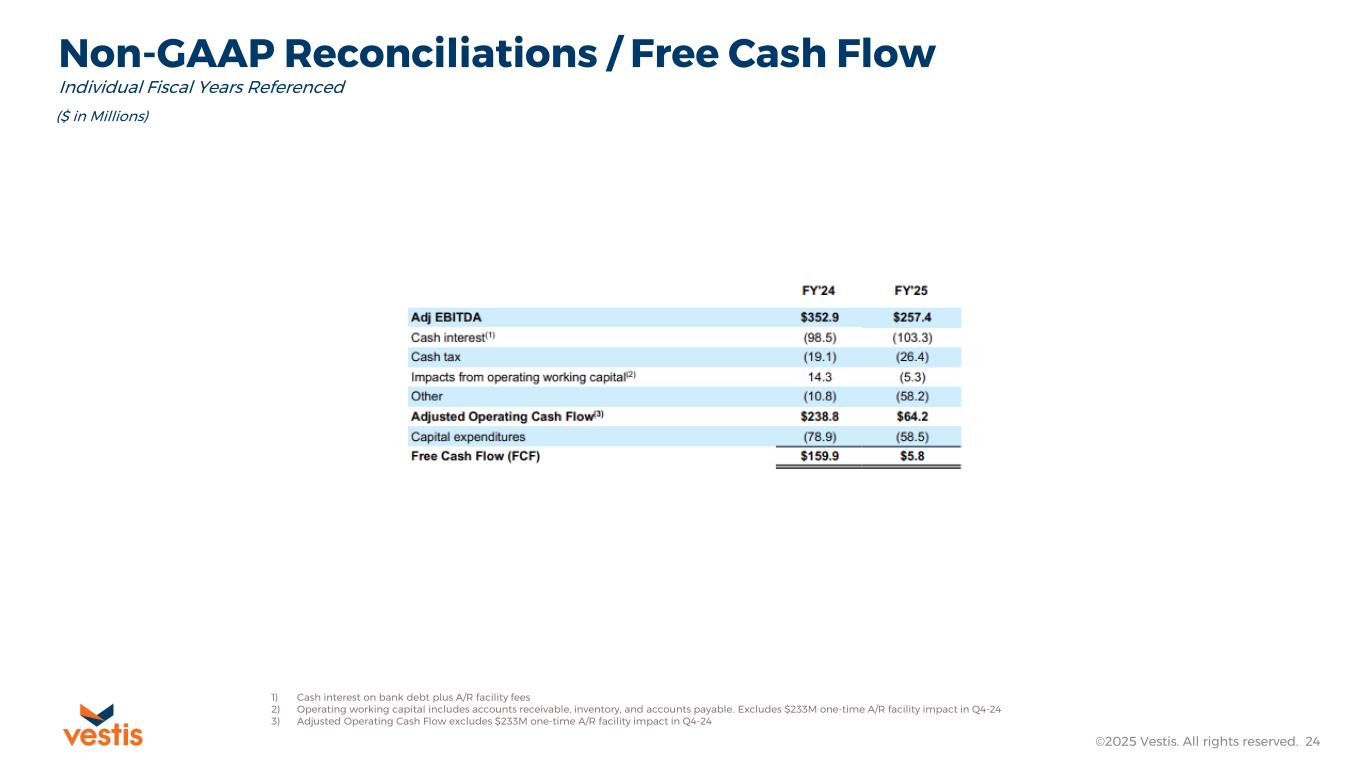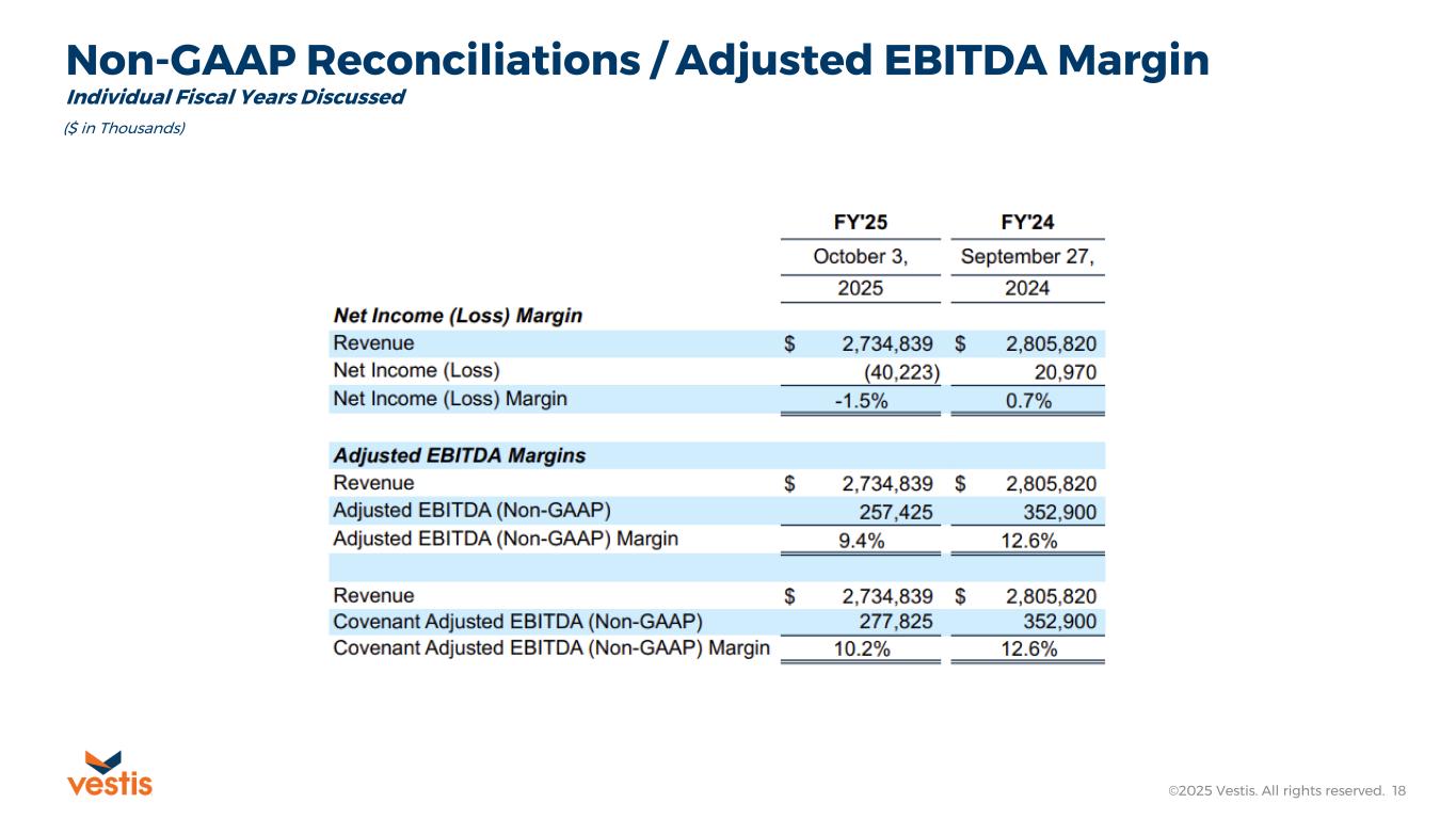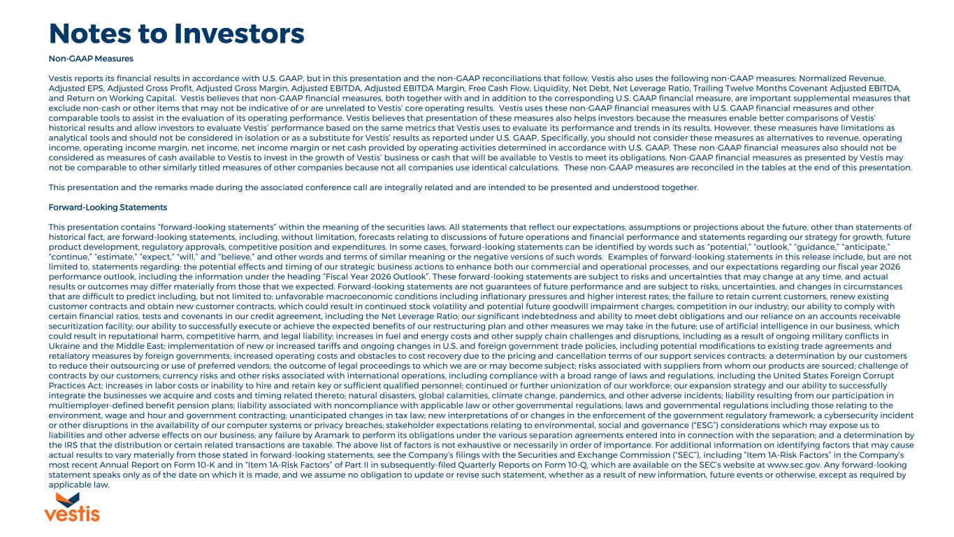 Vestis reports its financial results in accordance with U.S. GAAP, but in this release and the non-GAAP reconciliations that follow, Vestis also uses the following non-GAAP measures: Adjusted EBITDA, Adjusted Net Income (Loss), Free Cash Flow, Net Debt, Net Leverage Ratio, and Trailing Twelve Months Covenant Adjusted EBITDA. Vestis believes that non-GAAP financial measures, both together with and in addition to the corresponding U.S. GAAP financial measure, are important supplemental measures that exclude non-cash or other items that may not be indicative of or are unrelated to Vestis’ core operating results. Vestis uses these non-GAAP financial measures with U.S. GAAP financial measures and other comparable tools to assist in the evaluation of its operating performance. Vestis believes that presentation of these measures also helps investors because the measures enable better comparisons of Vestis’ historical results and allow investors to evaluate Vestis’ performance based on the same metrics that Vestis uses to evaluate its performance and trends in its results. However, these measures have limitations as analytical tools and should not be considered in isolation or as a substitute for Vestis’ results as reported under U.S. GAAP.