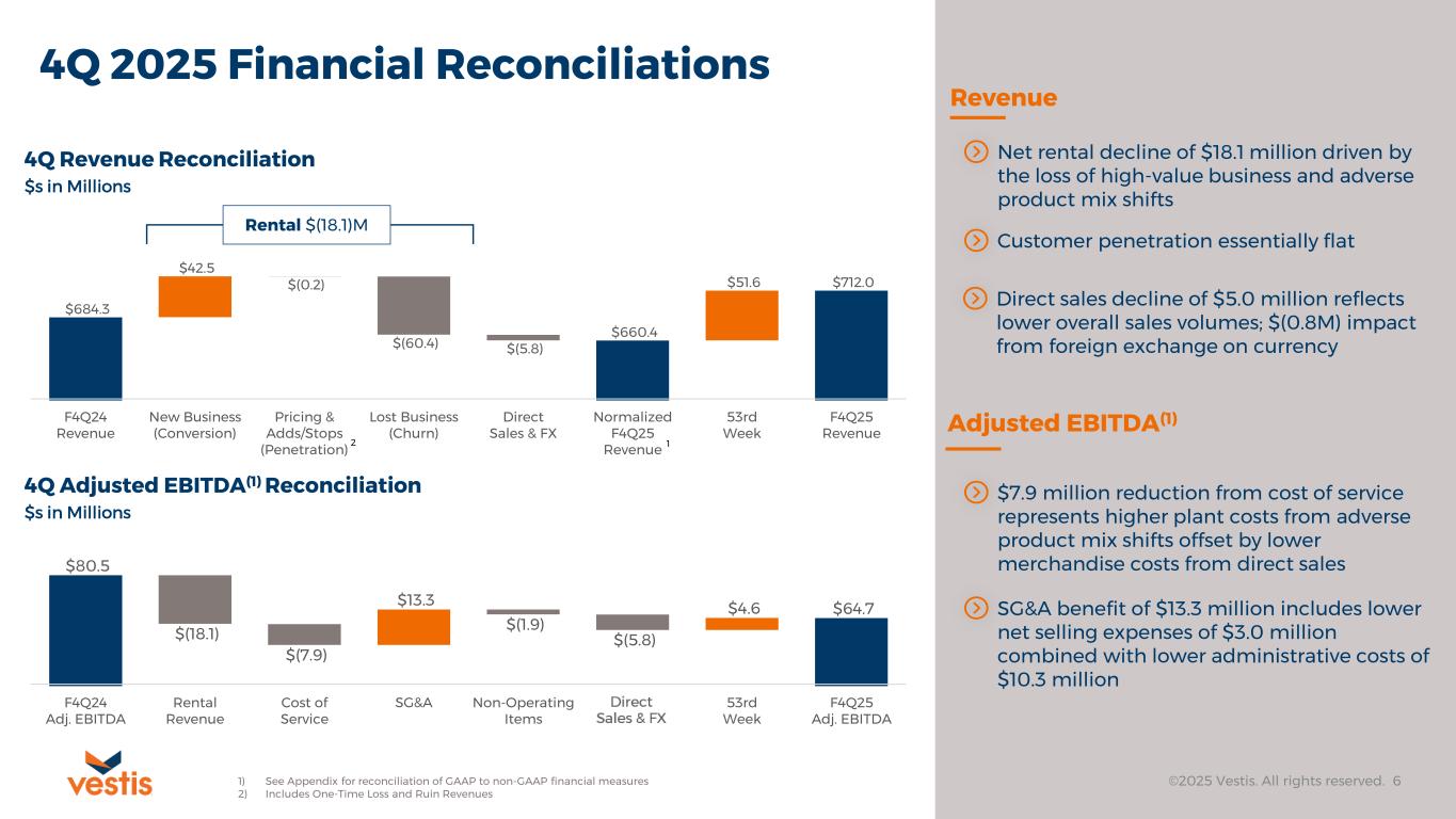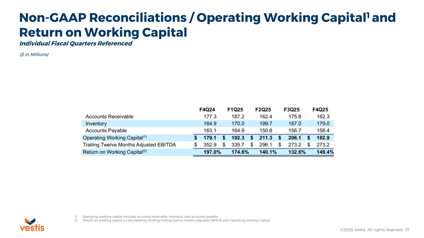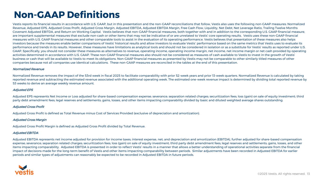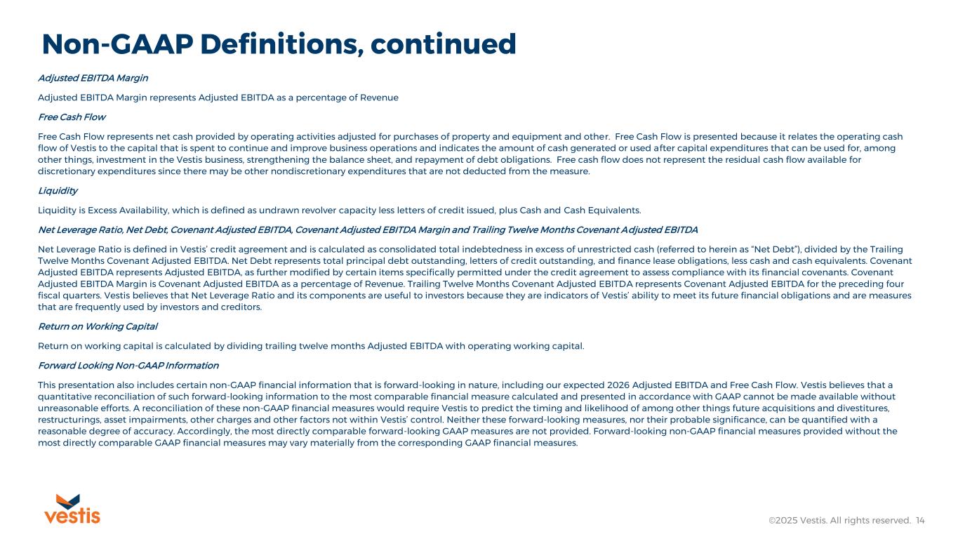 This release also includes certain non-GAAP financial information that is forward-looking in nature, including our expected 2026 Adjusted EBITDA and Free Cash Flow. Vestis believes that a quantitative reconciliation of such forward-looking information to the most comparable financial measure calculated and presented in accordance with GAAP cannot be made available without unreasonable efforts. A reconciliation of these non-GAAP financial measures would require Vestis to predict the timing and likelihood of among other things future acquisitions and divestitures, restructurings, asset impairments, other charges and other factors not within Vestis’ control.