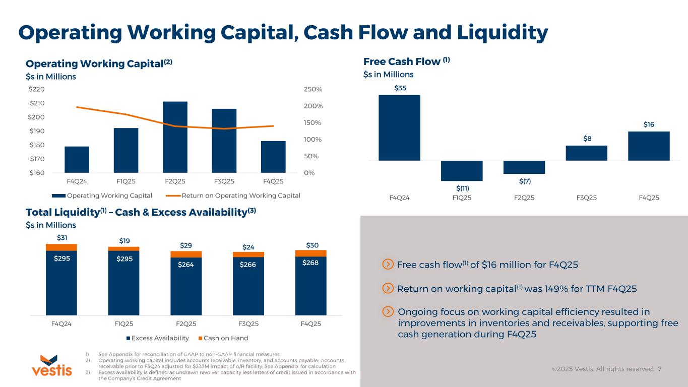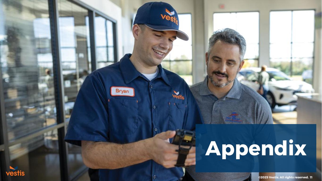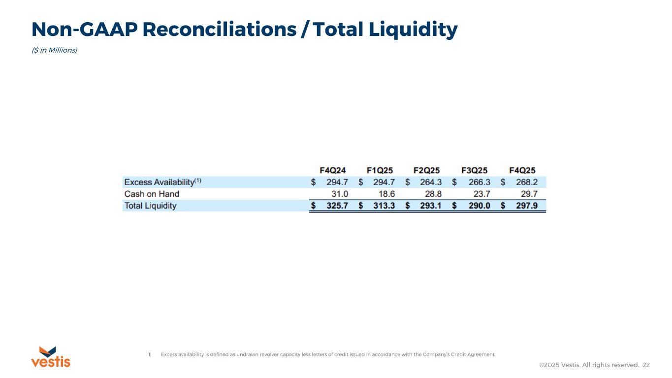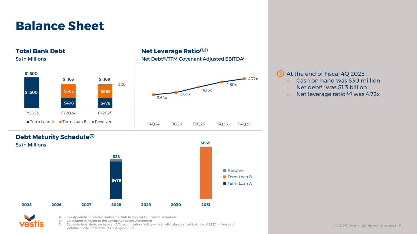 As of October 3, 2025, Vestis had total cash and excess availability under its revolving credit facility of $298 million as compared to $326 million at the end of the fourth quarter of 2024. Total debt outstanding at the end of the fourth quarter was $1.34 billion including principal bank debt outstanding of $1.17 billion.