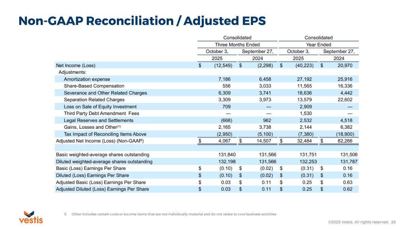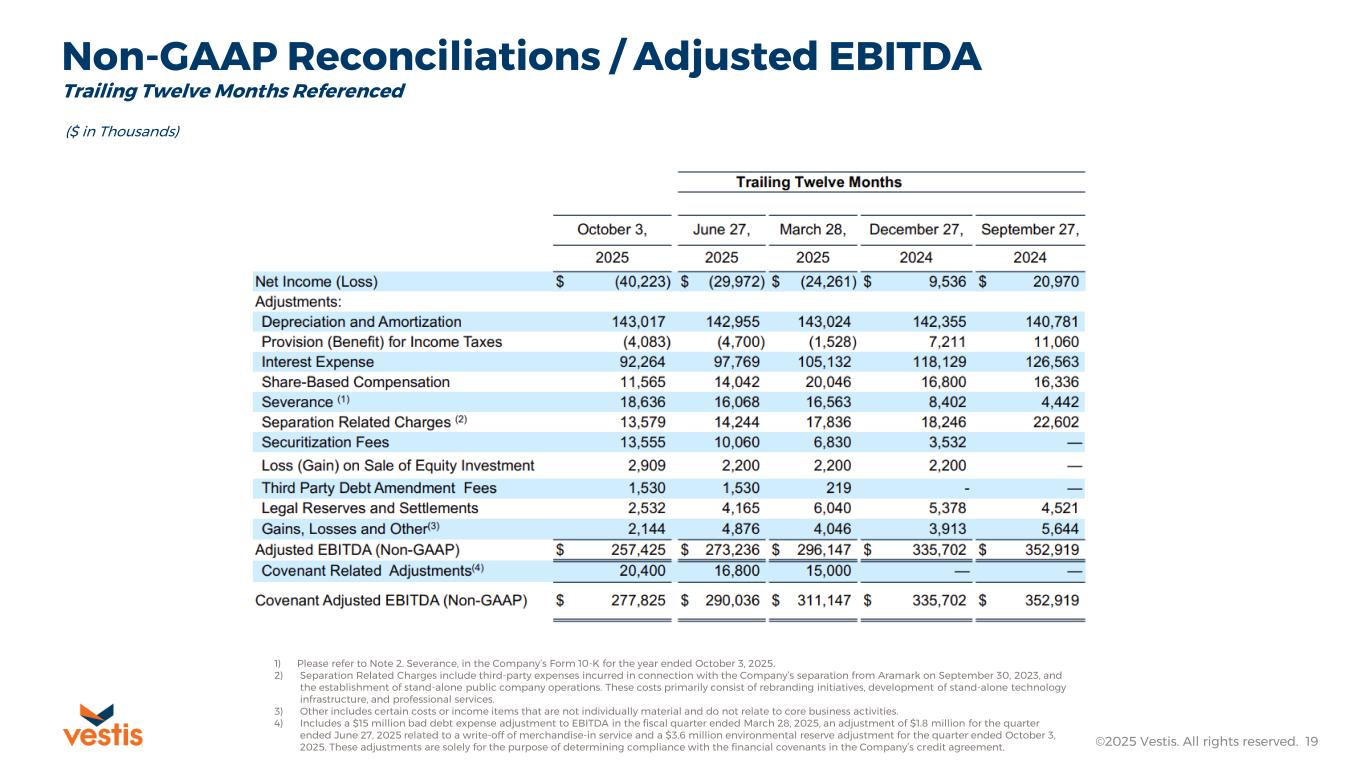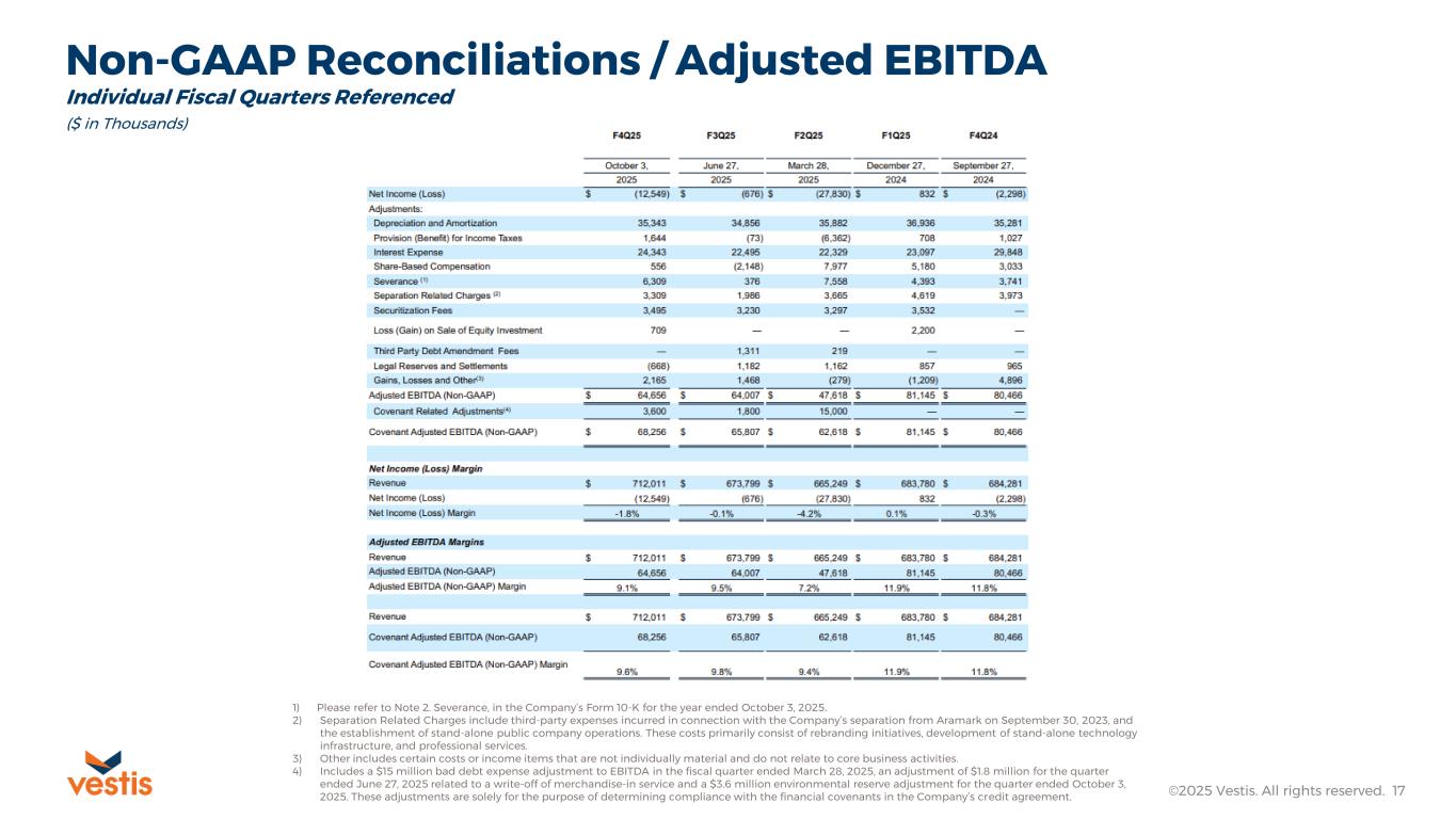 Adjusted EBITDA represents net income (loss) adjusted for provision for income taxes; interest expense, net; and depreciation and amortization (EBITDA), further adjusted for share-based compensation expense; severance; separation related charges; securitization fees; loss (gain) on sale of equity investment; third party debt amendment fees; legal reserves and settlements; gains, losses, and other items impacting comparability. Adjusted EBITDA is presented in order to reflect Vestis’ results in a manner that allows a better understanding of operational activities separate from the financial impact of decisions made for the long-term benefit of Vestis and other items impacting comparability between periods. Similar adjustments have been recorded in Adjusted EBITDA for earlier periods and similar types of adjustments can reasonably be expected to be recorded in Adjusted EBITDA in future periods.