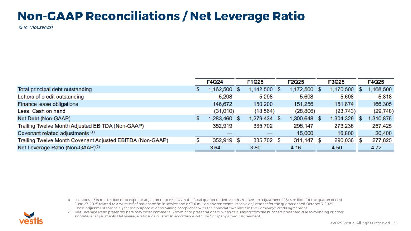 (4) Includes a $15 million bad debt expense adjustment to EBITDA in the fiscal quarter ended March 28, 2025, an adjustment of $1.8 million for the quarter ended June 27, 2025 related to a write-off of merchandise-in-service and a $3.6 million environmental reserve adjustment for the quarter ended October 3, 2025. These adjustments are solely for the purpose of determining compliance with the financial covenants in the Company’s credit agreement.