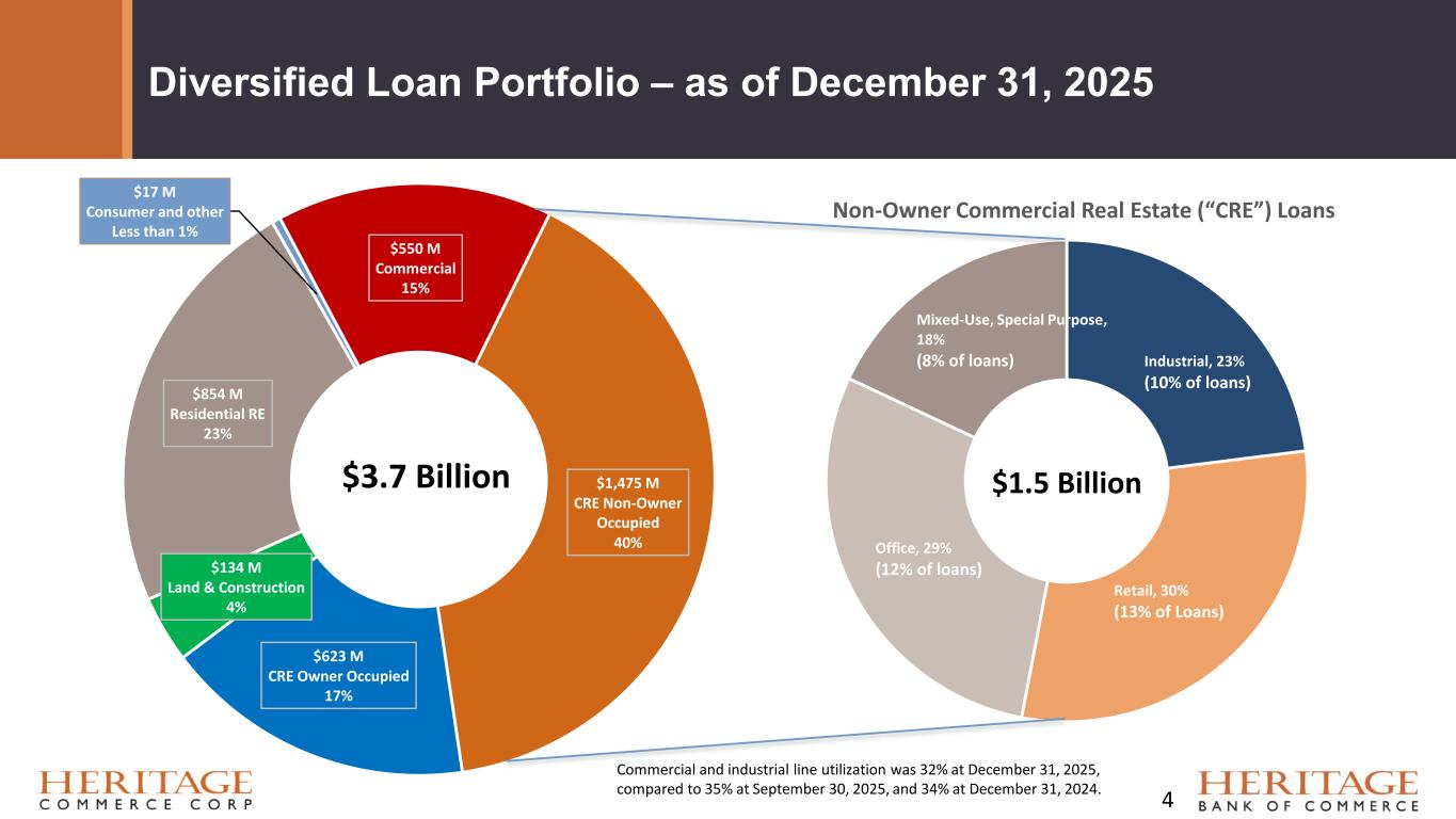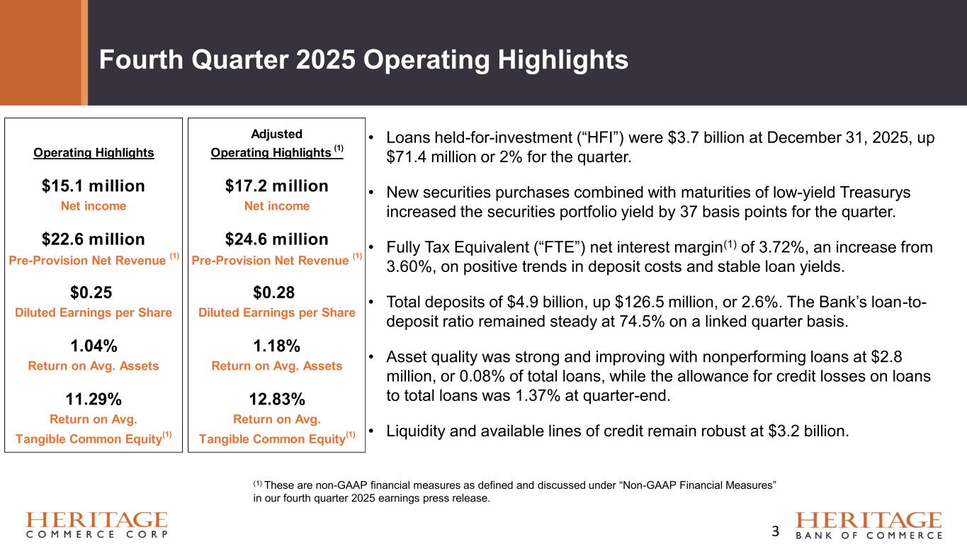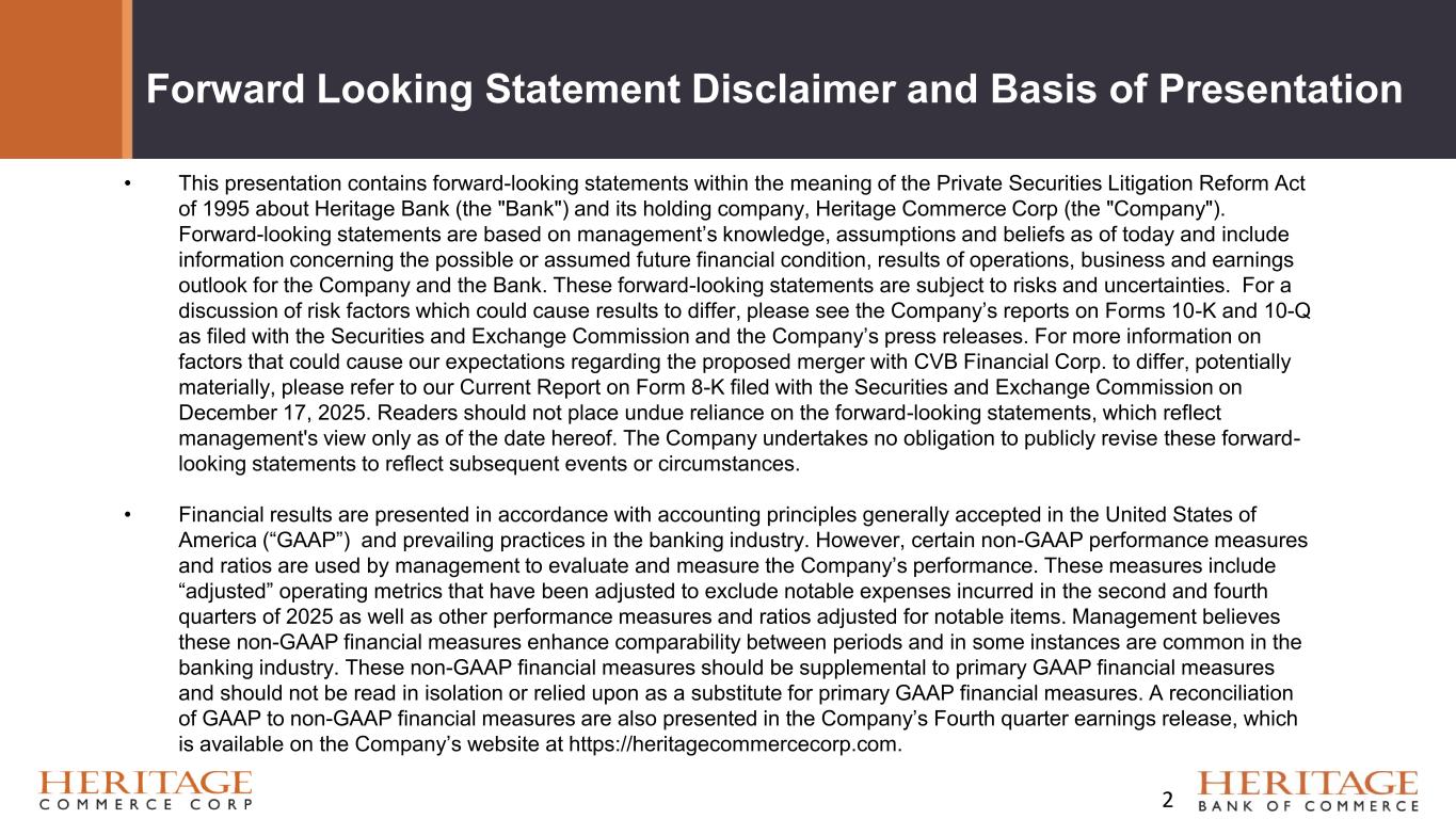 Forward Looking Statement Disclaimer and Basis of Presentation • This presentation contains forward-looking statements within the meaning of the Private Securities Litigation Reform Act of 1995 about Heritage Bank (the "Bank") and its holding company, Heritage Commerce Corp (the "Company"). Forward-looking statements are based on management’s knowledge, assumptions and beliefs as of today and include information concerning the possible or assumed future financial condition, results of operations, business and earnings outlook for the Company and the Bank. These forward-looking statements are subject to risks and uncertainties. For a discussion of risk factors which could cause results to differ, please see the Company’s reports on Forms 10-K and 10-Q as filed with the Securities and Exchange Commission and the Company’s press releases. For more information on factors that could cause our expectations regarding the proposed merger with CVB Financial Corp. to differ, potentially materially, please refer to our Current Report on Form 8-K filed with the Securities and Exchange Commission on December 17, 2025. Readers should not place undue reliance on the forward-looking statements, which reflect management's view only as of the date hereof. The Company undertakes no obligation to publicly revise these forward- looking statements to reflect subsequent events or circumstances. • Financial results are presented in accordance with accounting principles generally accepted in the United States of America (“GAAP”) and prevailing practices in the banking industry. However, certain non-GAAP performance measures and ratios are used by management to evaluate and measure the Company’s performance. These measures include “adjusted” operating metrics that have been adjusted to exclude notable expenses incurred in the second and fourth quarters of 2025 as well as other performance measures and ratios adjusted for notable items. Management believes these non-GAAP financial measures enhance comparability between periods and in some instances are common in the banking industry. These non-GAAP financial measures should be supplemental to primary GAAP financial measures and should not be read in isolation or relied upon as a substitute for primary GAAP financial measures. A reconciliation of GAAP to non-GAAP financial measures are also presented in the Company’s Fourth quarter earnings release, which is available on the Company’s website at https://heritagecommercecorp.com. 2