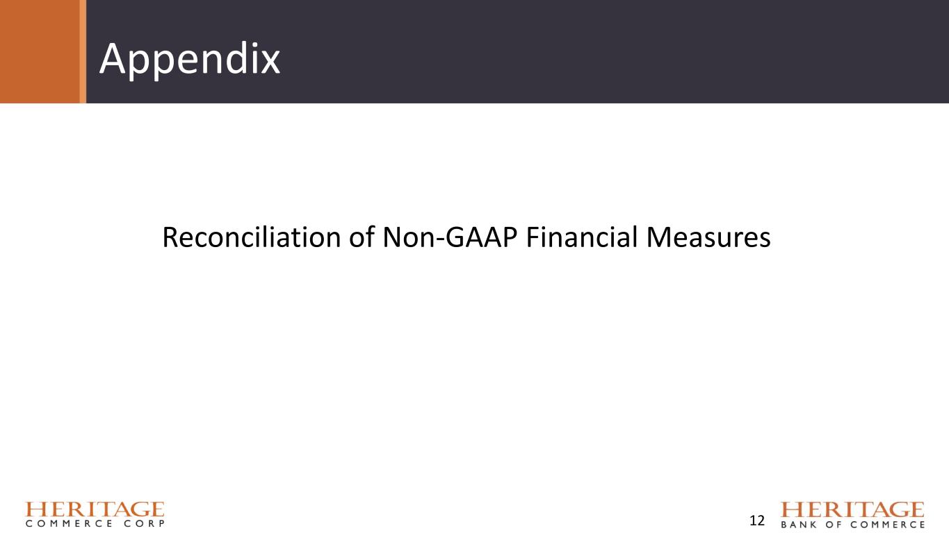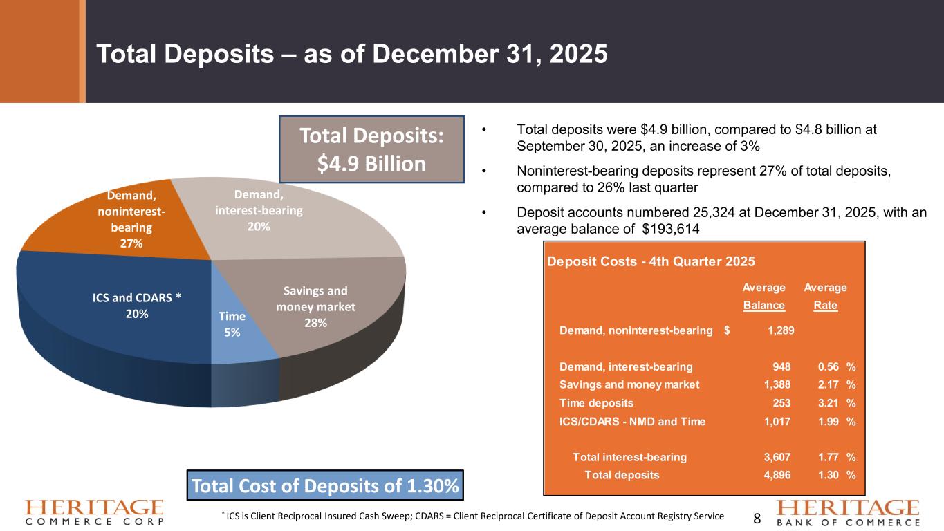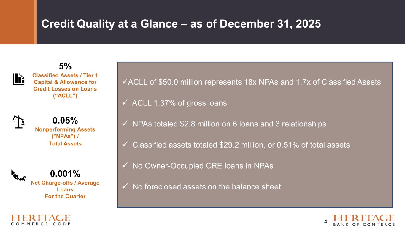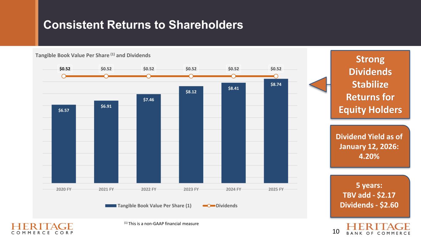 Forward Looking Statement Disclaimer and Basis of Presentation • This presentation contains forward-looking statements within the meaning of the Private Securities Litigation Reform Act of 1995 about Heritage Bank (the "Bank") and its holding company, Heritage Commerce Corp (the "Company"). Forward-looking statements are based on management’s knowledge, assumptions and beliefs as of today and include information concerning the possible or assumed future financial condition, results of operations, business and earnings outlook for the Company and the Bank. These forward-looking statements are subject to risks and uncertainties. For a discussion of risk factors which could cause results to differ, please see the Company’s reports on Forms 10-K and 10-Q as filed with the Securities and Exchange Commission and the Company’s press releases. For more information on factors that could cause our expectations regarding the proposed merger with CVB Financial Corp. to differ, potentially materially, please refer to our Current Report on Form 8-K filed with the Securities and Exchange Commission on December 17, 2025. Readers should not place undue reliance on the forward-looking statements, which reflect management's view only as of the date hereof. The Company undertakes no obligation to publicly revise these forward- looking statements to reflect subsequent events or circumstances. • Financial results are presented in accordance with accounting principles generally accepted in the United States of America (“GAAP”) and prevailing practices in the banking industry. However, certain non-GAAP performance measures and ratios are used by management to evaluate and measure the Company’s performance. These measures include “adjusted” operating metrics that have been adjusted to exclude notable expenses incurred in the second and fourth quarters of 2025 as well as other performance measures and ratios adjusted for notable items. Management believes these non-GAAP financial measures enhance comparability between periods and in some instances are common in the banking industry. These non-GAAP financial measures should be supplemental to primary GAAP financial measures and should not be read in isolation or relied upon as a substitute for primary GAAP financial measures. A reconciliation of GAAP to non-GAAP financial measures are also presented in the Company’s Fourth quarter earnings release, which is available on the Company’s website at https://heritagecommercecorp.com. 2