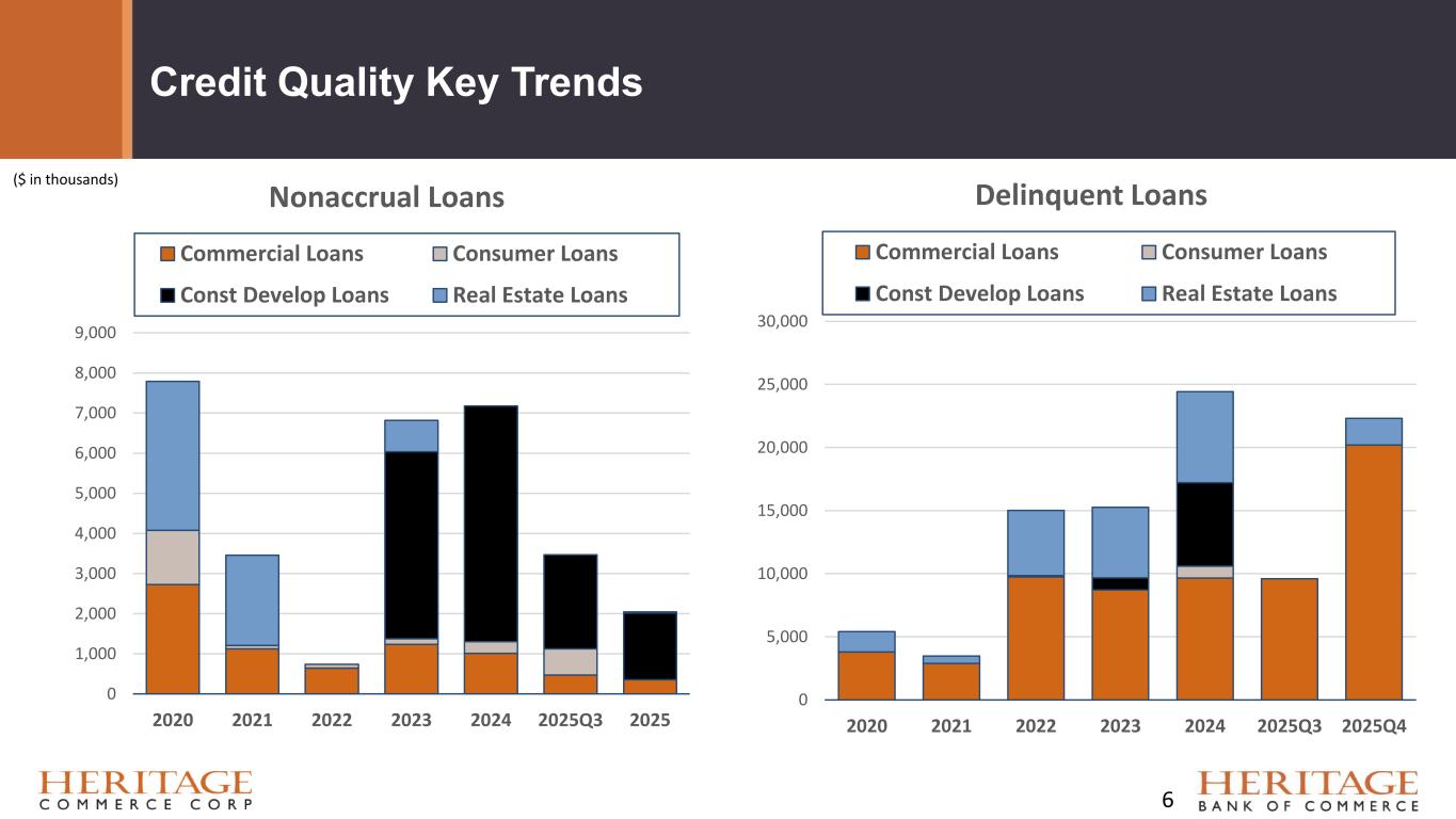 Credit Quality at a Glance – as of December 31, 2025 ✓ACLL of $50.0 million represents 18x NPAs and 1.7x of Classified Assets ✓ ACLL 1.37% of gross loans ✓ NPAs totaled $2.8 million on 6 loans and 3 relationships ✓ Classified assets totaled $29.2 million, or 0.51% of total assets ✓ No Owner-Occupied CRE loans in NPAs ✓ No foreclosed assets on the balance sheet 5% Classified Assets / Tier 1 Capital & Allowance for Credit Losses on Loans (“ACLL”) 0.05% Nonperforming Assets ("NPAs") / Total Assets 0.001% Net Charge-offs / Average Loans For the Quarter 5
