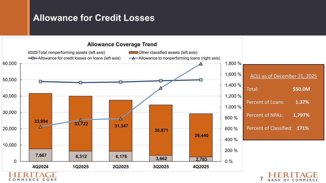 Credit Quality Key Trends ($ in thousands) 6 0 5,000 10,000 15,000 20,000 25,000 30,000 2020 2021 2022 2023 2024 2025Q3 2025Q4 Delinquent Loans Commercial Loans Consumer Loans Const Develop Loans Real Estate Loans 0 1,000 2,000 3,000 4,000 5,000 6,000 7,000 8,000 9,000 2020 2021 2022 2023 2024 2025Q3 2025 Nonaccrual Loans Commercial Loans Consumer Loans Const Develop Loans Real Estate Loans