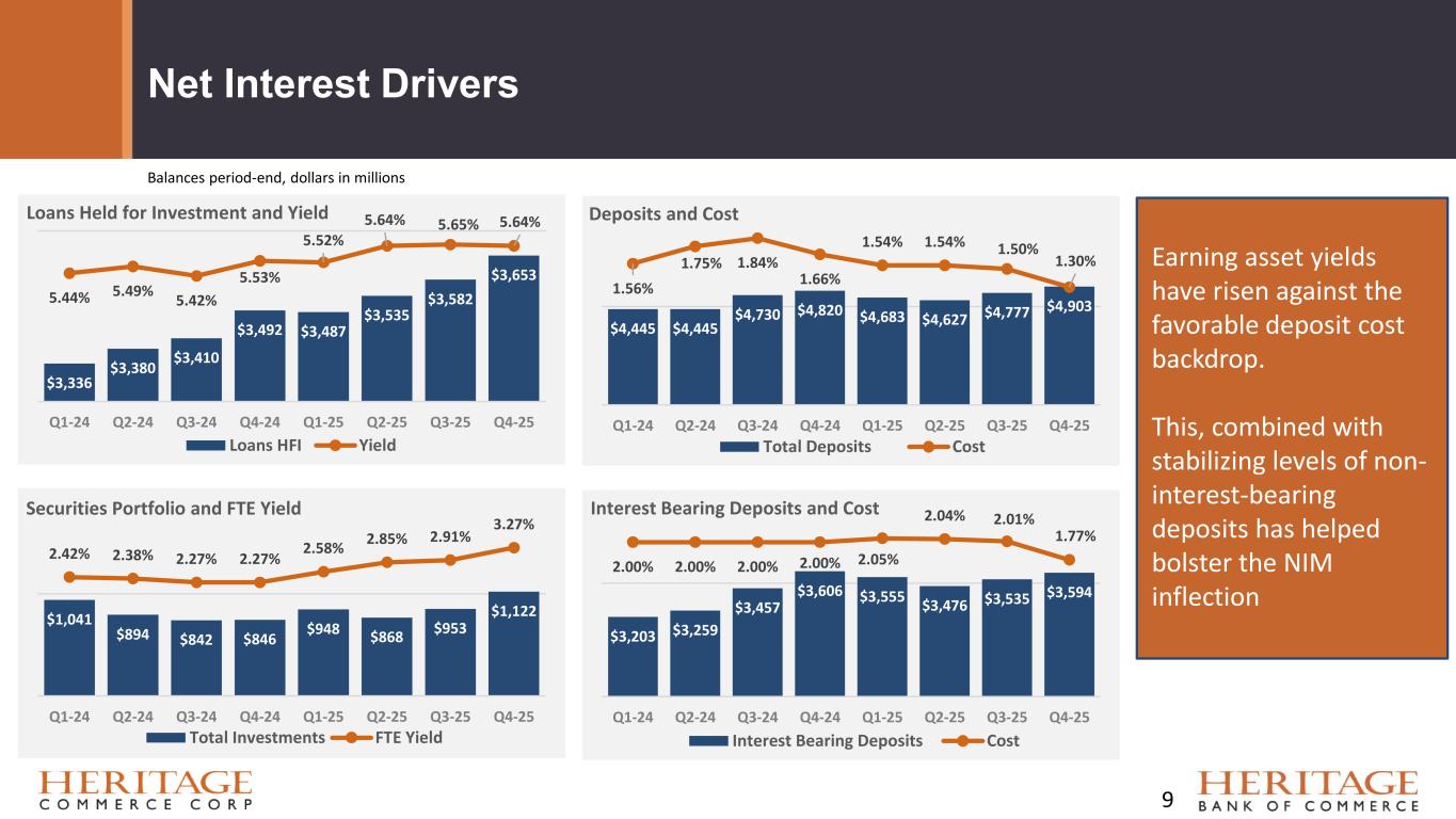 Demand, noninterest- bearing 27% Demand, interest-bearing 20% Savings and money market 28% ICS and CDARS * 20% Time 5% Total Cost of Deposits of 1.30% Total Deposits – as of December 31, 2025 • Total deposits were $4.9 billion, compared to $4.8 billion at September 30, 2025, an increase of 3% • Noninterest-bearing deposits represent 27% of total deposits, compared to 26% last quarter • Deposit accounts numbered 25,324 at December 31, 2025, with an average balance of $193,614 Total Deposits: $4.9 Billion * ICS is Client Reciprocal Insured Cash Sweep; CDARS = Client Reciprocal Certificate of Deposit Account Registry Service 8 Deposit Costs - 4th Quarter 2025 Average Average Balance Rate Demand, noninterest-bearing $ 1,289 Demand, interest-bearing 948 0.56 % Savings and money market 1,388 2.17 % Time deposits 253 3.21 % ICS/CDARS - NMD and Time 1,017 1.99 % Total interest-bearing 3,607 1.77 % Total deposits 4,896 1.30 %