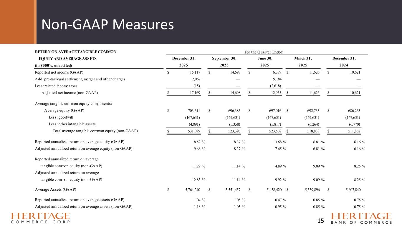 Non-GAAP Measures 14 TANGIBLE BOOK VALUE PER SHARE (in $000’s, unaudited) Capital components: Total equity (GAAP) $ 708,566 $ 700,010 $ 694,704 $ 696,190 $ 689,727 Less: preferred stock — — — — — Total common equity 708,566 700,010 694,704 696,190 689,727 Less: goodwill (167,631) (167,631) (167,631) (167,631) (167,631) Less: other intangible assets (4,625) (5,078) (5,532) (5,986) (6,439) Reported tangible common equity (non-GAAP) 536,310 527,301 521,541 522,573 515,657 Add: pre-tax legal settlement, merger and other charges 11,251 9,184 9,184 — — Less: related income taxes (2,633) (2,618) (2,618) — — Adjusted tangible common equity (non-GAAP) $ 544,928 $ 533,867 $ 528,107 $ 522,573 $ 515,657 Common shares outstanding at period-end 61,368,708 61,277,541 61,446,763 61,611,121 61,348,095 Reported tangible book value per share (non-GAAP) $ 8.74 $ 8.61 $ 8.49 $ 8.48 $ 8.41 Adjusted tangible book value per share (non-GAAP) $ 8.88 $ 8.71 $ 8.59 $ 8.48 $ 8.41 December 31, 2025 2025 September 30, End of Period: June 30, March 31, December 31, 202420252025