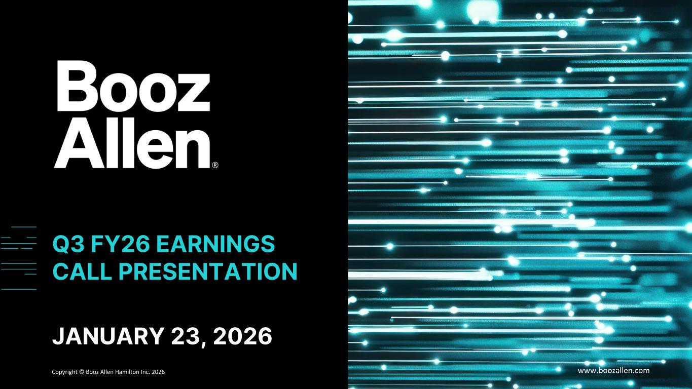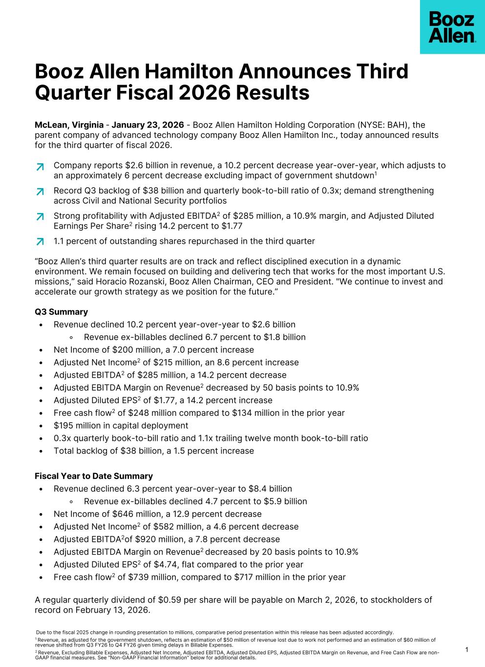 Booz Allen Hamilton Announces Third Quarter Fiscal 2026 Results McLean, Virginia - January 23, 2026 - Booz Allen Hamilton Holding Corporation (NYSE: BAH), the parent company of advanced technology company Booz Allen Hamilton Inc., today announced results for the third quarter of fiscal 2026. Company reports $2.6 billion in revenue, a 10.2 percent decrease year-over-year, which adjusts to an approximately 6 percent decrease excluding impact of government shutdown1 Record Q3 backlog of $38 billion and quarterly book-to-bill ratio of 0.3x; demand strengthening across Civil and National Security portfolios Strong profitability with Adjusted EBITDA2 of $285 million, a 10.9% margin, and Adjusted Diluted Earnings Per Share2 rising 14.2 percent to $1.77 1.1 percent of outstanding shares repurchased in the third quarter “Booz Allen’s third quarter results are on track and reflect disciplined execution in a dynamic environment. We remain focused on building and delivering tech that works for the most important U.S. missions,” said Horacio Rozanski, Booz Allen Chairman, CEO and President. "We continue to invest and accelerate our growth strategy as we position for the future.” Q3 Summary • Revenue declined 10.2 percent year-over-year to $2.6 billion ◦ Revenue ex-billables declined 6.7 percent to $1.8 billion • Net Income of $200 million, a 7.0 percent increase • Adjusted Net Income2 of $215 million, an 8.6 percent increase • Adjusted EBITDA2 of $285 million, a 14.2 percent decrease • Adjusted EBITDA Margin on Revenue2 decreased by 50 basis points to 10.9% • Adjusted Diluted EPS2 of $1.77, a 14.2 percent increase • Free cash flow2 of $248 million compared to $134 million in the prior year • $195 million in capital deployment • 0.3x quarterly book-to-bill ratio and 1.1x trailing twelve month book-to-bill ratio • Total backlog of $38 billion, a 1.5 percent increase Fiscal Year to Date Summary • Revenue declined 6.3 percent year-over-year to $8.4 billion ◦ Revenue ex-billables declined 4.7 percent to $5.9 billion • Net Income of $646 million, a 12.9 percent decrease • Adjusted Net Income2 of $582 million, a 4.6 percent decrease • Adjusted EBITDA2of $920 million, a 7.8 percent decrease • Adjusted EBITDA Margin on Revenue2 decreased by 20 basis points to 10.9% • Adjusted Diluted EPS2 of $4.74, flat compared to the prior year • Free cash flow2 of $739 million, compared to $717 million in the prior year A regular quarterly dividend of $0.59 per share will be payable on March 2, 2026, to stockholders of record on February 13, 2026. 1 Due to the fiscal 2025 change in rounding presentation to millions, comparative period presentation within this release has been adjusted accordingly. 1 Revenue, as adjusted for the government shutdown, reflects an estimation of $50 million of revenue lost due to work not performed and an estimation of $60 million of revenue shifted from Q3 FY26 to Q4 FY26 given timing delays in Billable Expenses. 2 Revenue, Excluding Billable Expenses, Adjusted Net Income, Adjusted EBITDA, Adjusted Diluted EPS, Adjusted EBITDA Margin on Revenue, and Free Cash Flow are non- GAAP financial measures. See "Non-GAAP Financial Information" below for additional details.