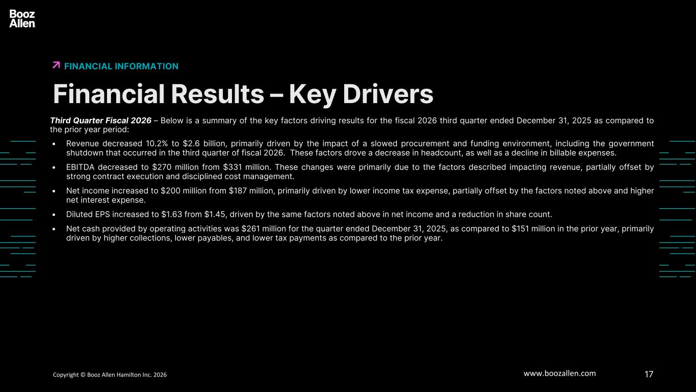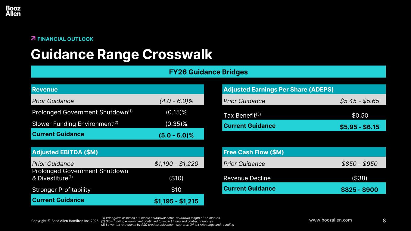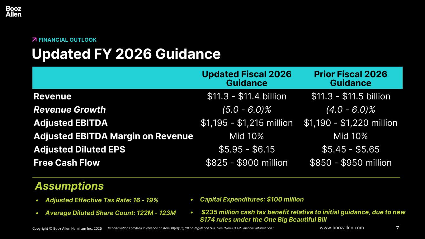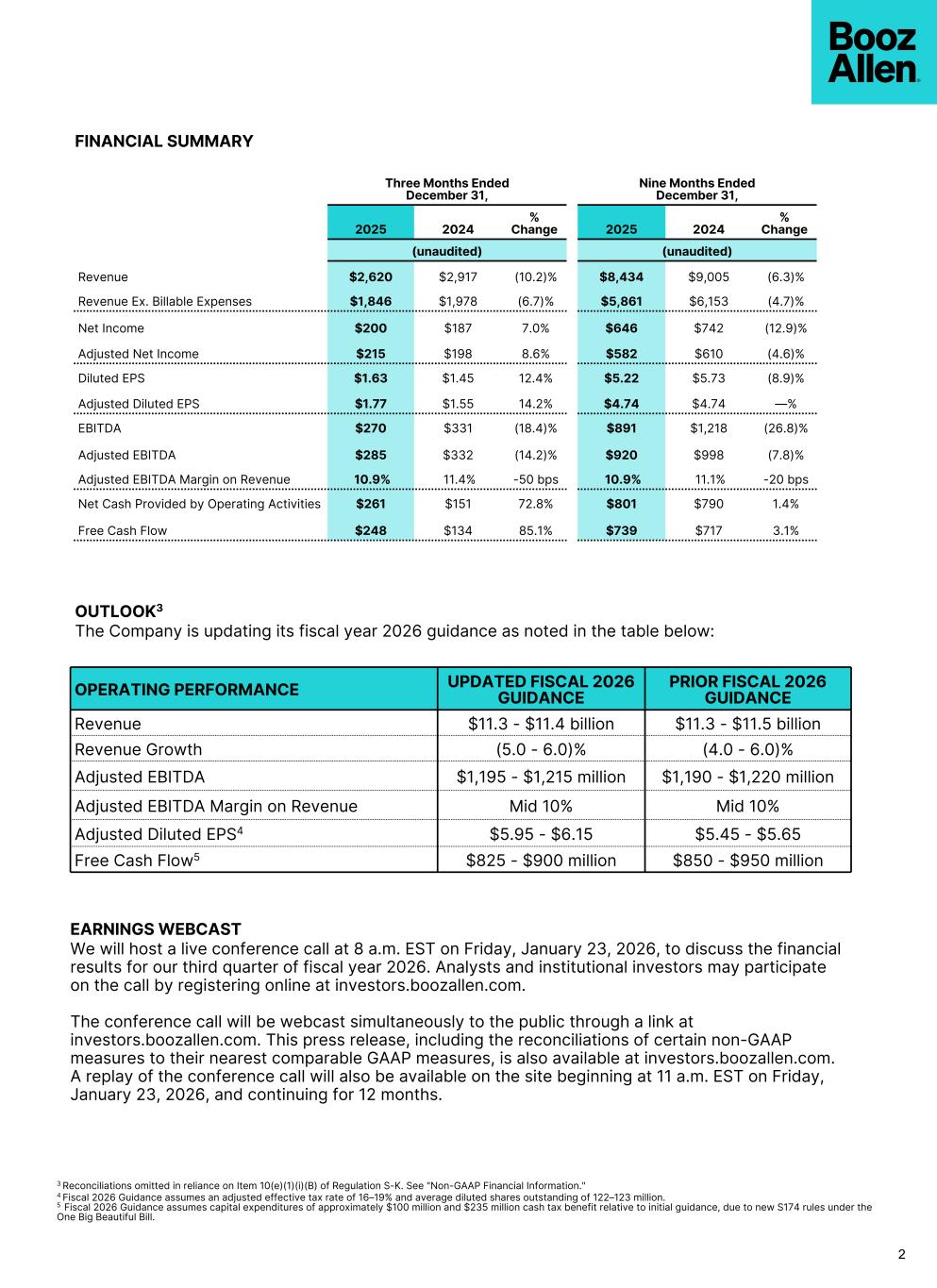 2 Three Months Ended December 31, Nine Months Ended December 31, 2025 2024 % Change 2025 2024 % Change (unaudited) (unaudited) Revenue $2,620 $2,917 (10.2)% $8,434 $9,005 (6.3)% Revenue Ex. Billable Expenses $1,846 $1,978 (6.7)% $5,861 $6,153 (4.7)% Net Income $200 $187 7.0% $646 $742 (12.9)% Adjusted Net Income $215 $198 8.6% $582 $610 (4.6)% Diluted EPS $1.63 $1.45 12.4% $5.22 $5.73 (8.9)% Adjusted Diluted EPS $1.77 $1.55 14.2% $4.74 $4.74 —% EBITDA $270 $331 (18.4)% $891 $1,218 (26.8)% Adjusted EBITDA $285 $332 (14.2)% $920 $998 (7.8)% Adjusted EBITDA Margin on Revenue 10.9% 11.4% -50 bps 10.9% 11.1% -20 bps Net Cash Provided by Operating Activities $261 $151 72.8% $801 $790 1.4% Free Cash Flow $248 $134 85.1% $739 $717 3.1% FINANCIAL SUMMARY 3 Reconciliations omitted in reliance on Item 10(e)(1)(i)(B) of Regulation S-K. See "Non-GAAP Financial Information." 4 Fiscal 2026 Guidance assumes an adjusted effective tax rate of 16–19% and average diluted shares outstanding of 122–123 million. 5 Fiscal 2026 Guidance assumes capital expenditures of approximately $100 million and $235 million cash tax benefit relative to initial guidance, due to new S174 rules under the One Big Beautiful Bill. OPERATING PERFORMANCE UPDATED FISCAL 2026 GUIDANCE PRIOR FISCAL 2026 GUIDANCE Revenue $11.3 - $11.4 billion $11.3 - $11.5 billion Revenue Growth (5.0 - 6.0)% (4.0 - 6.0)% Adjusted EBITDA $1,195 - $1,215 million $1,190 - $1,220 million Adjusted EBITDA Margin on Revenue Mid 10% Mid 10% Adjusted Diluted EPS4 $5.95 - $6.15 $5.45 - $5.65 Free Cash Flow5 $825 - $900 million $850 - $950 million EARNINGS WEBCAST We will host a live conference call at 8 a.m. EST on Friday, January 23, 2026, to discuss the financial results for our third quarter of fiscal year 2026. Analysts and institutional investors may participate on the call by registering online at investors.boozallen.com. The conference call will be webcast simultaneously to the public through a link at investors.boozallen.com. This press release, including the reconciliations of certain non-GAAP measures to their nearest comparable GAAP measures, is also available at investors.boozallen.com. A replay of the conference call will also be available on the site beginning at 11 a.m. EST on Friday, January 23, 2026, and continuing for 12 months. OUTLOOK3 The Company is updating its fiscal year 2026 guidance as noted in the table below:
