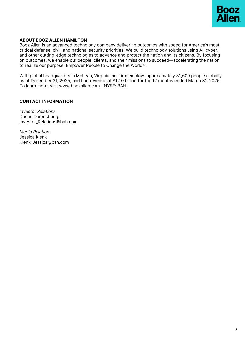 3 ABOUT BOOZ ALLEN HAMILTON Booz Allen is an advanced technology company delivering outcomes with speed for America’s most critical defense, civil, and national security priorities. We build technology solutions using AI, cyber, and other cutting-edge technologies to advance and protect the nation and its citizens. By focusing on outcomes, we enable our people, clients, and their missions to succeed—accelerating the nation to realize our purpose: Empower People to Change the World®. With global headquarters in McLean, Virginia, our firm employs approximately 31,600 people globally as of December 31, 2025, and had revenue of $12.0 billion for the 12 months ended March 31, 2025. To learn more, visit www.boozallen.com. (NYSE: BAH) CONTACT INFORMATION Investor Relations Dustin Darensbourg Investor_Relations@bah.com Media Relations Jessica Klenk Klenk_Jessica@bah.com