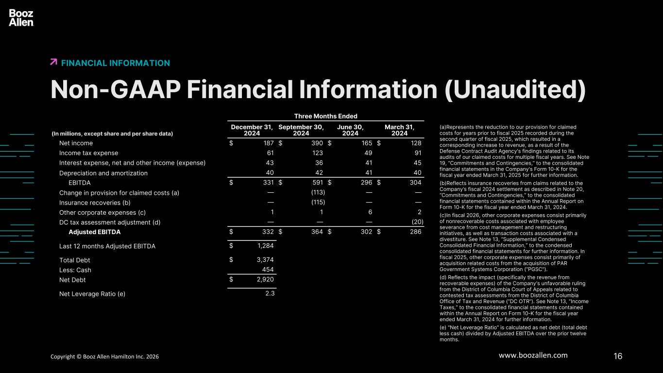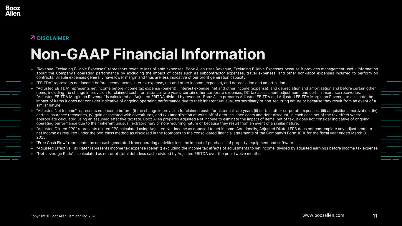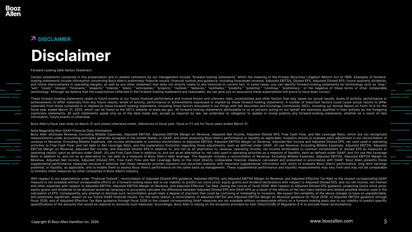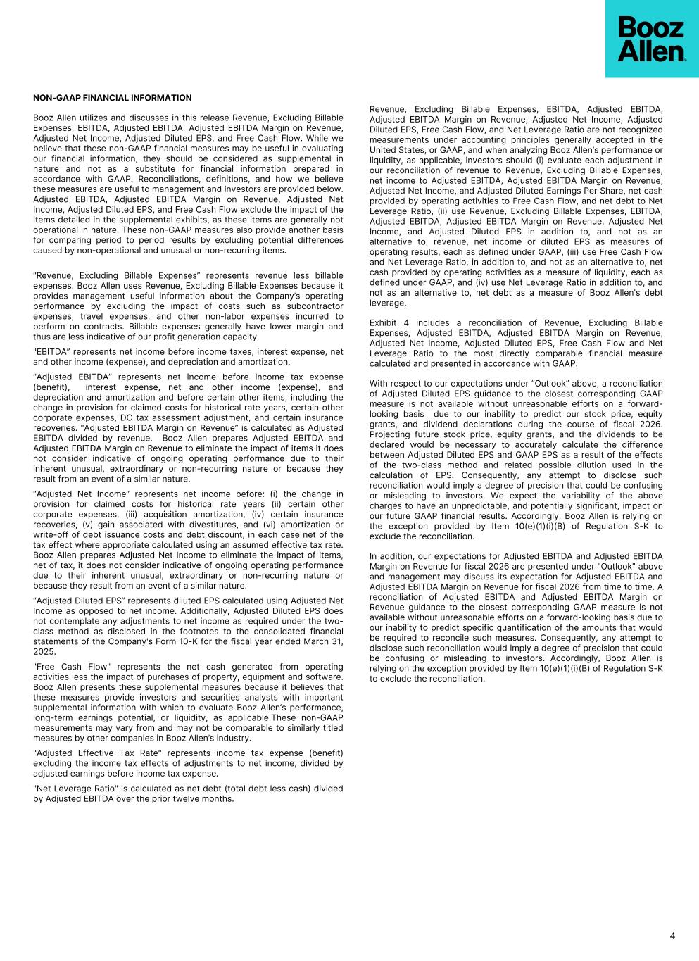 NON-GAAP FINANCIAL INFORMATION Booz Allen utilizes and discusses in this release Revenue, Excluding Billable Expenses, EBITDA, Adjusted EBITDA, Adjusted EBITDA Margin on Revenue, Adjusted Net Income, Adjusted Diluted EPS, and Free Cash Flow. While we believe that these non-GAAP financial measures may be useful in evaluating our financial information, they should be considered as supplemental in nature and not as a substitute for financial information prepared in accordance with GAAP. Reconciliations, definitions, and how we believe these measures are useful to management and investors are provided below. Adjusted EBITDA, Adjusted EBITDA Margin on Revenue, Adjusted Net Income, Adjusted Diluted EPS, and Free Cash Flow exclude the impact of the items detailed in the supplemental exhibits, as these items are generally not operational in nature. These non-GAAP measures also provide another basis for comparing period to period results by excluding potential differences caused by non-operational and unusual or non-recurring items. “Revenue, Excluding Billable Expenses” represents revenue less billable expenses. Booz Allen uses Revenue, Excluding Billable Expenses because it provides management useful information about the Company’s operating performance by excluding the impact of costs such as subcontractor expenses, travel expenses, and other non-labor expenses incurred to perform on contracts. Billable expenses generally have lower margin and thus are less indicative of our profit generation capacity. "EBITDA” represents net income before income taxes, interest expense, net and other income (expense), and depreciation and amortization. “Adjusted EBITDA” represents net income before income tax expense (benefit), interest expense, net and other income (expense), and depreciation and amortization and before certain other items, including the change in provision for claimed costs for historical rate years, certain other corporate expenses, DC tax assessment adjustment, and certain insurance recoveries. “Adjusted EBITDA Margin on Revenue” is calculated as Adjusted EBITDA divided by revenue. Booz Allen prepares Adjusted EBITDA and Adjusted EBITDA Margin on Revenue to eliminate the impact of items it does not consider indicative of ongoing operating performance due to their inherent unusual, extraordinary or non-recurring nature or because they result from an event of a similar nature. “Adjusted Net Income” represents net income before: (i) the change in provision for claimed costs for historical rate years (ii) certain other corporate expenses, (iii) acquisition amortization, (iv) certain insurance recoveries, (v) gain associated with divestitures, and (vi) amortization or write-off of debt issuance costs and debt discount, in each case net of the tax effect where appropriate calculated using an assumed effective tax rate. Booz Allen prepares Adjusted Net Income to eliminate the impact of items, net of tax, it does not consider indicative of ongoing operating performance due to their inherent unusual, extraordinary or non-recurring nature or because they result from an event of a similar nature. “Adjusted Diluted EPS” represents diluted EPS calculated using Adjusted Net Income as opposed to net income. Additionally, Adjusted Diluted EPS does not contemplate any adjustments to net income as required under the two- class method as disclosed in the footnotes to the consolidated financial statements of the Company's Form 10-K for the fiscal year ended March 31, 2025. "Free Cash Flow" represents the net cash generated from operating activities less the impact of purchases of property, equipment and software. Booz Allen presents these supplemental measures because it believes that these measures provide investors and securities analysts with important supplemental information with which to evaluate Booz Allen’s performance, long-term earnings potential, or liquidity, as applicable.These non-GAAP measurements may vary from and may not be comparable to similarly titled measures by other companies in Booz Allen’s industry. "Adjusted Effective Tax Rate" represents income tax expense (benefit) excluding the income tax effects of adjustments to net income, divided by adjusted earnings before income tax expense. "Net Leverage Ratio" is calculated as net debt (total debt less cash) divided by Adjusted EBITDA over the prior twelve months. Revenue, Excluding Billable Expenses, EBITDA, Adjusted EBITDA, Adjusted EBITDA Margin on Revenue, Adjusted Net Income, Adjusted Diluted EPS, Free Cash Flow, and Net Leverage Ratio are not recognized measurements under accounting principles generally accepted in the United States, or GAAP, and when analyzing Booz Allen’s performance or liquidity, as applicable, investors should (i) evaluate each adjustment in our reconciliation of revenue to Revenue, Excluding Billable Expenses, net income to Adjusted EBITDA, Adjusted EBITDA Margin on Revenue, Adjusted Net Income, and Adjusted Diluted Earnings Per Share, net cash provided by operating activities to Free Cash Flow, and net debt to Net Leverage Ratio, (ii) use Revenue, Excluding Billable Expenses, EBITDA, Adjusted EBITDA, Adjusted EBITDA Margin on Revenue, Adjusted Net Income, and Adjusted Diluted EPS in addition to, and not as an alternative to, revenue, net income or diluted EPS as measures of operating results, each as defined under GAAP, (iii) use Free Cash Flow and Net Leverage Ratio, in addition to, and not as an alternative to, net cash provided by operating activities as a measure of liquidity, each as defined under GAAP, and (iv) use Net Leverage Ratio in addition to, and not as an alternative to, net debt as a measure of Booz Allen's debt leverage. Exhibit 4 includes a reconciliation of Revenue, Excluding Billable Expenses, Adjusted EBITDA, Adjusted EBITDA Margin on Revenue, Adjusted Net Income, Adjusted Diluted EPS, Free Cash Flow and Net Leverage Ratio to the most directly comparable financ