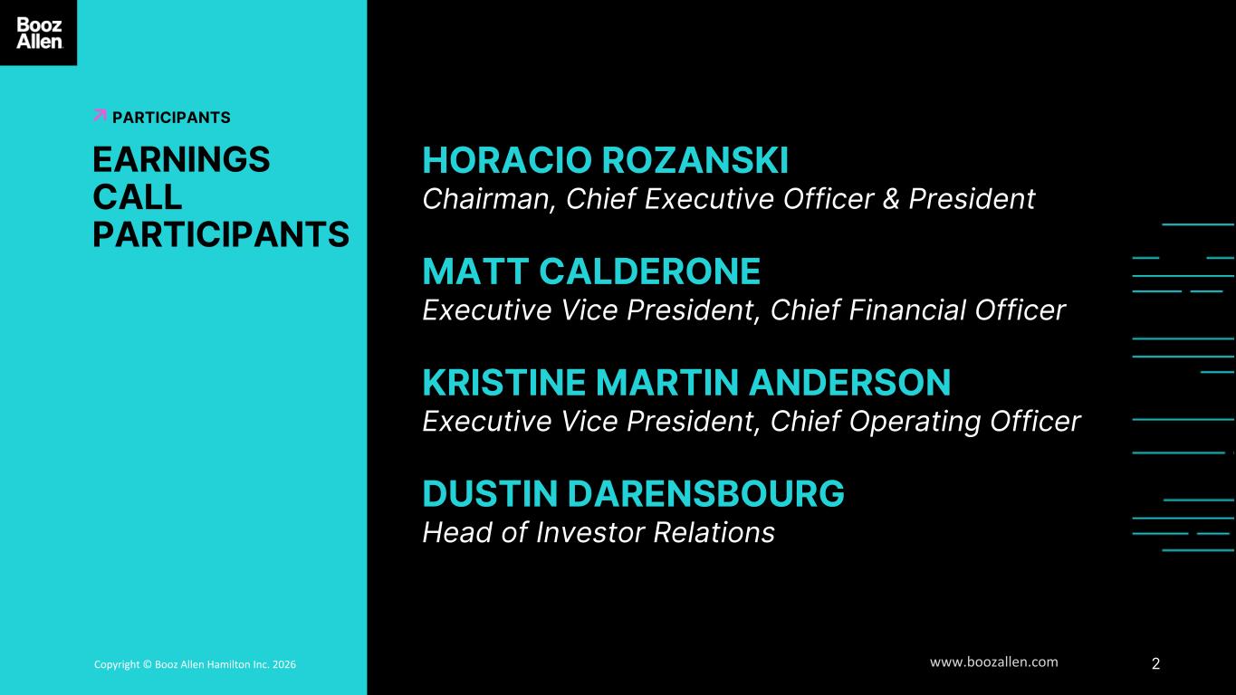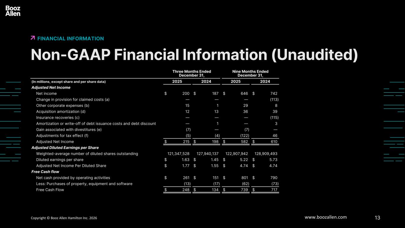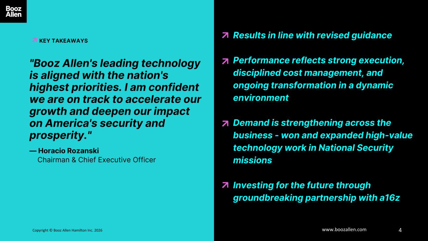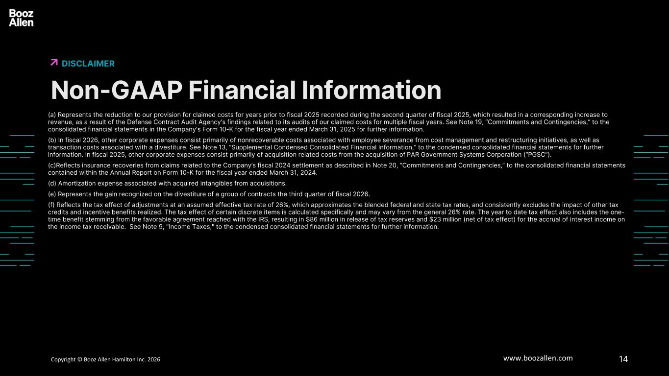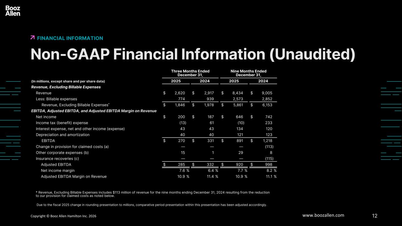 NON-GAAP FINANCIAL INFORMATION Booz Allen utilizes and discusses in this release Revenue, Excluding Billable Expenses, EBITDA, Adjusted EBITDA, Adjusted EBITDA Margin on Revenue, Adjusted Net Income, Adjusted Diluted EPS, and Free Cash Flow. While we believe that these non-GAAP financial measures may be useful in evaluating our financial information, they should be considered as supplemental in nature and not as a substitute for financial information prepared in accordance with GAAP. Reconciliations, definitions, and how we believe these measures are useful to management and investors are provided below. Adjusted EBITDA, Adjusted EBITDA Margin on Revenue, Adjusted Net Income, Adjusted Diluted EPS, and Free Cash Flow exclude the impact of the items detailed in the supplemental exhibits, as these items are generally not operational in nature. These non-GAAP measures also provide another basis for comparing period to period results by excluding potential differences caused by non-operational and unusual or non-recurring items. “Revenue, Excluding Billable Expenses” represents revenue less billable expenses. Booz Allen uses Revenue, Excluding Billable Expenses because it provides management useful information about the Company’s operating performance by excluding the impact of costs such as subcontractor expenses, travel expenses, and other non-labor expenses incurred to perform on contracts. Billable expenses generally have lower margin and thus are less indicative of our profit generation capacity. "EBITDA” represents net income before income taxes, interest expense, net and other income (expense), and depreciation and amortization. “Adjusted EBITDA” represents net income before income tax expense (benefit), interest expense, net and other income (expense), and depreciation and amortization and before certain other items, including the change in provision for claimed costs for historical rate years, certain other corporate expenses, DC tax assessment adjustment, and certain insurance recoveries. “Adjusted EBITDA Margin on Revenue” is calculated as Adjusted EBITDA divided by revenue. Booz Allen prepares Adjusted EBITDA and Adjusted EBITDA Margin on Revenue to eliminate the impact of items it does not consider indicative of ongoing operating performance due to their inherent unusual, extraordinary or non-recurring nature or because they result from an event of a similar nature. “Adjusted Net Income” represents net income before: (i) the change in provision for claimed costs for historical rate years (ii) certain other corporate expenses, (iii) acquisition amortization, (iv) certain insurance recoveries, (v) gain associated with divestitures, and (vi) amortization or write-off of debt issuance costs and debt discount, in each case net of the tax effect where appropriate calculated using an assumed effective tax rate. Booz Allen prepares Adjusted Net Income to eliminate the impact of items, net of tax, it does not consider indicative of ongoing operating performance due to their inherent unusual, extraordinary or non-recurring nature or because they result from an event of a similar nature. “Adjusted Diluted EPS” represents diluted EPS calculated using Adjusted Net Income as opposed to net income. Additionally, Adjusted Diluted EPS does not contemplate any adjustments to net income as required under the two- class method as disclosed in the footnotes to the consolidated financial statements of the Company's Form 10-K for the fiscal year ended March 31, 2025. "Free Cash Flow" represents the net cash generated from operating activities less the impact of purchases of property, equipment and software. Booz Allen presents these supplemental measures because it believes that these measures provide investors and securities analysts with important supplemental information with which to evaluate Booz Allen’s performance, long-term earnings potential, or liquidity, as applicable.These non-GAAP measurements may vary from and may not be comparable to similarly titled measures by other companies in Booz Allen’s industry. "Adjusted Effective Tax Rate" represents income tax expense (benefit) excluding the income tax effects of adjustments to net income, divided by adjusted earnings before income tax expense. "Net Leverage Ratio" is calculated as net debt (total debt less cash) divided by Adjusted EBITDA over the prior twelve months. Revenue, Excluding Billable Expenses, EBITDA, Adjusted EBITDA, Adjusted EBITDA Margin on Revenue, Adjusted Net Income, Adjusted Diluted EPS, Free Cash Flow, and Net Leverage Ratio are not recognized measurements under accounting principles generally accepted in the United States, or GAAP, and when analyzing Booz Allen’s performance or liquidity, as applicable, investors should (i) evaluate each adjustment in our reconciliation of revenue to Revenue, Excluding Billable Expenses, net income to Adjusted EBITDA, Adjusted EBITDA Margin on Revenue, Adjusted Net Income, and Adjusted Diluted Earnings Per Share, net cash provided by operating activities to Free Cash Flow, and net debt to Net Leverage Ratio, (ii) use Revenue, Excluding Billable Expenses, EBITDA, Adjusted EBITDA, Adjusted EBITDA Margin on Revenue, Adjusted Net Income, and Adjusted Diluted EPS in addition to, and not as an alternative to, revenue, net income or diluted EPS as measures of operating results, each as defined under GAAP, (iii) use Free Cash Flow and Net Leverage Ratio, in addition to, and not as an alternative to, net cash provided by operating activities as a measure of liquidity, each as defined under GAAP, and (iv) use Net Leverage Ratio in addition to, and not as an alternative to, net debt as a measure of Booz Allen's debt leverage. Exhibit 4 includes a reconciliation of Revenue, Excluding Billable Expenses, Adjusted EBITDA, Adjusted EBITDA Margin on Revenue, Adjusted Net Income, Adjusted Diluted EPS, Free Cash Flow and Net Leverage Ratio to the most directly comparable financ
