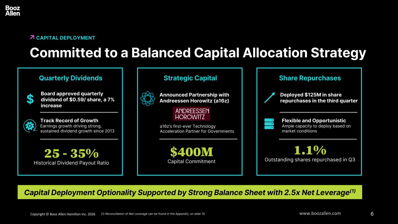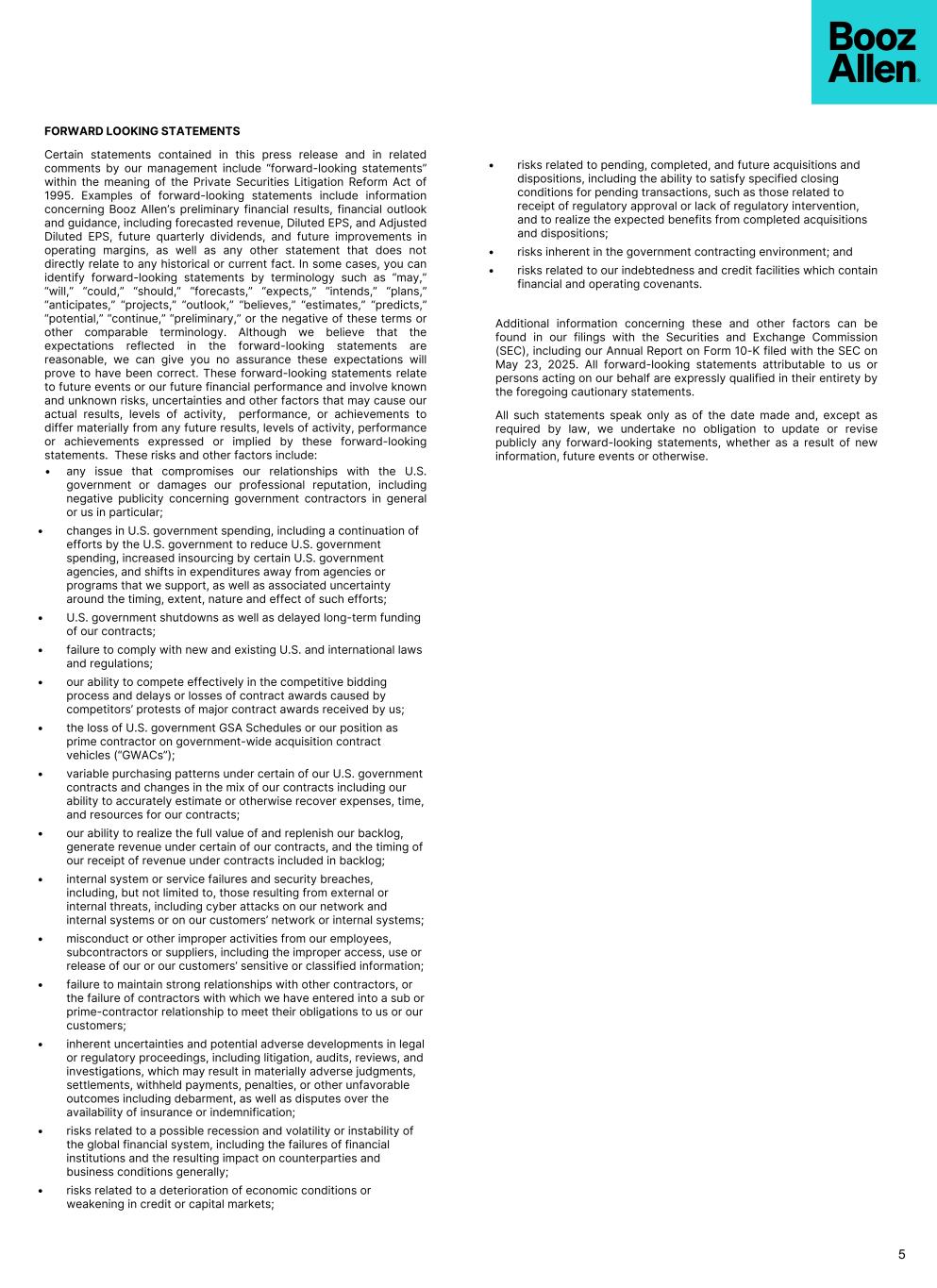 FORWARD LOOKING STATEMENTS Certain statements contained in this press release and in related comments by our management include “forward-looking statements” within the meaning of the Private Securities Litigation Reform Act of 1995. Examples of forward-looking statements include information concerning Booz Allen’s preliminary financial results, financial outlook and guidance, including forecasted revenue, Diluted EPS, and Adjusted Diluted EPS, future quarterly dividends, and future improvements in operating margins, as well as any other statement that does not directly relate to any historical or current fact. In some cases, you can identify forward-looking statements by terminology such as “may,” “will,” “could,” “should,” “forecasts,” “expects,” “intends,” “plans,” “anticipates,” “projects,” “outlook,” “believes,” “estimates,” “predicts,” “potential,” “continue,” “preliminary,” or the negative of these terms or other comparable terminology. Although we believe that the expectations reflected in the forward-looking statements are reasonable, we can give you no assurance these expectations will prove to have been correct. These forward-looking statements relate to future events or our future financial performance and involve known and unknown risks, uncertainties and other factors that may cause our actual results, levels of activity, performance, or achievements to differ materially from any future results, levels of activity, performance or achievements expressed or implied by these forward-looking statements. These risks and other factors include: • any issue that compromises our relationships with the U.S. government or damages our professional reputation, including negative publicity concerning government contractors in general or us in particular; • changes in U.S. government spending, including a continuation of efforts by the U.S. government to reduce U.S. government spending, increased insourcing by certain U.S. government agencies, and shifts in expenditures away from agencies or programs that we support, as well as associated uncertainty around the timing, extent, nature and effect of such efforts; • U.S. government shutdowns as well as delayed long-term funding of our contracts; • failure to comply with new and existing U.S. and international laws and regulations; • our ability to compete effectively in the competitive bidding process and delays or losses of contract awards caused by competitors’ protests of major contract awards received by us; • the loss of U.S. government GSA Schedules or our position as prime contractor on government-wide acquisition contract vehicles (“GWACs”); • variable purchasing patterns under certain of our U.S. government contracts and changes in the mix of our contracts including our ability to accurately estimate or otherwise recover expenses, time, and resources for our contracts; • our ability to realize the full value of and replenish our backlog, generate revenue under certain of our contracts, and the timing of our receipt of revenue under contracts included in backlog; • internal system or service failures and security breaches, including, but not limited to, those resulting from external or internal threats, including cyber attacks on our network and internal systems or on our customers’ network or internal systems; • misconduct or other improper activities from our employees, subcontractors or suppliers, including the improper access, use or release of our or our customers’ sensitive or classified information; • failure to maintain strong relationships with other contractors, or the failure of contractors with which we have entered into a sub or prime-contractor relationship to meet their obligations to us or our customers; • inherent uncertainties and potential adverse developments in legal or regulatory proceedings, including litigation, audits, reviews, and investigations, which may result in materially adverse judgments, settlements, withheld payments, penalties, or other unfavorable outcomes including debarment, as well as disputes over the availability of insurance or indemnification; • risks related to a possible recession and volatility or instability of the global financial system, including the failures of financial institutions and the resulting impact on counterparties and business conditions generally; • risks related to a deterioration of economic conditions or weakening in credit or capital markets; • risks related to pending, completed, and future acquisitions and dispositions, including the ability to satisfy specified closing conditions for pending transactions, such as those related to receipt of regulatory approval or lack of regulatory intervention, and to realize the expected benefits from completed acquisitions and dispositions; • risks inherent in the government contracting environment; and • risks related to our indebtedness and credit facilities which contain financial and operating covenants. Additional information concerning these and other factors can be found in our filings with the Securities and Exchange Commission (SEC), including our Annual Report on Form 10-K filed with the SEC on May 23, 2025. All forward-looking statements attributable to us or persons acting on our behalf are expressly qualified in their entirety by the foregoing cautionary statements. All such statements speak only as of the date made and, except as required by law, we undertake no obligation to update or revise publicly any forward-looking statements, whether as a result of new information, future events or otherwise. 5