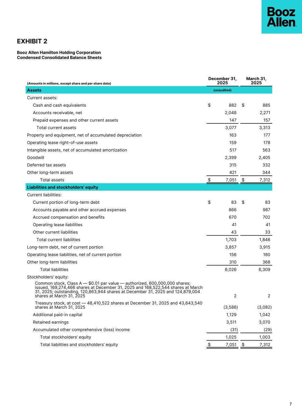 EXHIBIT 2 Booz Allen Hamilton Holding Corporation Condensed Consolidated Balance Sheets (Amounts in millions, except share and per share data) December 31, 2025 March 31, 2025 Assets (unaudited) Current assets: Cash and cash equivalents $ 882 $ 885 Accounts receivable, net 2,048 2,271 Prepaid expenses and other current assets 147 157 Total current assets 3,077 3,313 Property and equipment, net of accumulated depreciation 163 177 Operating lease right-of-use assets 159 178 Intangible assets, net of accumulated amortization 517 563 Goodwill 2,399 2,405 Deferred tax assets 315 332 Other long-term assets 421 344 Total assets $ 7,051 $ 7,312 Liabilities and stockholders' equity Current liabilities: Current portion of long-term debt $ 83 $ 83 Accounts payable and other accrued expenses 866 987 Accrued compensation and benefits 670 702 Operating lease liabilities 41 41 Other current liabilities 43 33 Total current liabilities 1,703 1,846 Long-term debt, net of current portion 3,857 3,915 Operating lease liabilities, net of current portion 156 180 Other long-term liabilities 310 368 Total liabilities 6,026 6,309 Stockholders’ equity: Common stock, Class A — $0.01 par value — authorized, 600,000,000 shares; issued, 169,274,466 shares at December 31, 2025 and 168,522,544 shares at March 31, 2025; outstanding, 120,863,944 shares at December 31, 2025 and 124,879,004 shares at March 31, 2025 2 2 Treasury stock, at cost — 48,410,522 shares at December 31, 2025 and 43,643,540 shares at March 31, 2025 (3,586) (3,082) Additional paid-in capital 1,129 1,042 Retained earnings 3,511 3,070 Accumulated other comprehensive (loss) income (31) (29) Total stockholders’ equity 1,025 1,003 Total liabilities and stockholders’ equity $ 7,051 $ 7,312 7