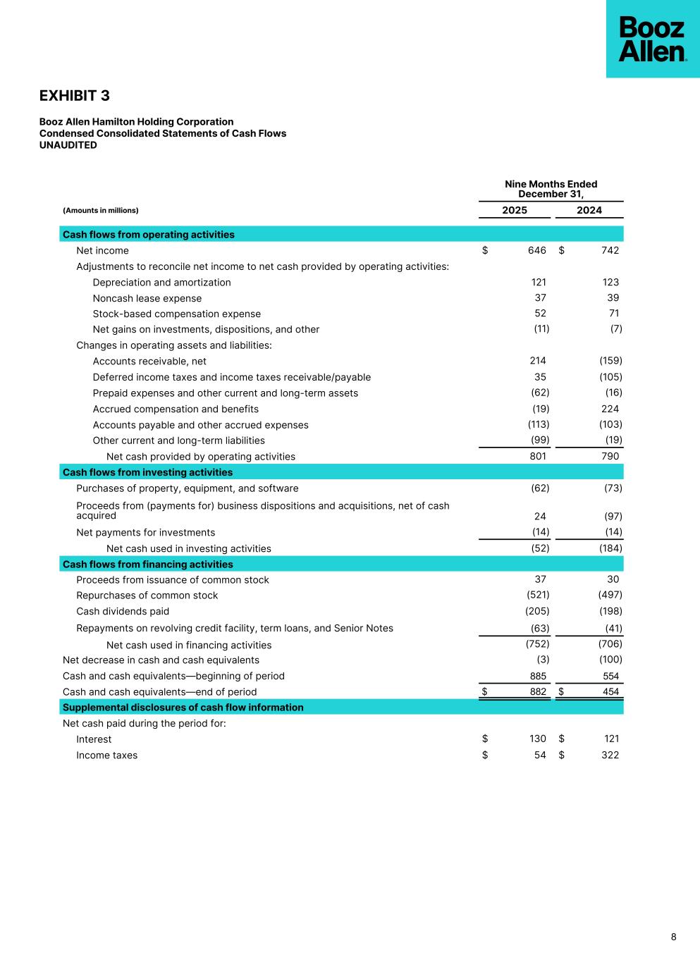 EXHIBIT 3 Booz Allen Hamilton Holding Corporation Condensed Consolidated Statements of Cash Flows UNAUDITED Nine Months Ended December 31, (Amounts in millions) 2025 2024 Cash flows from operating activities Net income $ 646 $ 742 Adjustments to reconcile net income to net cash provided by operating activities: Depreciation and amortization 121 123 Noncash lease expense 37 39 Stock-based compensation expense 52 71 Net gains on investments, dispositions, and other (11) (7) Changes in operating assets and liabilities: Accounts receivable, net 214 (159) Deferred income taxes and income taxes receivable/payable 35 (105) Prepaid expenses and other current and long-term assets (62) (16) Accrued compensation and benefits (19) 224 Accounts payable and other accrued expenses (113) (103) Other current and long-term liabilities (99) (19) Net cash provided by operating activities 801 790 Cash flows from investing activities Purchases of property, equipment, and software (62) (73) Proceeds from (payments for) business dispositions and acquisitions, net of cash acquired 24 (97) Net payments for investments (14) (14) Net cash used in investing activities (52) (184) Cash flows from financing activities Proceeds from issuance of common stock 37 30 Repurchases of common stock (521) (497) Cash dividends paid (205) (198) Repayments on revolving credit facility, term loans, and Senior Notes (63) (41) Net cash used in financing activities (752) (706) Net decrease in cash and cash equivalents (3) (100) Cash and cash equivalents––beginning of period 885 554 Cash and cash equivalents––end of period $ 882 $ 454 Supplemental disclosures of cash flow information Net cash paid during the period for: Interest $ 130 $ 121 Income taxes $ 54 $ 322 8