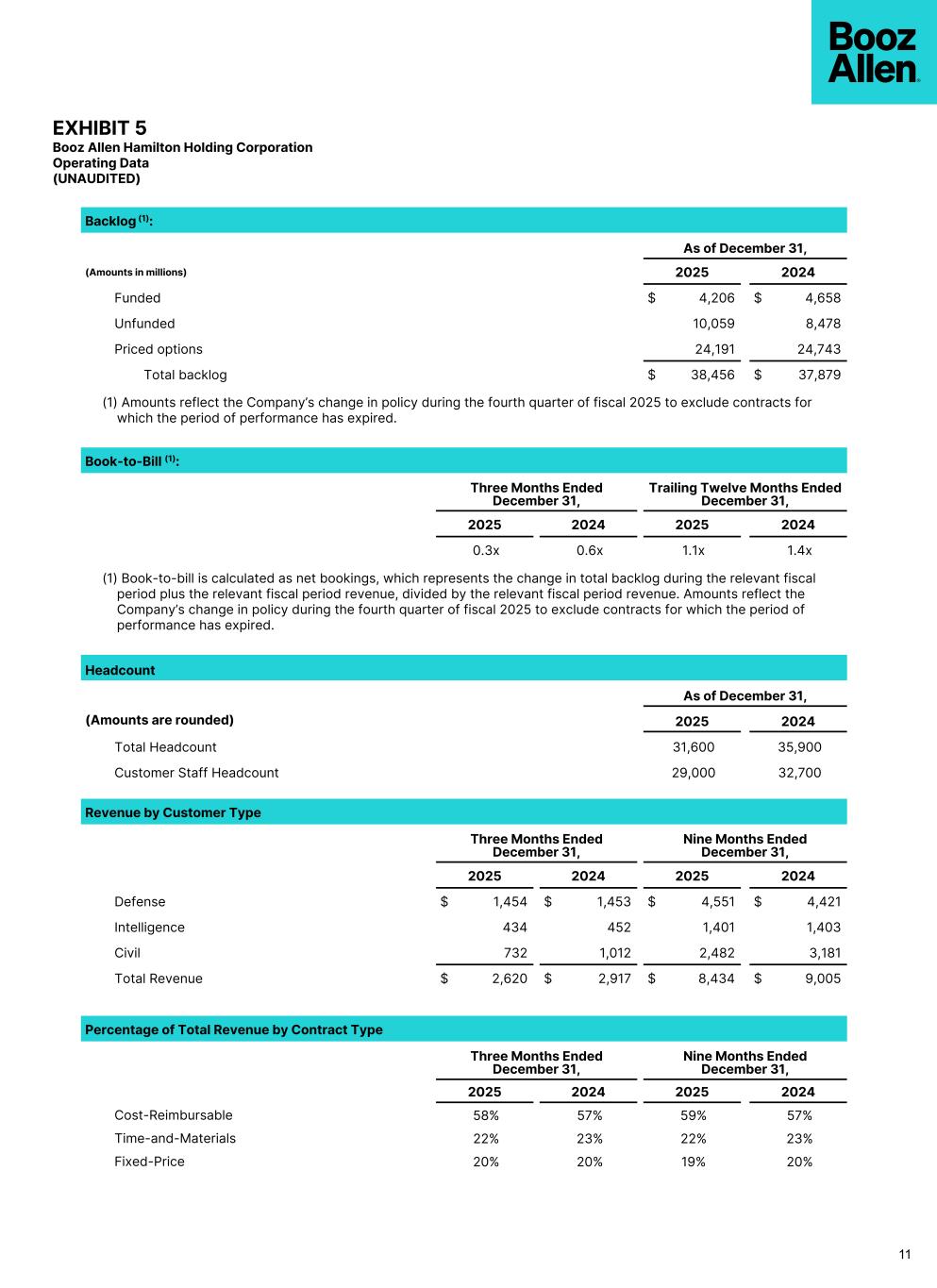 EXHIBIT 5 Booz Allen Hamilton Holding Corporation Operating Data (UNAUDITED) Backlog (1): As of December 31, (Amounts in millions) 2025 2024 Funded $ 4,206 $ 4,658 Unfunded 10,059 8,478 Priced options 24,191 24,743 Total backlog $ 38,456 $ 37,879 (1) Amounts reflect the Company’s change in policy during the fourth quarter of fiscal 2025 to exclude contracts for which the period of performance has expired. Book-to-Bill (1): Three Months Ended December 31, Trailing Twelve Months Ended December 31, 2025 2024 2025 2024 0.3x 0.6x 1.1x 1.4x (1) Book-to-bill is calculated as net bookings, which represents the change in total backlog during the relevant fiscal period plus the relevant fiscal period revenue, divided by the relevant fiscal period revenue. Amounts reflect the Company’s change in policy during the fourth quarter of fiscal 2025 to exclude contracts for which the period of performance has expired. Headcount As of December 31, (Amounts are rounded) 2025 2024 Total Headcount 31,600 35,900 Customer Staff Headcount 29,000 32,700 Revenue by Customer Type Three Months Ended December 31, Nine Months Ended December 31, 2025 2024 2025 2024 Defense $ 1,454 $ 1,453 $ 4,551 $ 4,421 Intelligence 434 452 1,401 1,403 Civil 732 1,012 2,482 3,181 Total Revenue $ 2,620 $ 2,917 $ 8,434 $ 9,005 Percentage of Total Revenue by Contract Type Three Months Ended December 31, Nine Months Ended December 31, 2025 2024 2025 2024 Cost-Reimbursable 58% 57% 59% 57% Time-and-Materials 22% 23% 22% 23% Fixed-Price 20% 20% 19% 20% 11