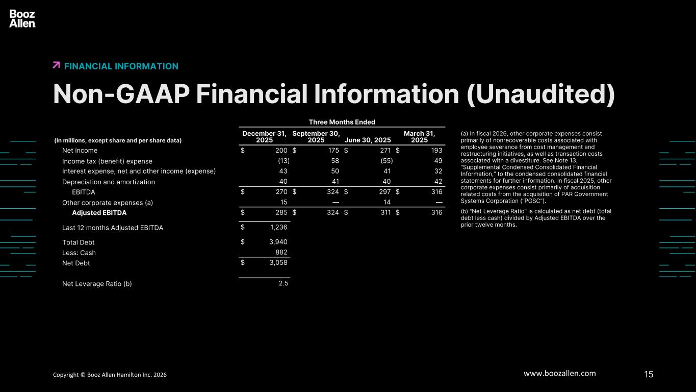 EXHIBIT 4 Booz Allen Hamilton Holding Corporation Non-GAAP Financial Information (Continued) (UNAUDITED) Three Months Ended December 31, 2025 Three Months Ended September 30, 2025 Three Months Ended June 30, 2025 Three Months Ended March 31, 2025 (In millions, except share and per share data) Net income $ 200 $ 175 $ 271 $ 193 Income tax expense (benefit) (13) 58 (55) 49 Interest expense, net and other income (expense) 43 50 41 32 Depreciation and amortization 40 41 40 42 EBITDA $ 270 $ 324 $ 297 $ 316 Other corporate expenses (a) 15 — 14 — Adjusted EBITDA $ 285 $ 324 $ 311 $ 316 Last 12 months Adjusted EBITDA $ 1,236 Total Debt $ 3,940 Less: Cash 882 Net Debt $ 3,058 Net Leverage Ratio (e) 2.5 Three Months Ended December 31, 2024 Three Months Ended September 30, 2024 Three Months Ended June 30, 2024 Three Months Ended March 31, 2024 (In millions, except share and per share data) Net income $ 187 $ 390 $ 165 $ 128 Income tax expense 61 123 49 91 Interest expense, net and other income (expense) 43 36 41 45 Depreciation and amortization 40 42 41 40 EBITDA $ 331 $ 591 $ 296 $ 304 Other corporate expenses (a) 1 1 6 2 Change in provision for claimed costs (b) — (113) — — Insurance recoveries (c) — (115) — — DC tax assessment adjustment (d) — — — (20) Adjusted EBITDA $ 332 $ 364 $ 302 $ 286 Last 12 months Adjusted EBITDA $ 1,284 Total Debt $ 3,374 Less: Cash 454 Net Debt $ 2,920 Net Leverage Ratio (e) 2.3 10 (a) In fiscal 2026, other corporate expenses consist primarily of nonrecoverable costs associated with employee severance from cost management and restructuring initiatives, as well as transaction costs associated with a divestiture. See Note 13, “Supplemental Condensed Consolidated Financial Information,” to the condensed consolidated financial statements for further information. In fiscal 2025, other corporate expenses consist primarily of acquisition related costs from the acquisition of PAR Government Systems Corporation (“PGSC”). (b) Represents the reduction to our provision for claimed costs for years prior to fiscal 2025 recorded during the second quarter of fiscal 2025, which resulted in a corresponding increase to revenue, as a result of the Defense Contract Audit Agency's findings related to its audits of our claimed costs for multiple fiscal years. See Note 19, “Commitments and Contingencies,” to the consolidated financial statements in the Company's Form 10-K for the fiscal year ended March 31, 2025 for further information. (c) Reflects insurance recoveries from claims related to the Company’s fiscal 2024 settlement as described in Note 20, “Commitments and Contingencies,” to the consolidated financial statements contained within the Annual Report on Form 10-K for the fiscal year ended March 31, 2024. (d) Reflects the impact (specifically the revenue from recoverable expenses) of the Company's unfavorable ruling from the District of Columbia Court of Appeals related to contested tax assessments from the District of Columbia Office of Tax and Revenue (“DC OTR”). See Note 13, “Income Taxes,” to the consolidated financial statements contained within the Annual Report on Form 10-K for the fiscal year ended March 31, 2024 for further information. (e) "Net Leverage Ratio" is calculated as net debt (total debt less cash) divided by Adjusted EBITDA over the prior twelve months.