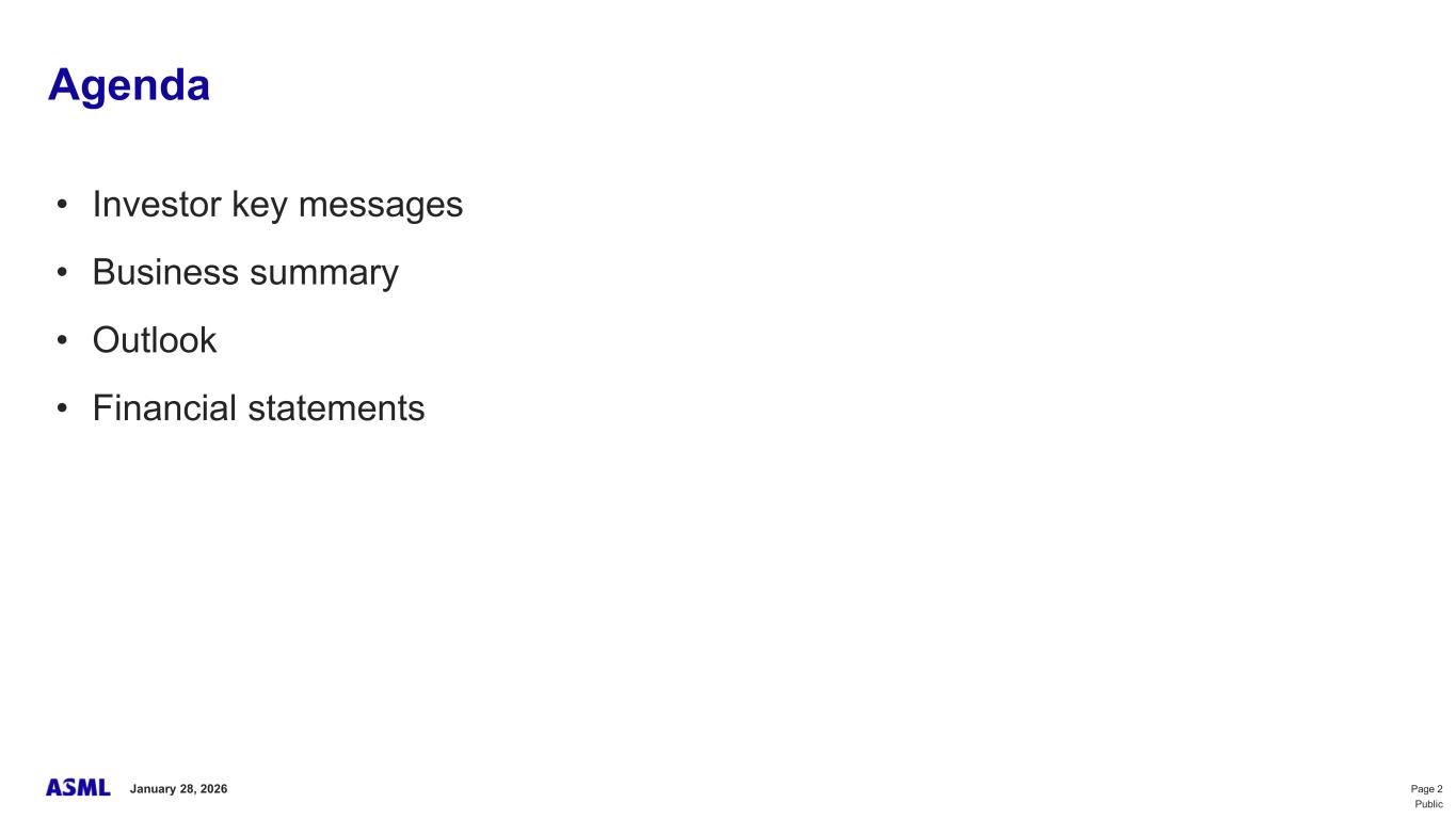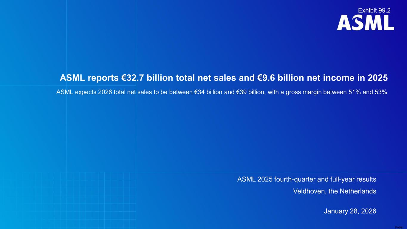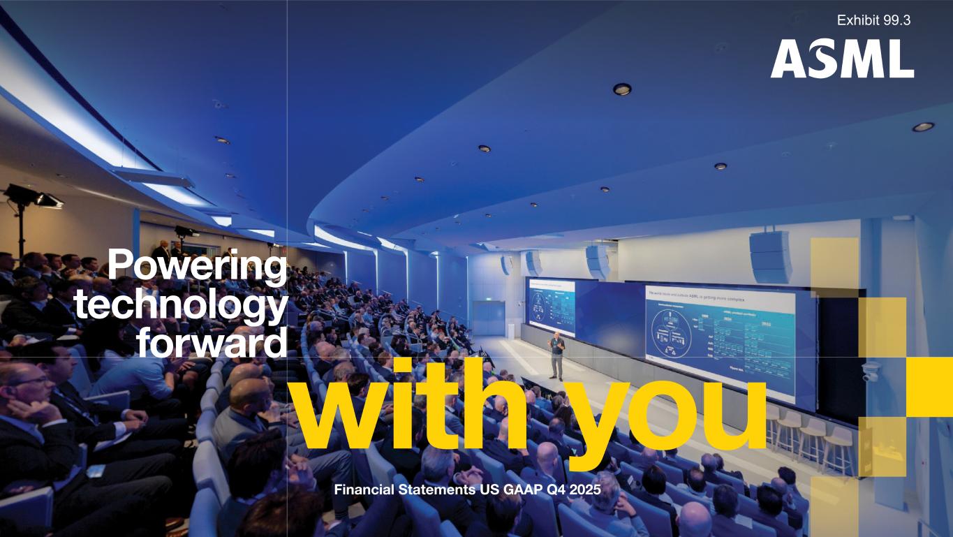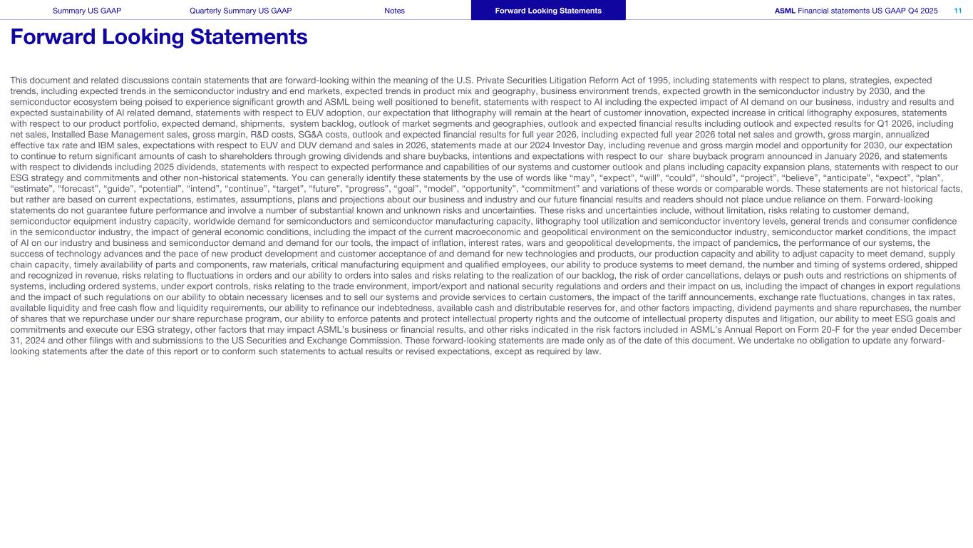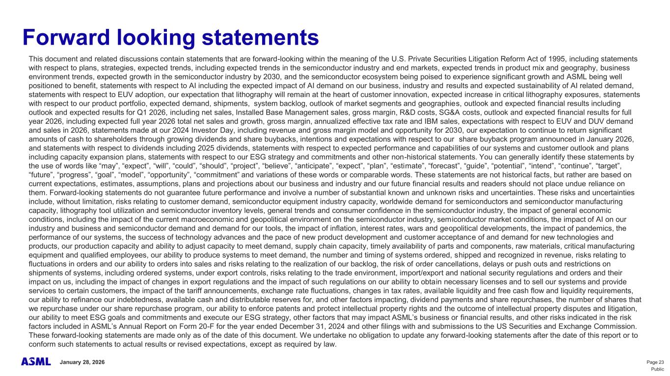 This document and related discussions contain statements that are forward-looking within the meaning of the U.S. Private Securities Litigation Reform Act of 1995, including statements with respect to plans, strategies, expected trends, including expected trends in the semiconductor industry and end markets, expected trends in product mix and geography, business environment trends, expected growth in the semiconductor industry by 2030, and the semiconductor ecosystem being poised to experience significant growth and ASML being well positioned to benefit, statements with respect to AI including the expected impact of AI demand on our business, industry and results and expected sustainability of AI related demand, statements with respect to EUV adoption, our expectation that lithography will remain at the heart of customer innovation, expected increase in critical lithography exposures, statements with respect to our product portfolio, expected demand, shipments, system backlog, outlook of market segments and geographies, outlook and expected financial results including outlook and expected results for Q1 2026, including net sales, Installed Base Management sales, gross margin, R&D costs, SG&A costs, outlook and expected financial results for full year 2026, including expected full year 2026 total net sales and growth, gross margin, annualized effective tax rate and IBM sales, expectations with respect to EUV and DUV demand and sales in 2026, statements made at our 2024 Investor Day, including revenue and gross margin model and opportunity for 2030, our expectation to continue to return significant amounts of cash to shareholders through growing dividends and share buybacks, intentions and expectations with respect to our share buyback program announced in January 2026, and statements with respect to dividends including 2025 dividends, statements with respect to expected performance and capabilities of our systems and customer outlook and plans including capacity expansion plans, statements with respect to our ESG strategy and commitments and other non-historical statements. You can generally identify these statements by the use of words like “may”, “expect”, “will”, “could”, “should”, “project”, “believe”, “anticipate”, “expect”, “plan”, “estimate”, “forecast”, “guide”, “potential”, “intend”, “continue”, “target”, “future”, “progress”, “goal”, “model”, “opportunity”, “commitment” and variations of these words or comparable words. These statements are not historical facts, but rather are based on current expectations, estimates, assumptions, plans and projections about our business and industry and our future financial results and readers should not place undue reliance on them. Forward-looking statements do not guarantee future performance and involve a number of substantial known and unknown risks and uncertainties. These risks and uncertainties include, without limitation, risks relating to customer demand, semiconductor equipment industry capacity, worldwide demand for semiconductors and semiconductor manufacturing capacity, lithography tool utilization and semiconductor inventory levels, general trends and consumer confidence in the semiconductor industry, the impact of general economic conditions, including the impact of the current macroeconomic and geopolitical environment on the semiconductor industry, semiconductor market conditions, the impact of AI on our industry and business and semiconductor demand and demand for our tools, the impact of inflation, interest rates, wars and geopolitical developments, the impact of pandemics, the performance of our systems, the success of technology advances and the pace of new product development and customer acceptance of and demand for new technologies and products, our production capacity and ability to adjust capacity to meet demand, supply chain capacity, timely availability of parts and components, raw materials, critical manufacturing equipment and qualified employees, our ability to produce systems to meet demand, the number and timing of systems ordered, shipped and recognized in revenue, risks relating to fluctuations in orders and our ability to orders into sales and risks relating to the realization of our backlog, the risk of order cancellations, delays or push outs and restrictions on shipments of systems, including ordered systems, under export controls, risks relating to the trade environment, import/export and national security regulations and orders and their impact on us, including the impact of changes in export regulations and the impact of such regulations on our ability to obtain necessary licenses and to sell our systems and provide services to certain customers, the impact of the tariff announcements, exchange rate fluctuations, changes in tax rates, available liquidity and free cash flow and liquidity requirements, our ability to refinance our indebtedness, available cash and distributable reserves for, and other factors impacting, dividend payments and share repurchases, the number of shares that we repurchase under our share repurchase program, our ability to enforce patents and protect intellectual property rights and the outcome of intellectual property disputes and litigation, our ability to meet ESG goals and commitments and execute our ESG strategy, other factors that may impact ASML’s business or financial results, and other risks indicated in the risk factors included in ASML’s Annual Report on Form 20-F for the year ended December 31, 2024 and other filings with and submissions to the US Securities and Exchange Commission. These forward-looking statements are made only as of the date of this document. We undertake no obligation to update any forward-looking statements after the date of this report or to conform such statements to actual results or revised expectations, except as required by law.