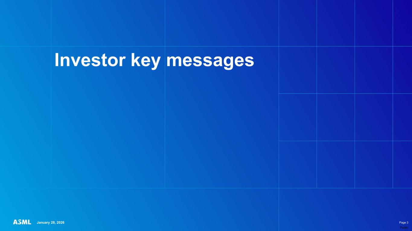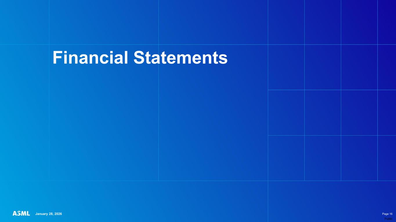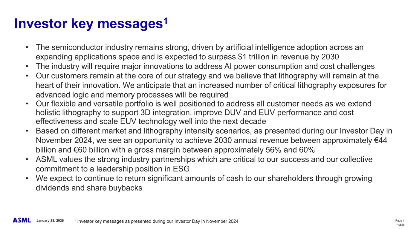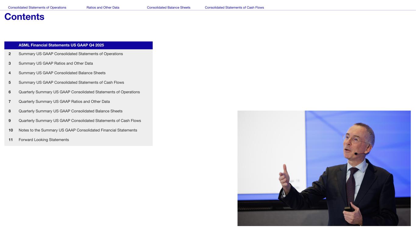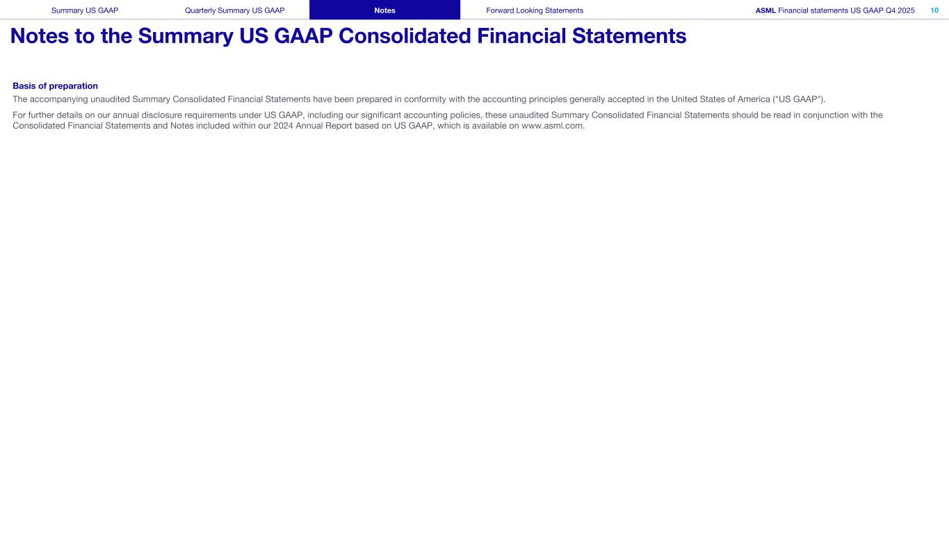 This document and related discussions contain statements that are forward-looking within the meaning of the U.S. Private Securities Litigation Reform Act of 1995, including statements with respect to plans, strategies, expected trends, including expected trends in the semiconductor industry and end markets, expected trends in product mix and geography, business environment trends, expected growth in the semiconductor industry by 2030, and the semiconductor ecosystem being poised to experience significant growth and ASML being well positioned to benefit, statements with respect to AI including the expected impact of AI demand on our business, industry and results and expected sustainability of AI related demand, statements with respect to EUV adoption, our expectation that lithography will remain at the heart of customer innovation, expected increase in critical lithography exposures, statements with respect to our product portfolio, expected demand, shipments, system backlog, outlook of market segments and geographies, outlook and expected financial results including outlook and expected results for Q1 2026, including net sales, Installed Base Management sales, gross margin, R&D costs, SG&A costs, outlook and expected financial results for full year 2026, including expected full year 2026 total net sales and growth, gross margin, annualized effective tax rate and IBM sales, expectations with respect to EUV and DUV demand and sales in 2026, statements made at our 2024 Investor Day, including revenue and gross margin model and opportunity for 2030, our expectation to continue to return significant amounts of cash to shareholders through growing dividends and share buybacks, intentions and expectations with respect to our share buyback program announced in January 2026, and statements with respect to dividends including 2025 dividends, statements with respect to expected performance and capabilities of our systems and customer outlook and plans including capacity expansion plans, statements with respect to our ESG strategy and commitments and other non-historical statements. You can generally identify these statements by the use of words like “may”, “expect”, “will”, “could”, “should”, “project”, “believe”, “anticipate”, “expect”, “plan”, “estimate”, “forecast”, “guide”, “potential”, “intend”, “continue”, “target”, “future”, “progress”, “goal”, “model”, “opportunity”, “commitment” and variations of these words or comparable words. These statements are not historical facts, but rather are based on current expectations, estimates, assumptions, plans and projections about our business and industry and our future financial results and readers should not place undue reliance on them. Forward-looking statements do not guarantee future performance and involve a number of substantial known and unknown risks and uncertainties. These risks and uncertainties include, without limitation, risks relating to customer demand, semiconductor equipment industry capacity, worldwide demand for semiconductors and semiconductor manufacturing capacity, lithography tool utilization and semiconductor inventory levels, general trends and consumer confidence in the semiconductor industry, the impact of general economic conditions, including the impact of the current macroeconomic and geopolitical environment on the semiconductor industry, semiconductor market conditions, the impact of AI on our industry and business and semiconductor demand and demand for our tools, the impact of inflation, interest rates, wars and geopolitical developments, the impact of pandemics, the performance of our systems, the success of technology advances and the pace of new product development and customer acceptance of and demand for new technologies and products, our production capacity and ability to adjust capacity to meet demand, supply chain capacity, timely availability of parts and components, raw materials, critical manufacturing equipment and qualified employees, our ability to produce systems to meet demand, the number and timing of systems ordered, shipped and recognized in revenue, risks relating to fluctuations in orders and our ability to orders into sales and risks relating to the realization of our backlog, the risk of order cancellations, delays or push outs and restrictions on shipments of systems, including ordered systems, under export controls, risks relating to the trade environment, import/export and national security regulations and orders and their impact on us, including the impact of changes in export regulations and the impact of such regulations on our ability to obtain necessary licenses and to sell our systems and provide services to certain customers, the impact of the tariff announcements, exchange rate fluctuations, changes in tax rates, available liquidity and free cash flow and liquidity requirements, our ability to refinance our indebtedness, available cash and distributable reserves for, and other factors impacting, dividend payments and share repurchases, the number of shares that we repurchase under our share repurchase program, our ability to enforce patents and protect intellectual property rights and the outcome of intellectual property disputes and litigation, our ability to meet ESG goals and commitments and execute our ESG strategy, other factors that may impact ASML’s business or financial results, and other risks indicated in the risk factors included in ASML’s Annual Report on Form 20-F for the year ended December 31, 2024 and other filings with and submissions to the US Securities and Exchange Commission. These forward-looking statements are made only as of the date of this document. We undertake no obligation to update any forward-looking statements after the date of this report or to conform such statements to actual results or revised expectations, except as required by law.