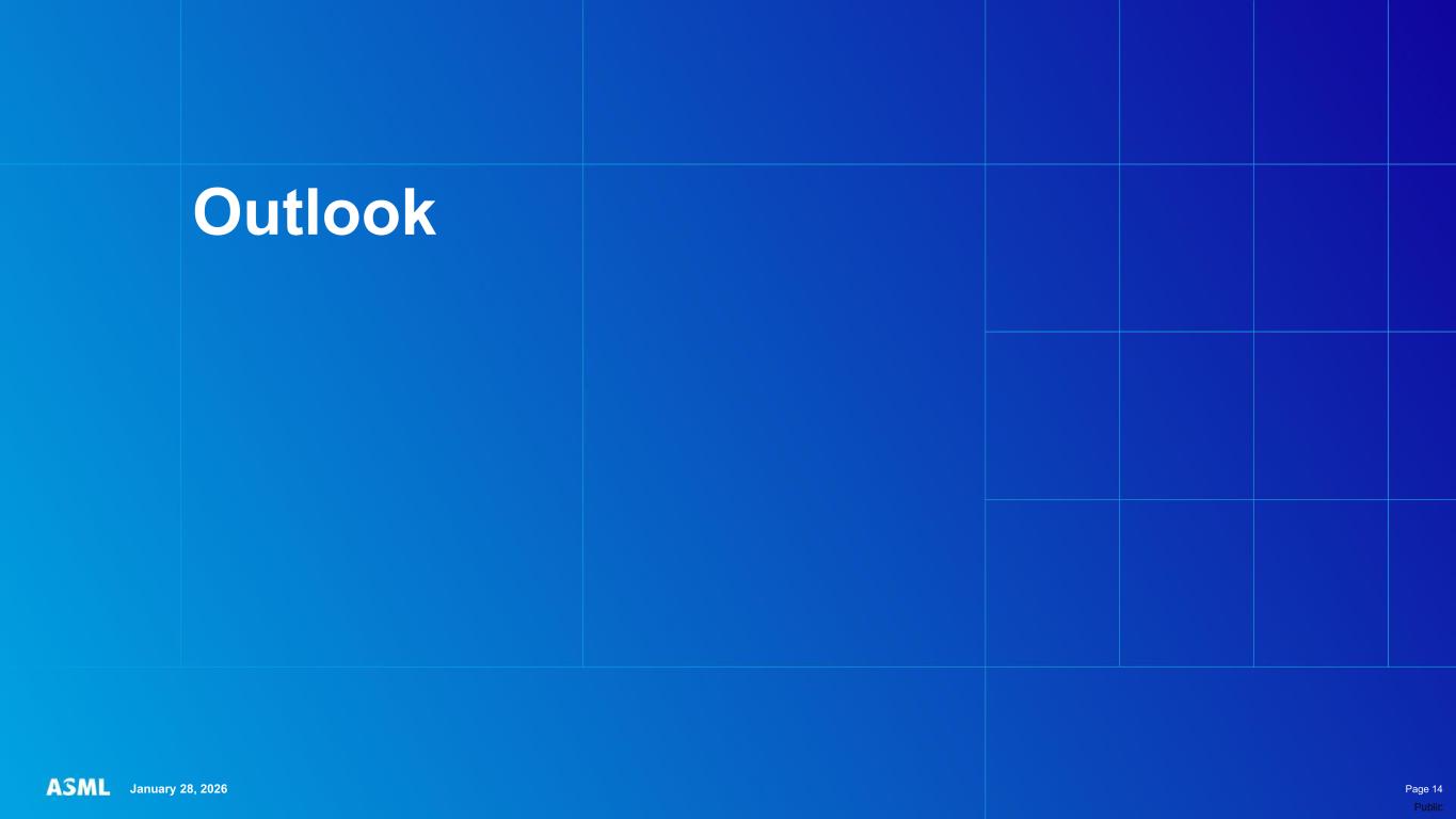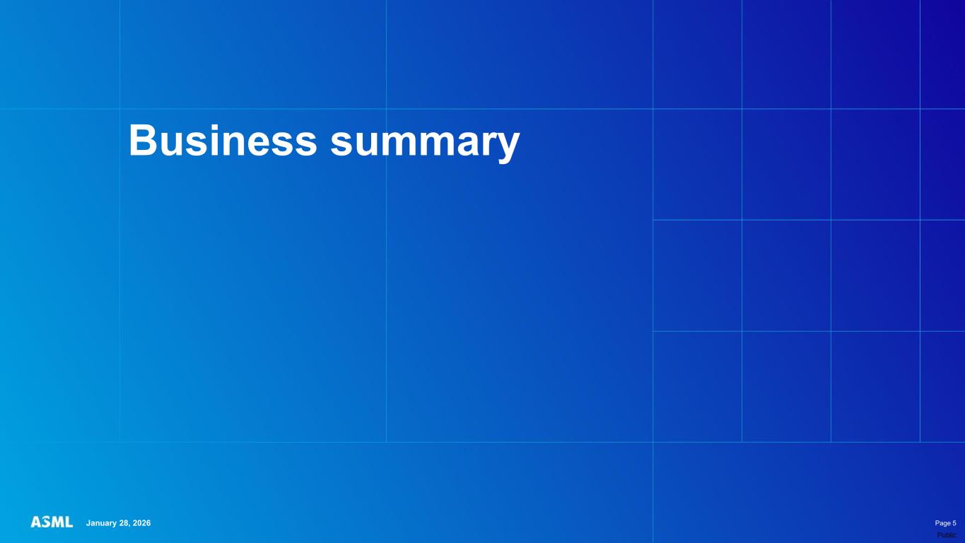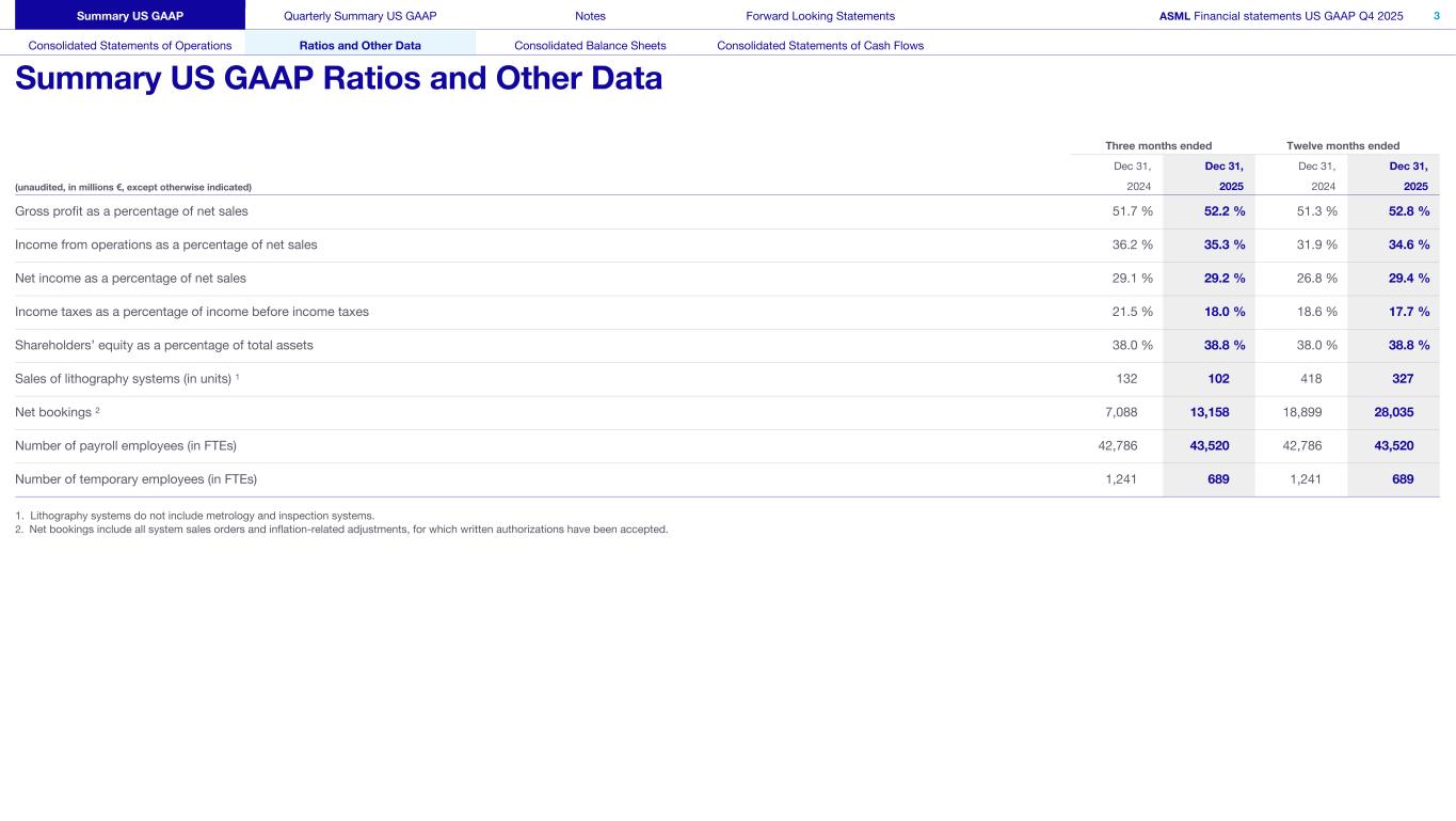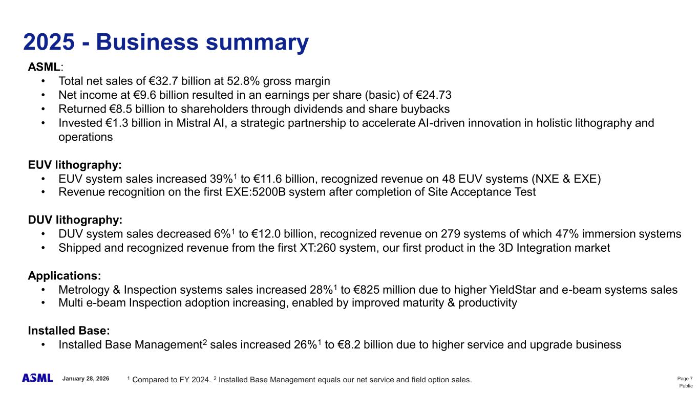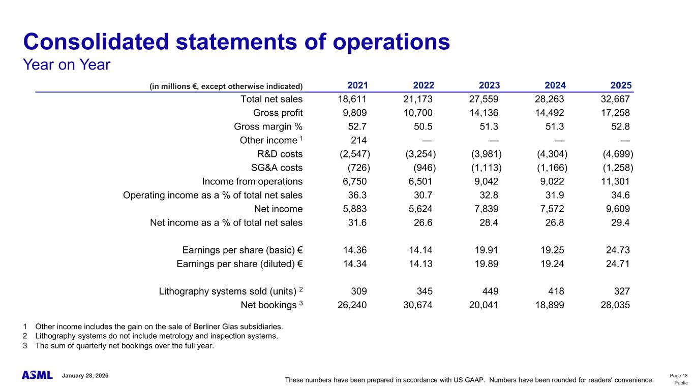 This document and related discussions contain statements that are forward-looking within the meaning of the U.S. Private Securities Litigation Reform Act of 1995, including statements with respect to plans, strategies, expected trends, including expected trends in the semiconductor industry and end markets, expected trends in product mix and geography, business environment trends, expected growth in the semiconductor industry by 2030, and the semiconductor ecosystem being poised to experience significant growth and ASML being well positioned to benefit, statements with respect to AI including the expected impact of AI demand on our business, industry and results and expected sustainability of AI related demand, statements with respect to EUV adoption, our expectation that lithography will remain at the heart of customer innovation, expected increase in critical lithography exposures, statements with respect to our product portfolio, expected demand, shipments, system backlog, outlook of market segments and geographies, outlook and expected financial results including outlook and expected results for Q1 2026, including net sales, Installed Base Management sales, gross margin, R&D costs, SG&A costs, outlook and expected financial results for full year 2026, including expected full year 2026 total net sales and growth, gross margin, annualized effective tax rate and IBM sales, expectations with respect to EUV and DUV demand and sales in 2026, statements made at our 2024 Investor Day, including revenue and gross margin model and opportunity for 2030, our expectation to continue to return significant amounts of cash to shareholders through growing dividends and share buybacks, intentions and expectations with respect to our share buyback program announced in January 2026, and statements with respect to dividends including 2025 dividends, statements with respect to expected performance and capabilities of our systems and customer outlook and plans including capacity expansion plans, statements with respect to our ESG strategy and commitments and other non-historical statements. You can generally identify these statements by the use of words like “may”, “expect”, “will”, “could”, “should”, “project”, “believe”, “anticipate”, “expect”, “plan”, “estimate”, “forecast”, “guide”, “potential”, “intend”, “continue”, “target”, “future”, “progress”, “goal”, “model”, “opportunity”, “commitment” and variations of these words or comparable words. These statements are not historical facts, but rather are based on current expectations, estimates, assumptions, plans and projections about our business and industry and our future financial results and readers should not place undue reliance on them. Forward-looking statements do not guarantee future performance and involve a number of substantial known and unknown risks and uncertainties. These risks and uncertainties include, without limitation, risks relating to customer demand, semiconductor equipment industry capacity, worldwide demand for semiconductors and semiconductor manufacturing capacity, lithography tool utilization and semiconductor inventory levels, general trends and consumer confidence in the semiconductor industry, the impact of general economic conditions, including the impact of the current macroeconomic and geopolitical environment on the semiconductor industry, semiconductor market conditions, the impact of AI on our industry and business and semiconductor demand and demand for our tools, the impact of inflation, interest rates, wars and geopolitical developments, the impact of pandemics, the performance of our systems, the success of technology advances and the pace of new product development and customer acceptance of and demand for new technologies and products, our production capacity and ability to adjust capacity to meet demand, supply chain capacity, timely availability of parts and components, raw materials, critical manufacturing equipment and qualified employees, our ability to produce systems to meet demand, the number and timing of systems ordered, shipped and recognized in revenue, risks relating to fluctuations in orders and our ability to orders into sales and risks relating to the realization of our backlog, the risk of order cancellations, delays or push outs and restrictions on shipments of systems, including ordered systems, under export controls, risks relating to the trade environment, import/export and national security regulations and orders and their impact on us, including the impact of changes in export regulations and the impact of such regulations on our ability to obtain necessary licenses and to sell our systems and provide services to certain customers, the impact of the tariff announcements, exchange rate fluctuations, changes in tax rates, available liquidity and free cash flow and liquidity requirements, our ability to refinance our indebtedness, available cash and distributable reserves for, and other factors impacting, dividend payments and share repurchases, the number of shares that we repurchase under our share repurchase program, our ability to enforce patents and protect intellectual property rights and the outcome of intellectual property disputes and litigation, our ability to meet ESG goals and commitments and execute our ESG strategy, other factors that may impact ASML’s business or financial results, and other risks indicated in the risk factors included in ASML’s Annual Report on Form 20-F for the year ended December 31, 2024 and other filings with and submissions to the US Securities and Exchange Commission. These forward-looking statements are made only as of the date of this document. We undertake no obligation to update any forward-looking statements after the date of this report or to conform such statements to actual results or revised expectations, except as required by law.