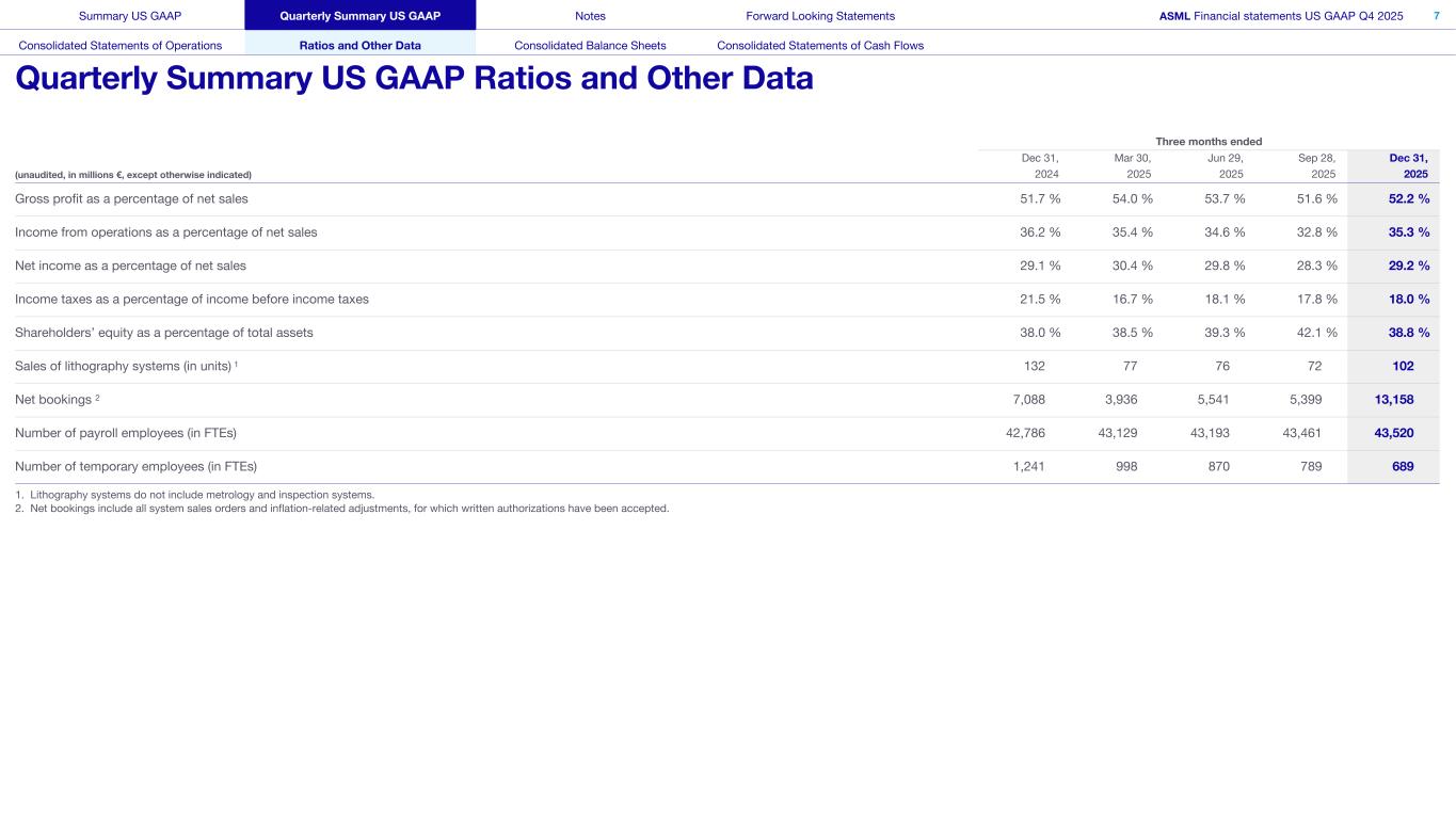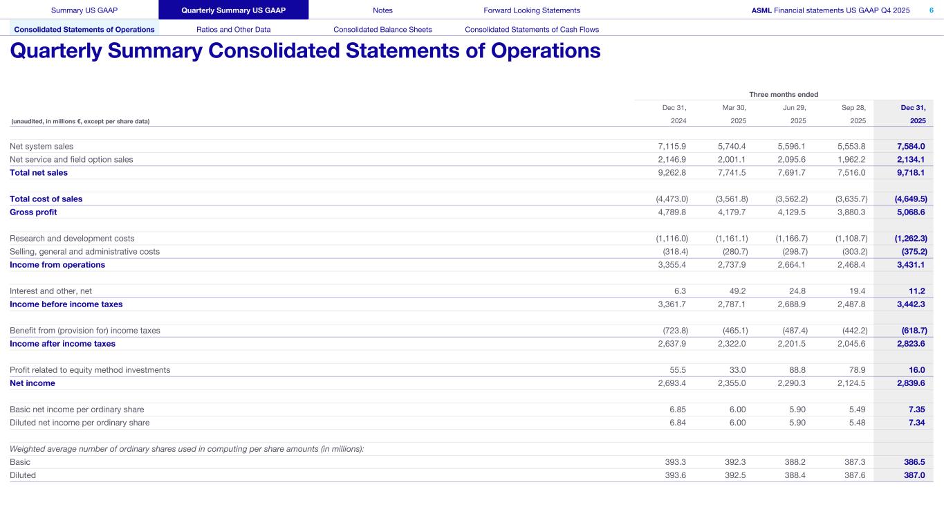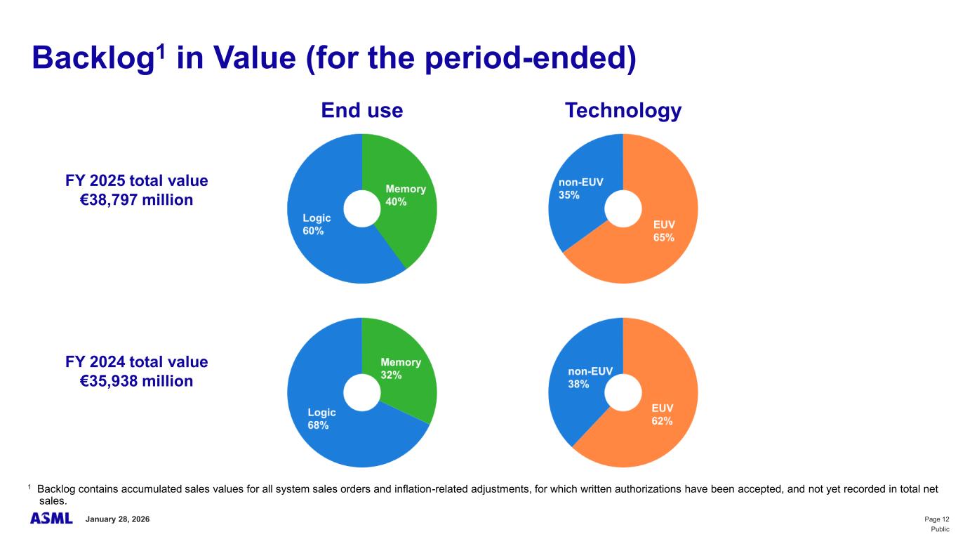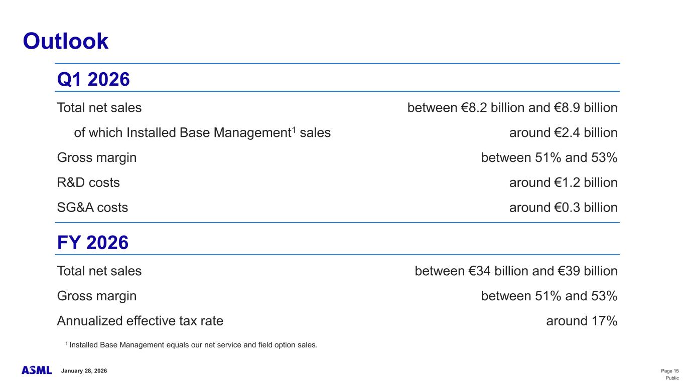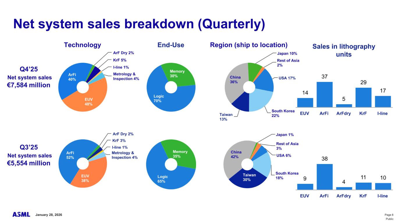 This document and related discussions contain statements that are forward-looking within the meaning of the U.S. Private Securities Litigation Reform Act of 1995, including statements with respect to plans, strategies, expected trends, including expected trends in the semiconductor industry and end markets, expected trends in product mix and geography, business environment trends, expected growth in the semiconductor industry by 2030, and the semiconductor ecosystem being poised to experience significant growth and ASML being well positioned to benefit, statements with respect to AI including the expected impact of AI demand on our business, industry and results and expected sustainability of AI related demand, statements with respect to EUV adoption, our expectation that lithography will remain at the heart of customer innovation, expected increase in critical lithography exposures, statements with respect to our product portfolio, expected demand, shipments, system backlog, outlook of market segments and geographies, outlook and expected financial results including outlook and expected results for Q1 2026, including net sales, Installed Base Management sales, gross margin, R&D costs, SG&A costs, outlook and expected financial results for full year 2026, including expected full year 2026 total net sales and growth, gross margin, annualized effective tax rate and IBM sales, expectations with respect to EUV and DUV demand and sales in 2026, statements made at our 2024 Investor Day, including revenue and gross margin model and opportunity for 2030, our expectation to continue to return significant amounts of cash to shareholders through growing dividends and share buybacks, intentions and expectations with respect to our share buyback program announced in January 2026, and statements with respect to dividends including 2025 dividends, statements with respect to expected performance and capabilities of our systems and customer outlook and plans including capacity expansion plans, statements with respect to our ESG strategy and commitments and other non-historical statements. You can generally identify these statements by the use of words like “may”, “expect”, “will”, “could”, “should”, “project”, “believe”, “anticipate”, “expect”, “plan”, “estimate”, “forecast”, “guide”, “potential”, “intend”, “continue”, “target”, “future”, “progress”, “goal”, “model”, “opportunity”, “commitment” and variations of these words or comparable words. These statements are not historical facts, but rather are based on current expectations, estimates, assumptions, plans and projections about our business and industry and our future financial results and readers should not place undue reliance on them. Forward-looking statements do not guarantee future performance and involve a number of substantial known and unknown risks and uncertainties. These risks and uncertainties include, without limitation, risks relating to customer demand, semiconductor equipment industry capacity, worldwide demand for semiconductors and semiconductor manufacturing capacity, lithography tool utilization and semiconductor inventory levels, general trends and consumer confidence in the semiconductor industry, the impact of general economic conditions, including the impact of the current macroeconomic and geopolitical environment on the semiconductor industry, semiconductor market conditions, the impact of AI on our industry and business and semiconductor demand and demand for our tools, the impact of inflation, interest rates, wars and geopolitical developments, the impact of pandemics, the performance of our systems, the success of technology advances and the pace of new product development and customer acceptance of and demand for new technologies and products, our production capacity and ability to adjust capacity to meet demand, supply chain capacity, timely availability of parts and components, raw materials, critical manufacturing equipment and qualified employees, our ability to produce systems to meet demand, the number and timing of systems ordered, shipped and recognized in revenue, risks relating to fluctuations in orders and our ability to orders into sales and risks relating to the realization of our backlog, the risk of order cancellations, delays or push outs and restrictions on shipments of systems, including ordered systems, under export controls, risks relating to the trade environment, import/export and national security regulations and orders and their impact on us, including the impact of changes in export regulations and the impact of such regulations on our ability to obtain necessary licenses and to sell our systems and provide services to certain customers, the impact of the tariff announcements, exchange rate fluctuations, changes in tax rates, available liquidity and free cash flow and liquidity requirements, our ability to refinance our indebtedness, available cash and distributable reserves for, and other factors impacting, dividend payments and share repurchases, the number of shares that we repurchase under our share repurchase program, our ability to enforce patents and protect intellectual property rights and the outcome of intellectual property disputes and litigation, our ability to meet ESG goals and commitments and execute our ESG strategy, other factors that may impact ASML’s business or financial results, and other risks indicated in the risk factors included in ASML’s Annual Report on Form 20-F for the year ended December 31, 2024 and other filings with and submissions to the US Securities and Exchange Commission. These forward-looking statements are made only as of the date of this document. We undertake no obligation to update any forward-looking statements after the date of this report or to conform such statements to actual results or revised expectations, except as required by law.