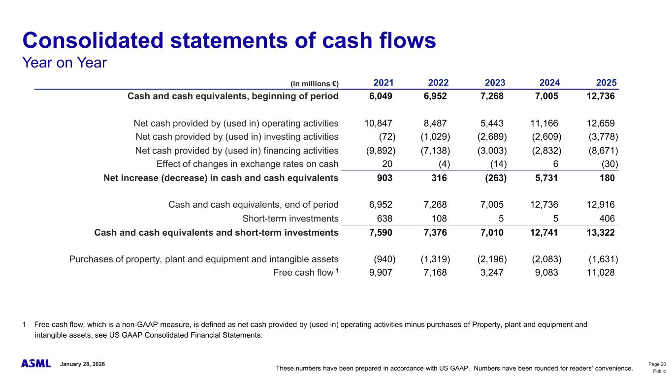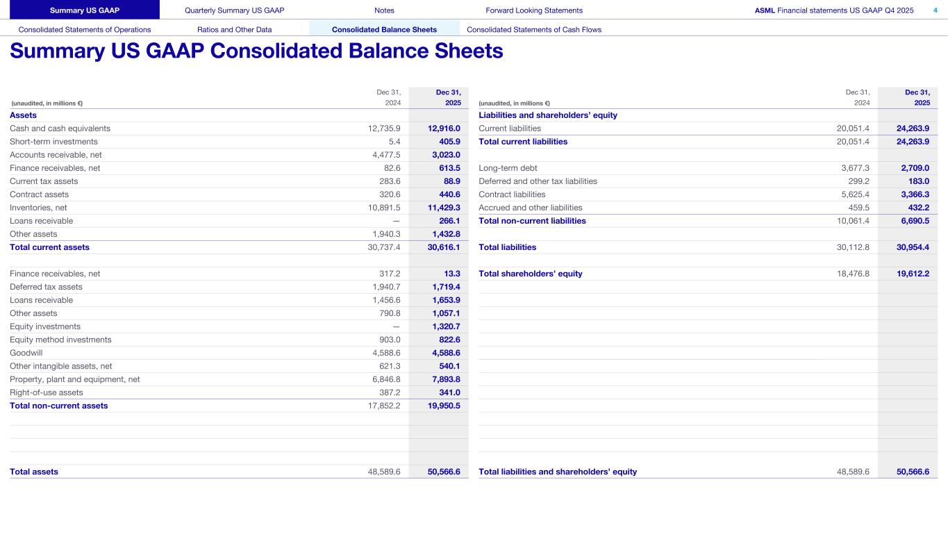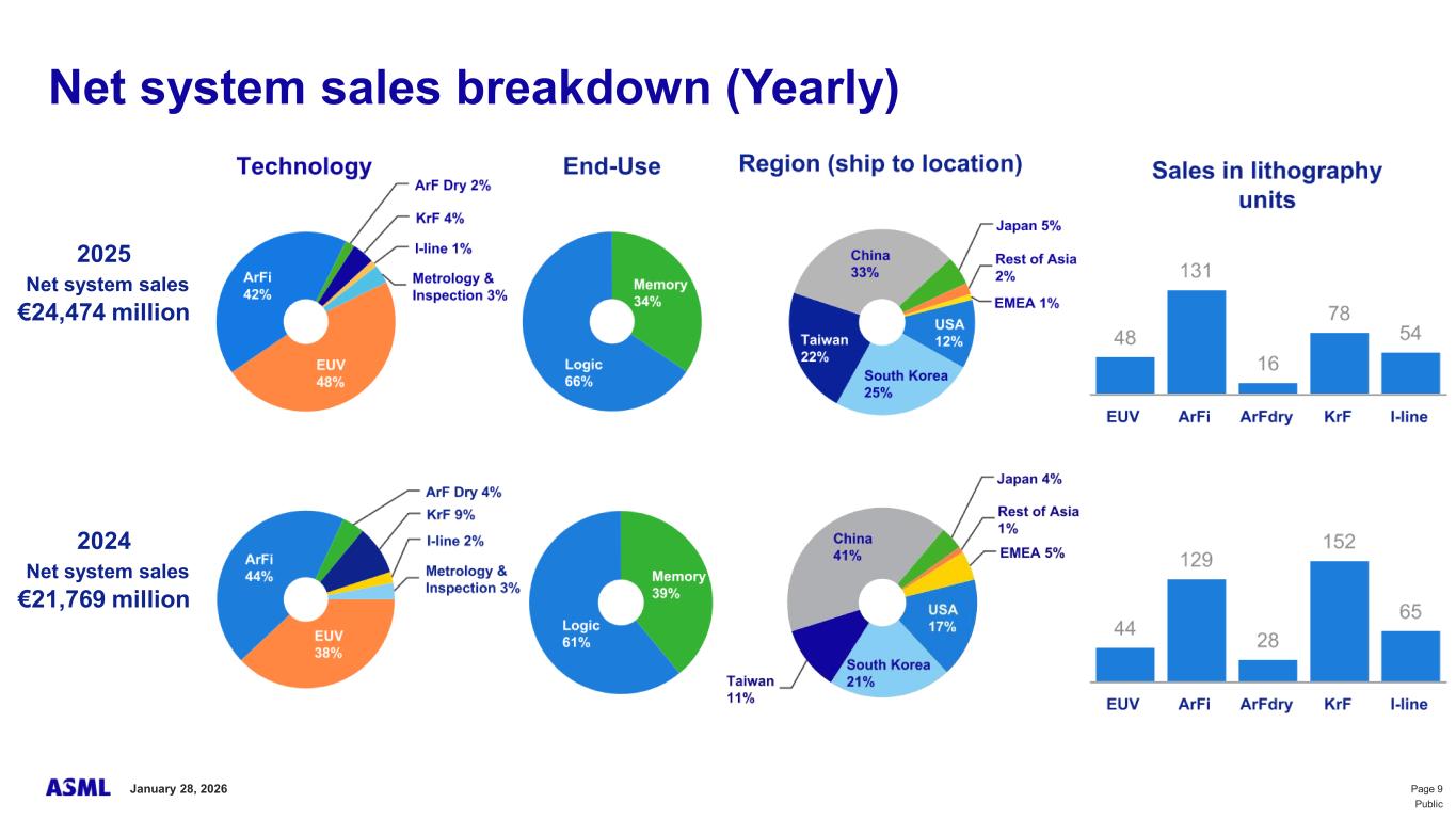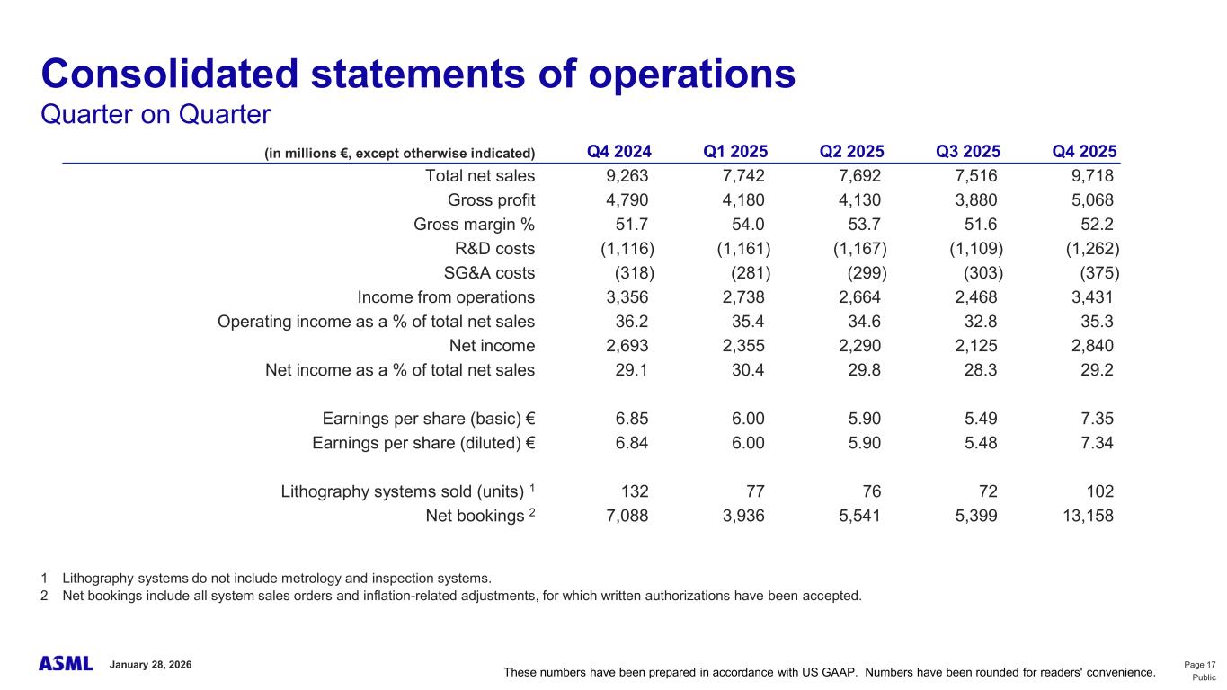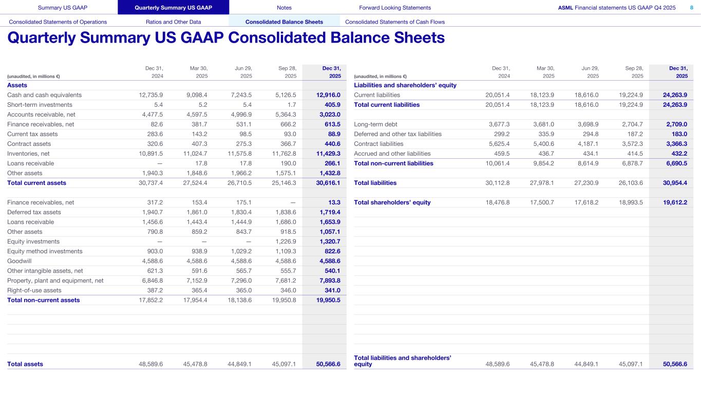 This document and related discussions contain statements that are forward-looking within the meaning of the U.S. Private Securities Litigation Reform Act of 1995, including statements with respect to plans, strategies, expected trends, including expected trends in the semiconductor industry and end markets, expected trends in product mix and geography, business environment trends, expected growth in the semiconductor industry by 2030, and the semiconductor ecosystem being poised to experience significant growth and ASML being well positioned to benefit, statements with respect to AI including the expected impact of AI demand on our business, industry and results and expected sustainability of AI related demand, statements with respect to EUV adoption, our expectation that lithography will remain at the heart of customer innovation, expected increase in critical lithography exposures, statements with respect to our product portfolio, expected demand, shipments, system backlog, outlook of market segments and geographies, outlook and expected financial results including outlook and expected results for Q1 2026, including net sales, Installed Base Management sales, gross margin, R&D costs, SG&A costs, outlook and expected financial results for full year 2026, including expected full year 2026 total net sales and growth, gross margin, annualized effective tax rate and IBM sales, expectations with respect to EUV and DUV demand and sales in 2026, statements made at our 2024 Investor Day, including revenue and gross margin model and opportunity for 2030, our expectation to continue to return significant amounts of cash to shareholders through growing dividends and share buybacks, intentions and expectations with respect to our share buyback program announced in January 2026, and statements with respect to dividends including 2025 dividends, statements with respect to expected performance and capabilities of our systems and customer outlook and plans including capacity expansion plans, statements with respect to our ESG strategy and commitments and other non-historical statements. You can generally identify these statements by the use of words like “may”, “expect”, “will”, “could”, “should”, “project”, “believe”, “anticipate”, “expect”, “plan”, “estimate”, “forecast”, “guide”, “potential”, “intend”, “continue”, “target”, “future”, “progress”, “goal”, “model”, “opportunity”, “commitment” and variations of these words or comparable words. These statements are not historical facts, but rather are based on current expectations, estimates, assumptions, plans and projections about our business and industry and our future financial results and readers should not place undue reliance on them. Forward-looking statements do not guarantee future performance and involve a number of substantial known and unknown risks and uncertainties. These risks and uncertainties include, without limitation, risks relating to customer demand, semiconductor equipment industry capacity, worldwide demand for semiconductors and semiconductor manufacturing capacity, lithography tool utilization and semiconductor inventory levels, general trends and consumer confidence in the semiconductor industry, the impact of general economic conditions, including the impact of the current macroeconomic and geopolitical environment on the semiconductor industry, semiconductor market conditions, the impact of AI on our industry and business and semiconductor demand and demand for our tools, the impact of inflation, interest rates, wars and geopolitical developments, the impact of pandemics, the performance of our systems, the success of technology advances and the pace of new product development and customer acceptance of and demand for new technologies and products, our production capacity and ability to adjust capacity to meet demand, supply chain capacity, timely availability of parts and components, raw materials, critical manufacturing equipment and qualified employees, our ability to produce systems to meet demand, the number and timing of systems ordered, shipped and recognized in revenue, risks relating to fluctuations in orders and our ability to orders into sales and risks relating to the realization of our backlog, the risk of order cancellations, delays or push outs and restrictions on shipments of systems, including ordered systems, under export controls, risks relating to the trade environment, import/export and national security regulations and orders and their impact on us, including the impact of changes in export regulations and the impact of such regulations on our ability to obtain necessary licenses and to sell our systems and provide services to certain customers, the impact of the tariff announcements, exchange rate fluctuations, changes in tax rates, available liquidity and free cash flow and liquidity requirements, our ability to refinance our indebtedness, available cash and distributable reserves for, and other factors impacting, dividend payments and share repurchases, the number of shares that we repurchase under our share repurchase program, our ability to enforce patents and protect intellectual property rights and the outcome of intellectual property disputes and litigation, our ability to meet ESG goals and commitments and execute our ESG strategy, other factors that may impact ASML’s business or financial results, and other risks indicated in the risk factors included in ASML’s Annual Report on Form 20-F for the year ended December 31, 2024 and other filings with and submissions to the US Securities and Exchange Commission. These forward-looking statements are made only as of the date of this document. We undertake no obligation to update any forward-looking statements after the date of this report or to conform such statements to actual results or revised expectations, except as required by law.