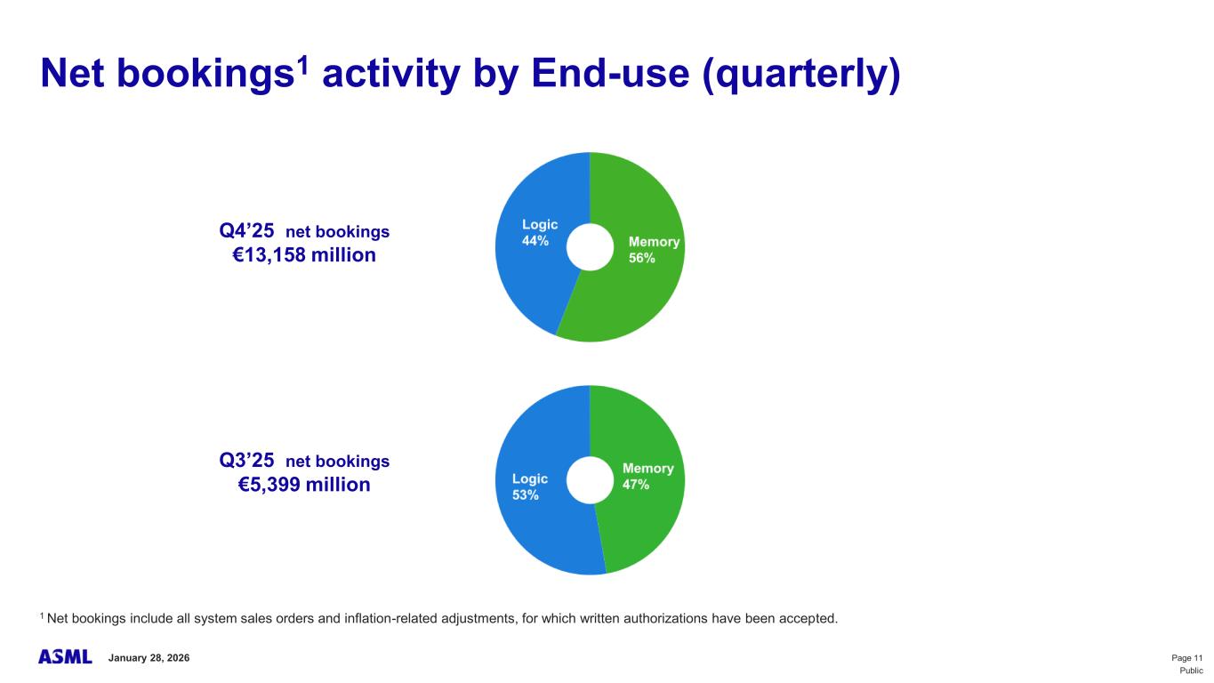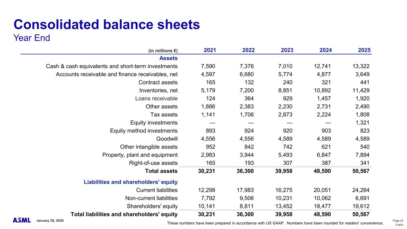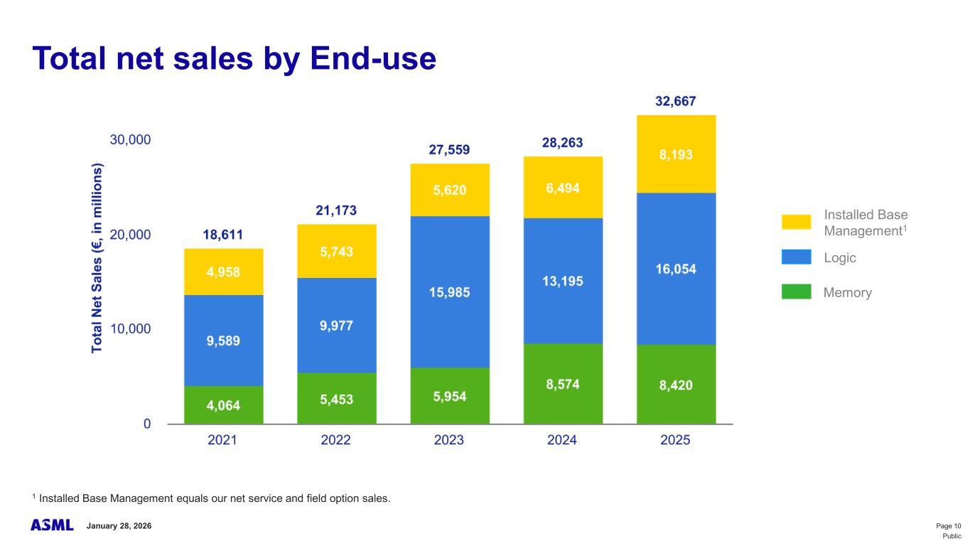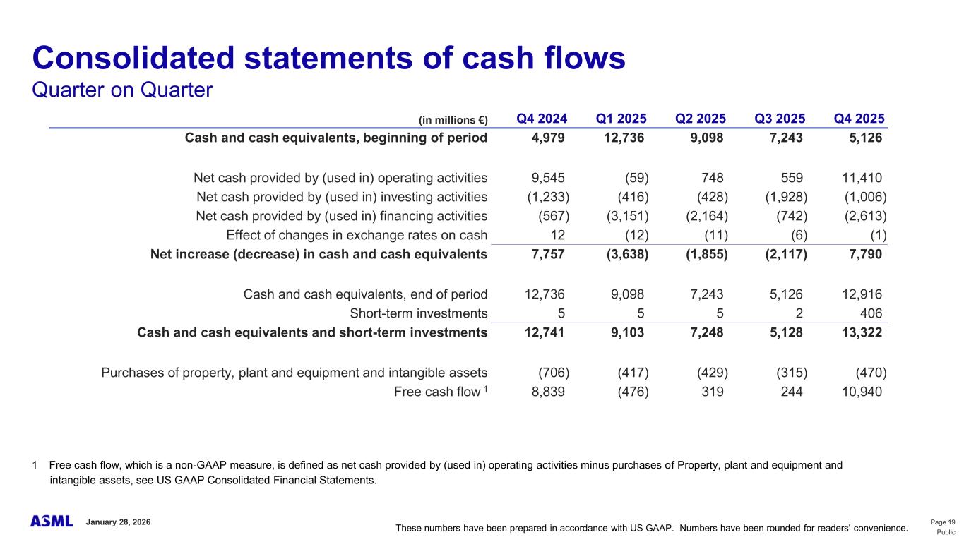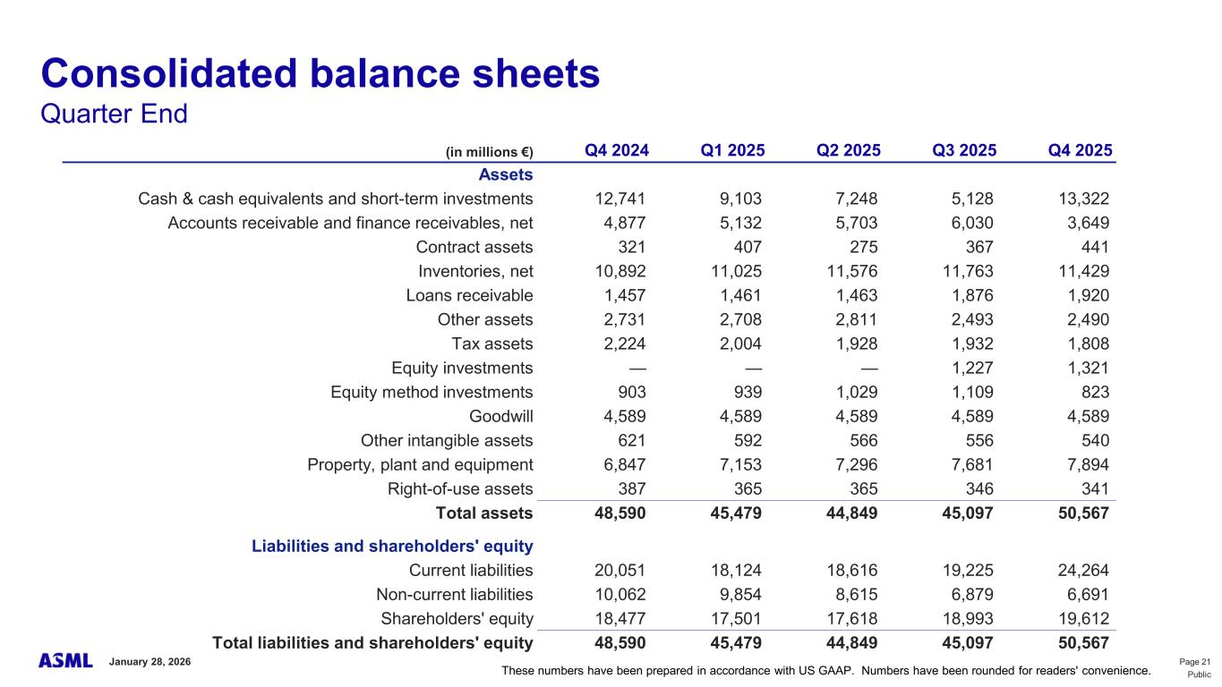 This document and related discussions contain statements that are forward-looking within the meaning of the U.S. Private Securities Litigation Reform Act of 1995, including statements with respect to plans, strategies, expected trends, including expected trends in the semiconductor industry and end markets, expected trends in product mix and geography, business environment trends, expected growth in the semiconductor industry by 2030, and the semiconductor ecosystem being poised to experience significant growth and ASML being well positioned to benefit, statements with respect to AI including the expected impact of AI demand on our business, industry and results and expected sustainability of AI related demand, statements with respect to EUV adoption, our expectation that lithography will remain at the heart of customer innovation, expected increase in critical lithography exposures, statements with respect to our product portfolio, expected demand, shipments, system backlog, outlook of market segments and geographies, outlook and expected financial results including outlook and expected results for Q1 2026, including net sales, Installed Base Management sales, gross margin, R&D costs, SG&A costs, outlook and expected financial results for full year 2026, including expected full year 2026 total net sales and growth, gross margin, annualized effective tax rate and IBM sales, expectations with respect to EUV and DUV demand and sales in 2026, statements made at our 2024 Investor Day, including revenue and gross margin model and opportunity for 2030, our expectation to continue to return significant amounts of cash to shareholders through growing dividends and share buybacks, intentions and expectations with respect to our share buyback program announced in January 2026, and statements with respect to dividends including 2025 dividends, statements with respect to expected performance and capabilities of our systems and customer outlook and plans including capacity expansion plans, statements with respect to our ESG strategy and commitments and other non-historical statements. You can generally identify these statements by the use of words like “may”, “expect”, “will”, “could”, “should”, “project”, “believe”, “anticipate”, “expect”, “plan”, “estimate”, “forecast”, “guide”, “potential”, “intend”, “continue”, “target”, “future”, “progress”, “goal”, “model”, “opportunity”, “commitment” and variations of these words or comparable words. These statements are not historical facts, but rather are based on current expectations, estimates, assumptions, plans and projections about our business and industry and our future financial results and readers should not place undue reliance on them. Forward-looking statements do not guarantee future performance and involve a number of substantial known and unknown risks and uncertainties. These risks and uncertainties include, without limitation, risks relating to customer demand, semiconductor equipment industry capacity, worldwide demand for semiconductors and semiconductor manufacturing capacity, lithography tool utilization and semiconductor inventory levels, general trends and consumer confidence in the semiconductor industry, the impact of general economic conditions, including the impact of the current macroeconomic and geopolitical environment on the semiconductor industry, semiconductor market conditions, the impact of AI on our industry and business and semiconductor demand and demand for our tools, the impact of inflation, interest rates, wars and geopolitical developments, the impact of pandemics, the performance of our systems, the success of technology advances and the pace of new product development and customer acceptance of and demand for new technologies and products, our production capacity and ability to adjust capacity to meet demand, supply chain capacity, timely availability of parts and components, raw materials, critical manufacturing equipment and qualified employees, our ability to produce systems to meet demand, the number and timing of systems ordered, shipped and recognized in revenue, risks relating to fluctuations in orders and our ability to orders into sales and risks relating to the realization of our backlog, the risk of order cancellations, delays or push outs and restrictions on shipments of systems, including ordered systems, under export controls, risks relating to the trade environment, import/export and national security regulations and orders and their impact on us, including the impact of changes in export regulations and the impact of such regulations on our ability to obtain necessary licenses and to sell our systems and provide services to certain customers, the impact of the tariff announcements, exchange rate fluctuations, changes in tax rates, available liquidity and free cash flow and liquidity requirements, our ability to refinance our indebtedness, available cash and distributable reserves for, and other factors impacting, dividend payments and share repurchases, the number of shares that we repurchase under our share repurchase program, our ability to enforce patents and protect intellectual property rights and the outcome of intellectual property disputes and litigation, our ability to meet ESG goals and commitments and execute our ESG strategy, other factors that may impact ASML’s business or financial results, and other risks indicated in the risk factors included in ASML’s Annual Report on Form 20-F for the year ended December 31, 2024 and other filings with and submissions to the US Securities and Exchange Commission. These forward-looking statements are made only as of the date of this document. We undertake no obligation to update any forward-looking statements after the date of this report or to conform such statements to actual results or revised expectations, except as required by law.
