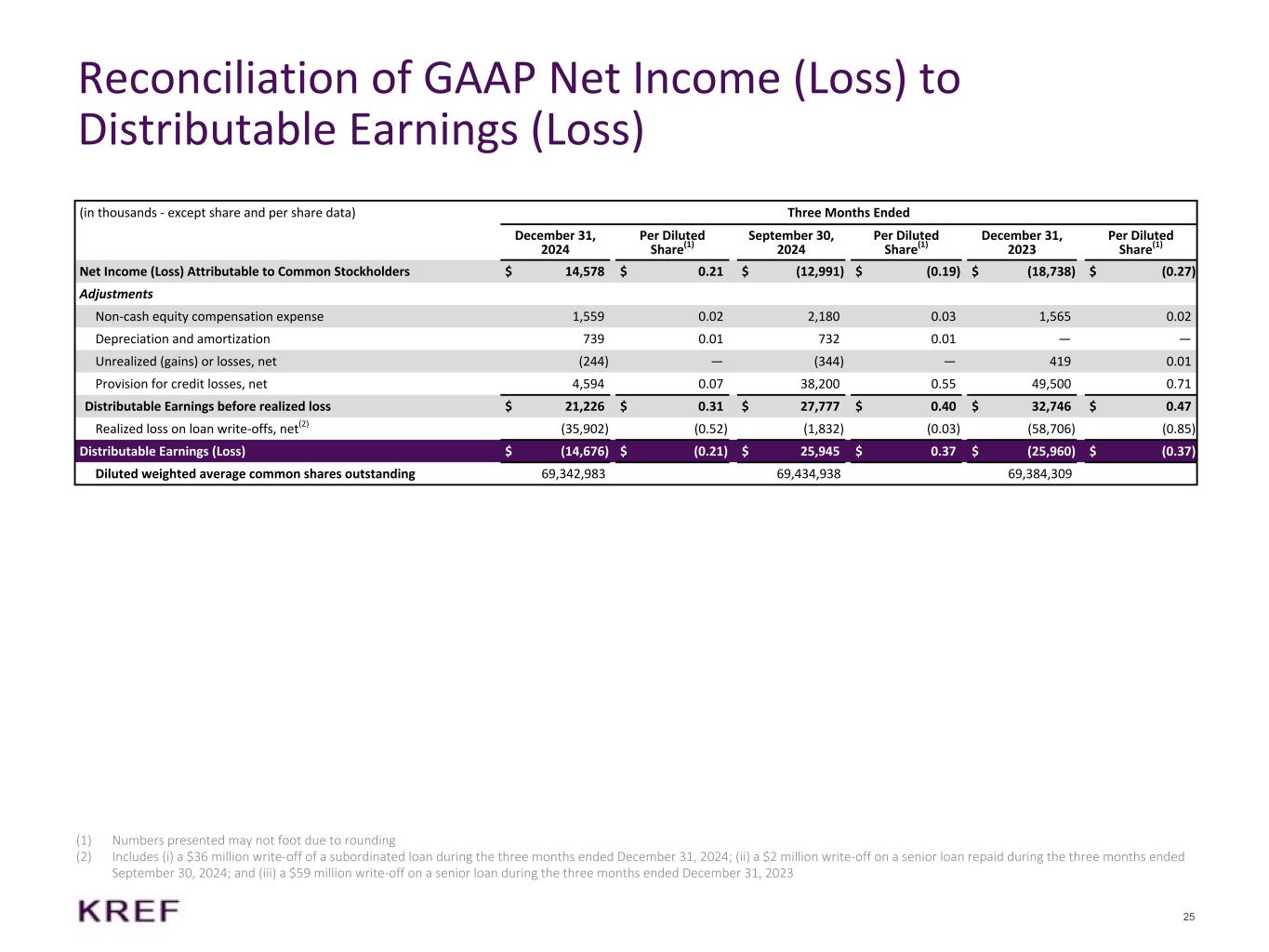 以下の表は、2024年12月31日に終了した3ヵ月間、2024年9月30日および2023年12月31日に終了した3ヵ月間、ならびに2024年12月31日および2023年12月31日に終了した各年度の、分配可能利益(損失)および関連する希薄化後1株当たり金額を、それぞれ普通株主に帰属する当期純利益(損失)および関連する希薄化後1株当たり金額に調整したものです(単位:千米ドル、1株当たりデータを除く):