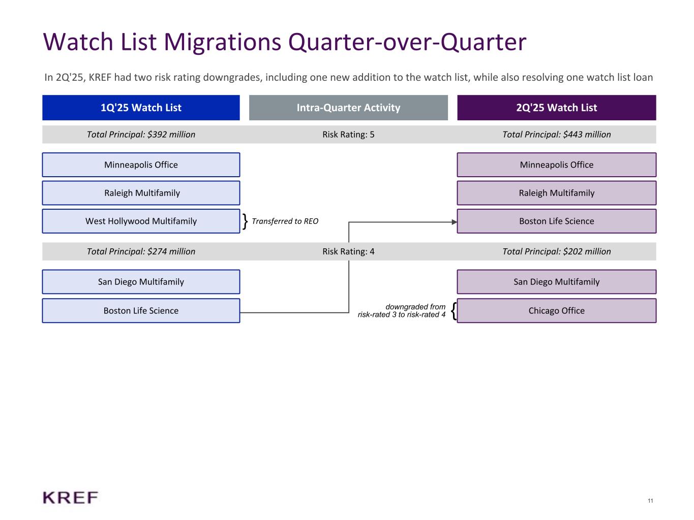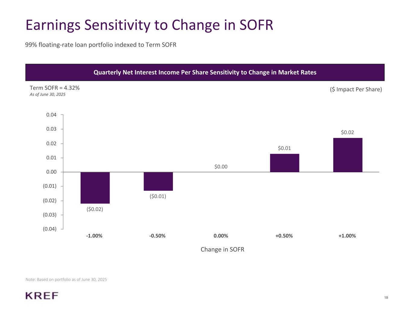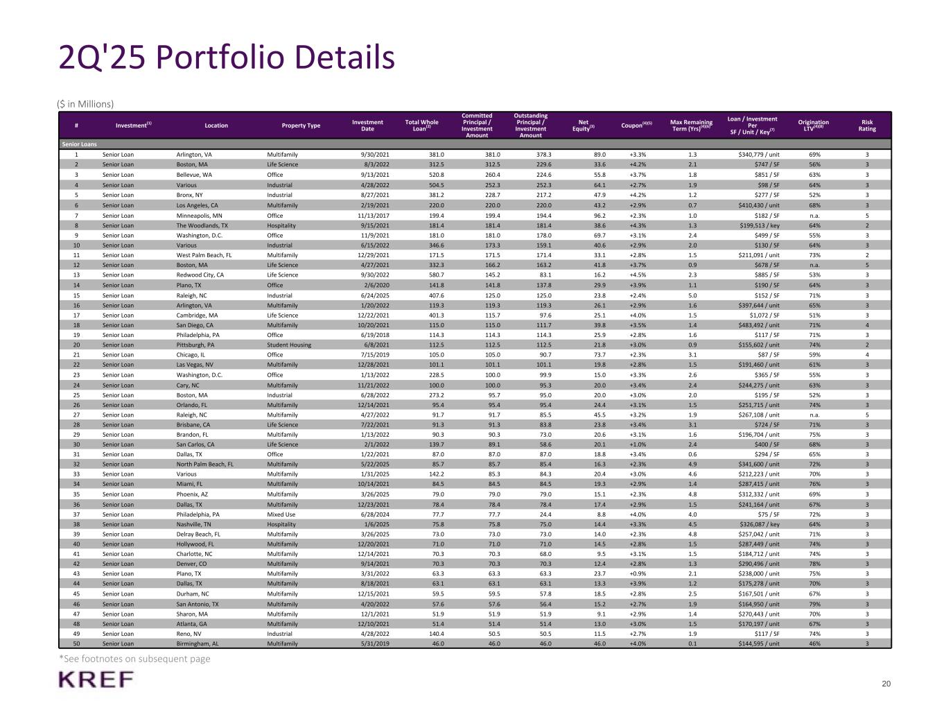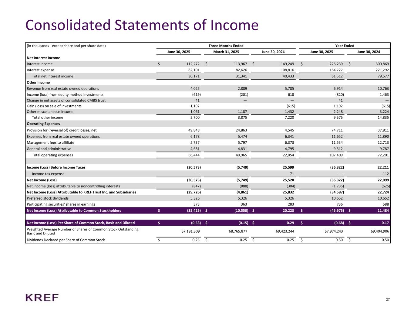-2025年6月30日現在のCECL引当金1億7,390万ドル(1株当たり(2.64ドル))を含む普通帳簿価額は9億1,230万ドル(1株当たり13.84ドル)。2025年6月30日に終了した3ヵ月間において、CECL引当金は4,980万ドル(1株当たり(0.74ドル))増加した。これは主に、オフィス部門およびライフサイエンス部門のウォッチリスト・ローンに対する引当金の追加計上によるものである。