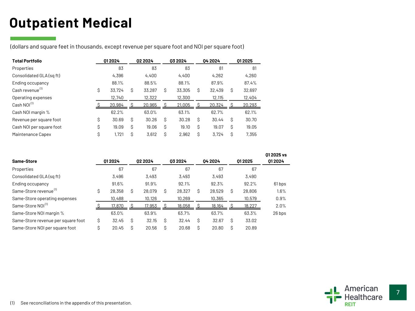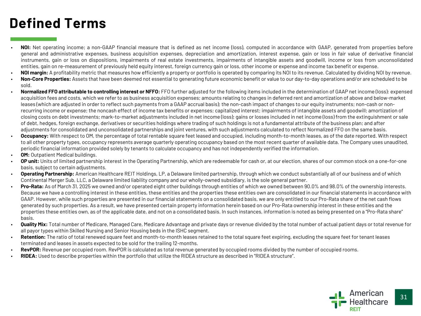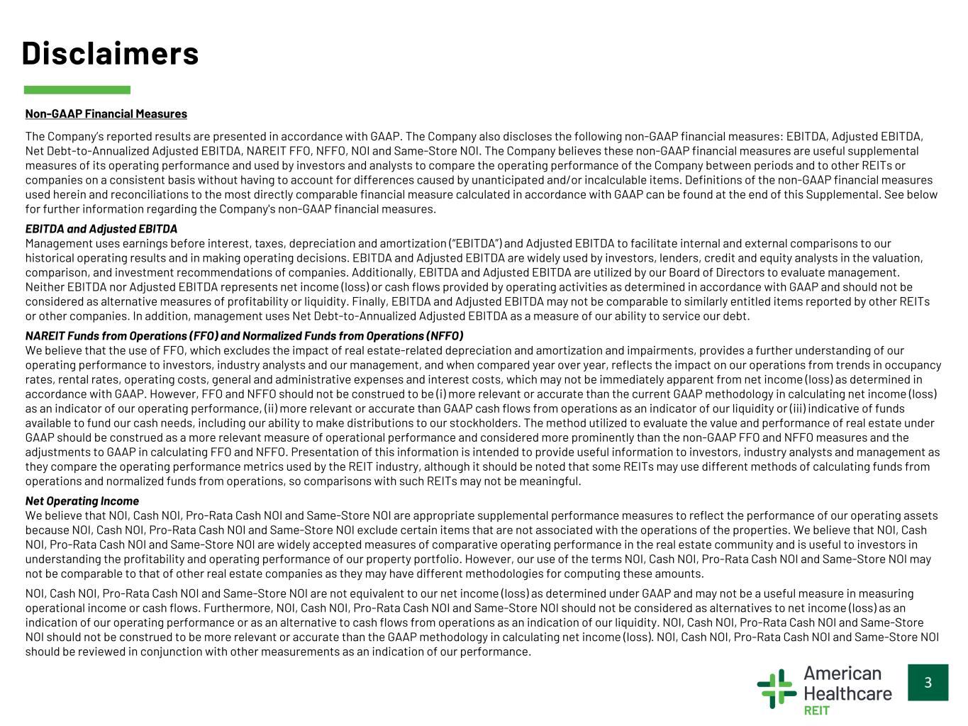 当社は、2025年3月31日現在および3月31日に終了した3ヶ月間のポートフォリオ、財政状態および経営成績に関する補足情報、ならびにその他の情報を開示しており、当社ウェブサイトの投資家向け情報セクション(https://ir.americanhealthcarereit.com)にてご覧いただけます。