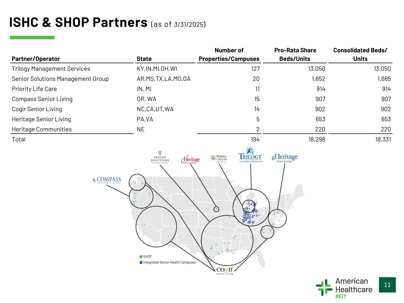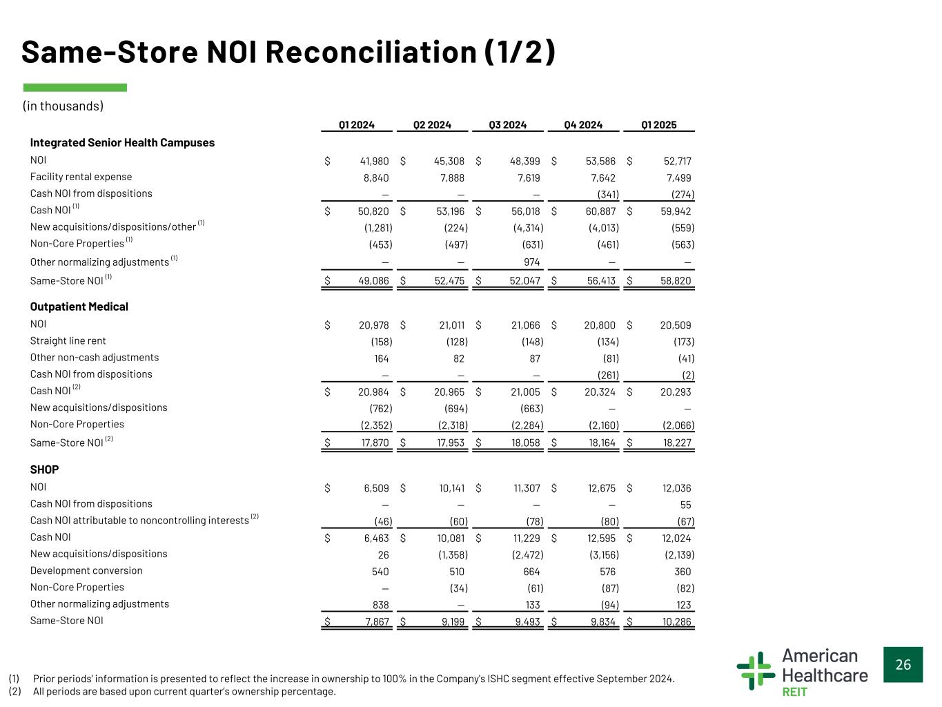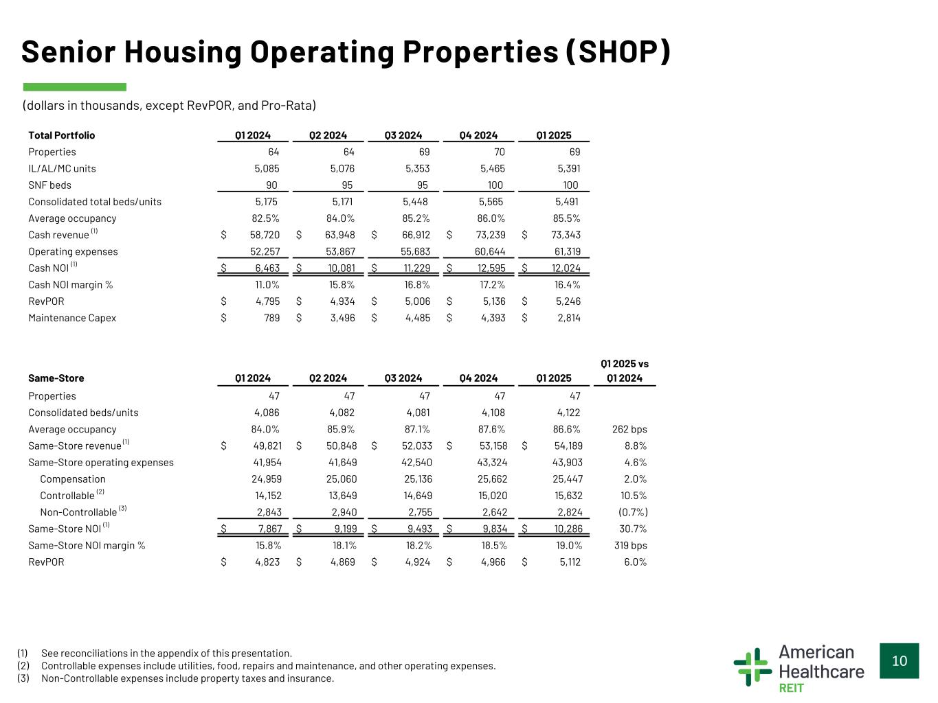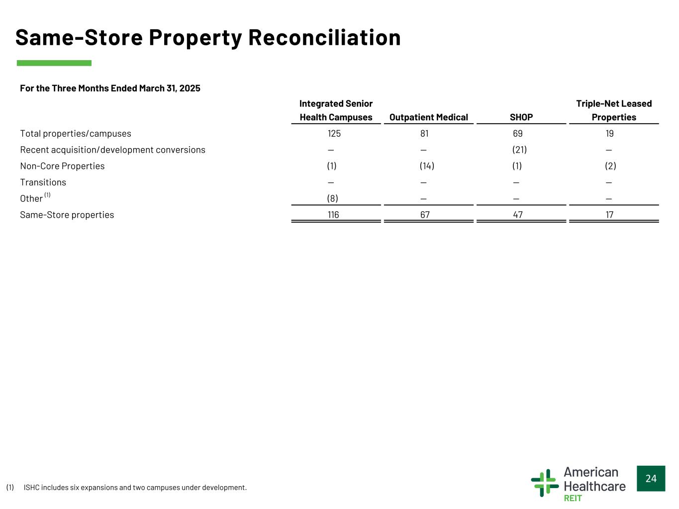 -2025年3月31日に終了した3ヶ月間において、高齢者向け住宅運営施設(SHOP)および統合型シニア・ヘルス・キャンパス(ISHC)の既存店NOIは、それぞれ2024年同期比で30.7%および19.8%の伸びを達成した。
