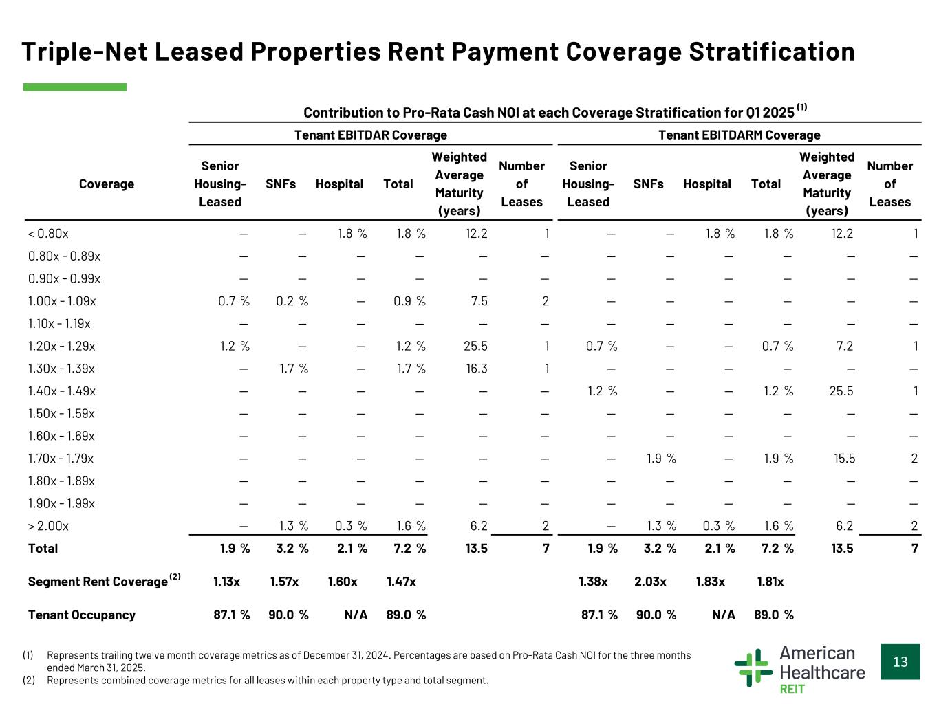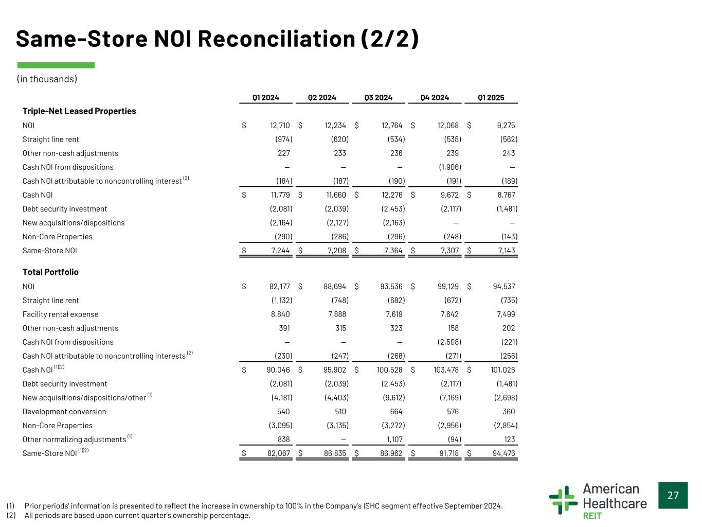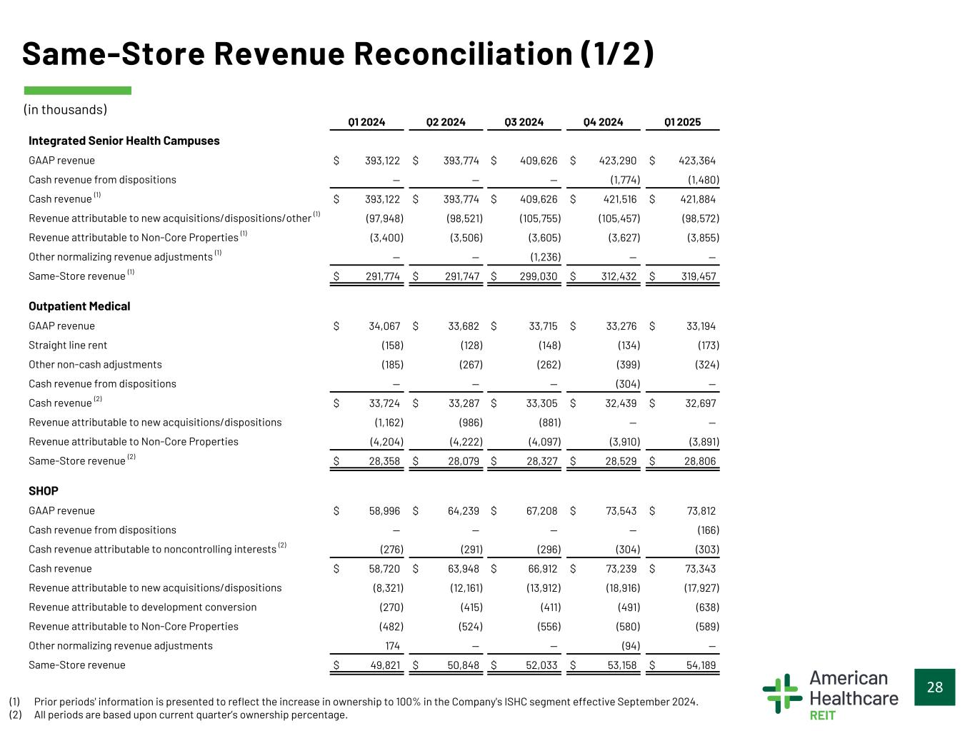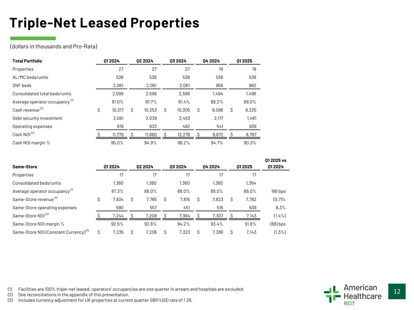 -2025年3月31日に終了した3ヶ月間において、高齢者向け住宅運営施設(SHOP)および統合型シニア・ヘルス・キャンパス(ISHC)の既存店NOIは、それぞれ2024年同期比で30.7%および19.8%の伸びを達成した。