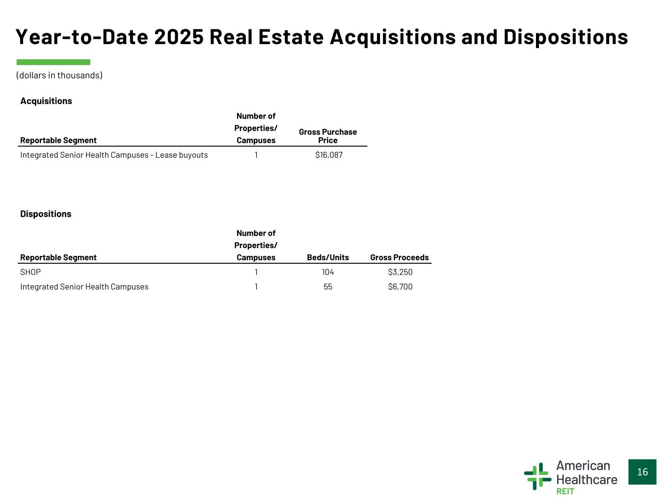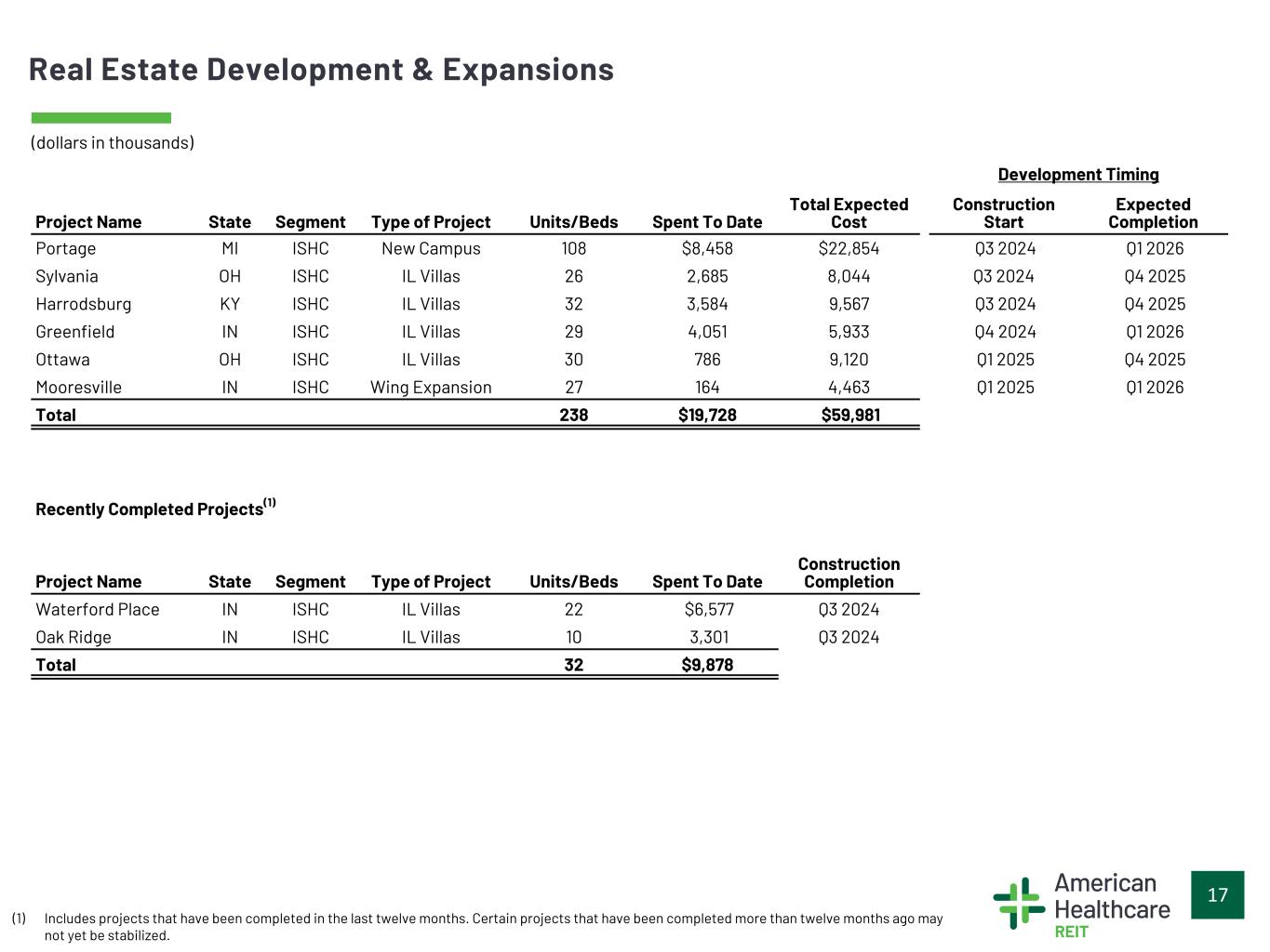-非中核物件3件を売却し、総売却代金は約2,900万ドル。これらの売却益は、リスク調整後リターンの良い将来のSHOP取得資金および現在進行中のISHC開発プロジェクト資金に充当される。