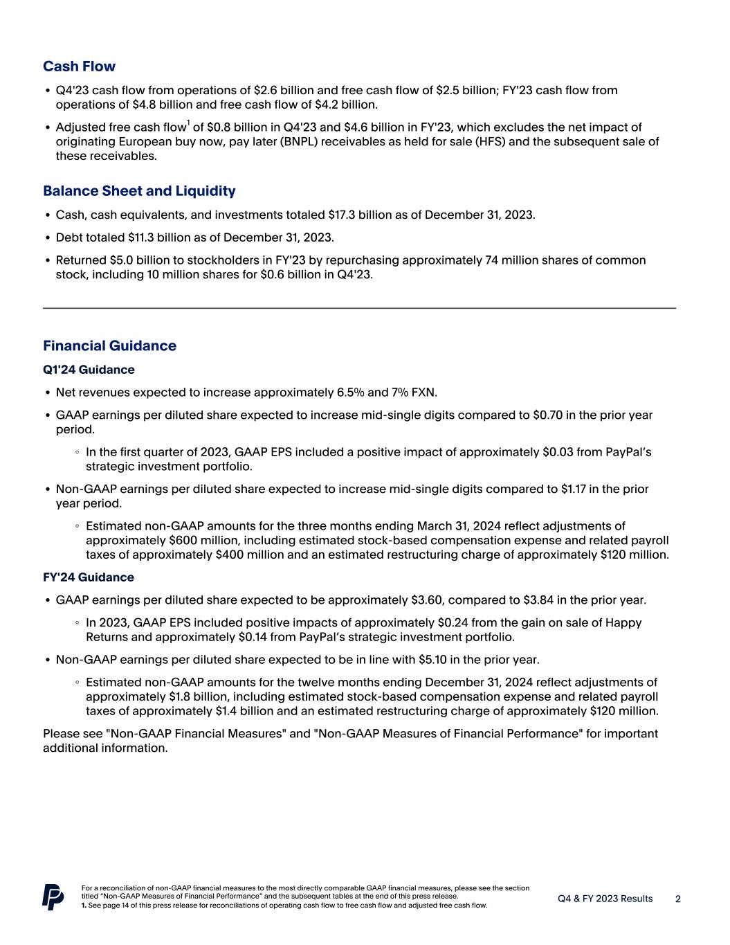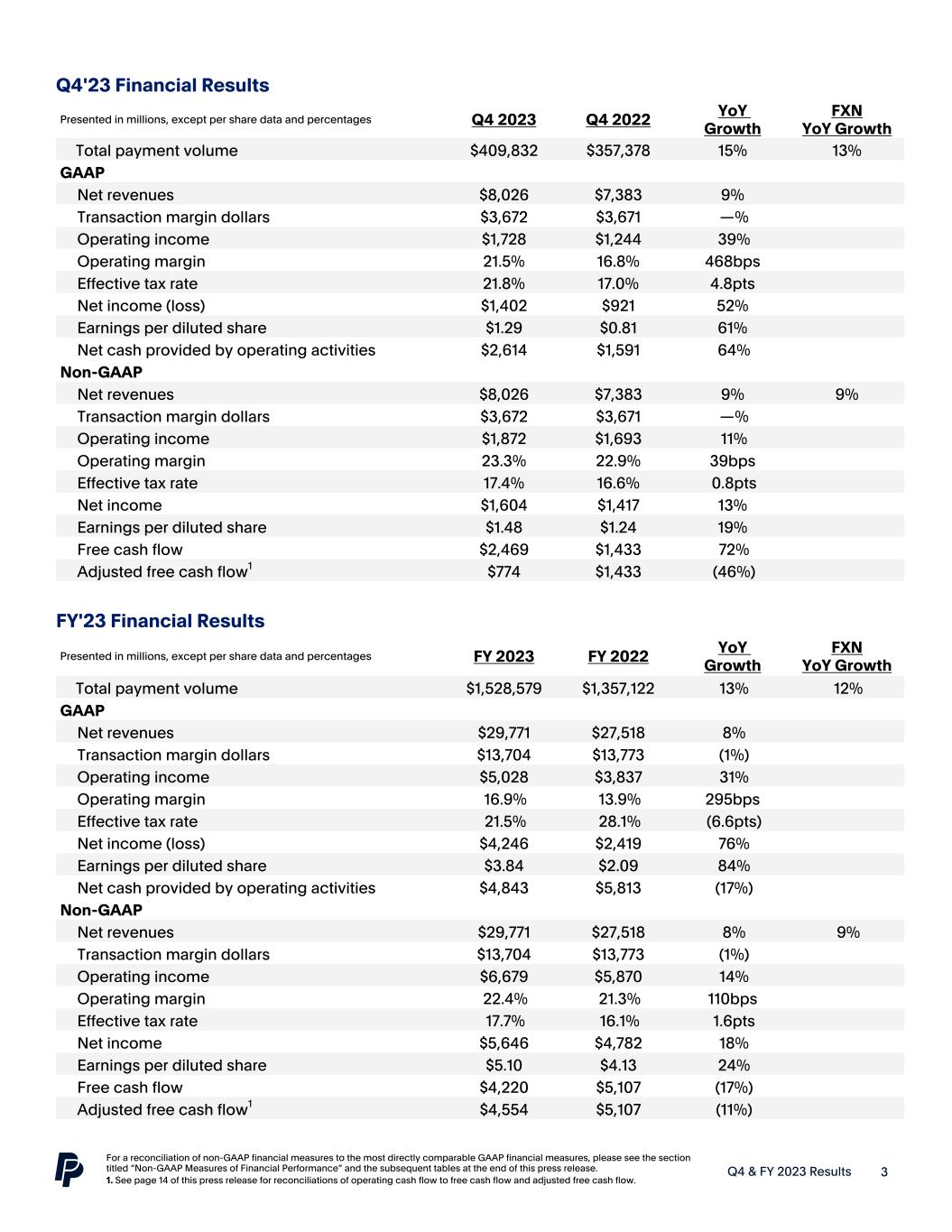 Q4 & FY 2023 Results 1 PayPal finishes 2023 with solid fourth quarter; enters execution year in 2024 Q4'23: Revenue increased 9% to $8.0 billion; GAAP EPS of $1.29 & non-GAAP EPS of $1.48 FY'23: Revenue increased 8% to $29.8 billion; GAAP EPS of $3.84 & non-GAAP EPS of $5.10 For a reconciliation of non-GAAP financial measures to the most directly comparable GAAP financial measures, please see the section titled “Non-GAAP Measures of Financial Performance” and the subsequent tables at the end of this press release. 1. Q4'23 GAAP EPS includes a negative impact of ~$0.01 from PayPal’s strategic investment portfolio, compared to a negative impact of ~$0.11 in Q4’22, and a positive impact of ~$0.25 from the gain on sale of Happy Returns. 2. FY'23 GAAP EPS includes a positive impact of ~$0.14 from PayPal’s strategic investment portfolio, compared to a negative impact of ~$0.20 in FY’22, and a positive impact of ~$0.24 from the gain on sale of Happy Returns. PayPal Reports Fourth Quarter and Full Year 2023 Results San Jose, California February 7, 2024 NASDAQ: PYPL “I’m pleased with our better-than-expected fourth quarter results, which are a testament to the incredible work of the PayPal team and their strong commitment to delivering more value to our customers each day. We're driving significant transformation across our company and are committed to making the necessary changes to our business to drive profitable growth in the years ahead. We've added key talent to our leadership team, accelerated our innovation velocity and impact, and taken action to realize cost savings that we're reinvesting in our most important initiatives. 2024 is a year focused on execution to position PayPal for long-term success.” Alex Chriss President and CEO Q4'23 Financial Results • Net revenues increased 9% on both a spot and foreign-currency neutral basis (FXN) to $8.0 billion. • Transaction margin dollars of $3.7 billion, flat on a year-over-year basis. • GAAP operating income increased 39% to $1.7 billion; non-GAAP operating income increased 11% to $1.9 billion. • GAAP operating margin expanded 468 basis points to 21.5%; non-GAAP operating margin expanded 39 basis points to 23.3%. • GAAP EPS increased 61% to $1.291; non-GAAP EPS increased 19% to $1.48. FY'23 Financial Results • Net revenues increased 8% and 9% FXN to $29.8 billion. • Transaction margin dollars decreased 1% to $13.7 billion. • GAAP operating income increased 31% to $5.0 billion; non-GAAP operating income increased 14% to $6.7 billion. • GAAP operating margin expanded 295 basis points to 16.9%; non-GAAP operating margin expanded 110 basis points to 22.4%. • GAAP EPS increased 84% to $3.842; non-GAAP EPS increased 24% to $5.10. Q4'23 & FY'23 Operating Results • Q4'23 total payment volume (TPV) increased 15% and 13% FXN to $409.8 billion; FY'23 TPV increased 13% and 12% FXN to $1.53 trillion. • Q4'23 payment transactions increased 13% to 6.8 billion; FY'23 payment transactions increased 12% to 25.0 billion. • Payment transactions per active account on a trailing twelve month basis increased 14% to 58.7. • Active accounts decreased 2% to 426 million.