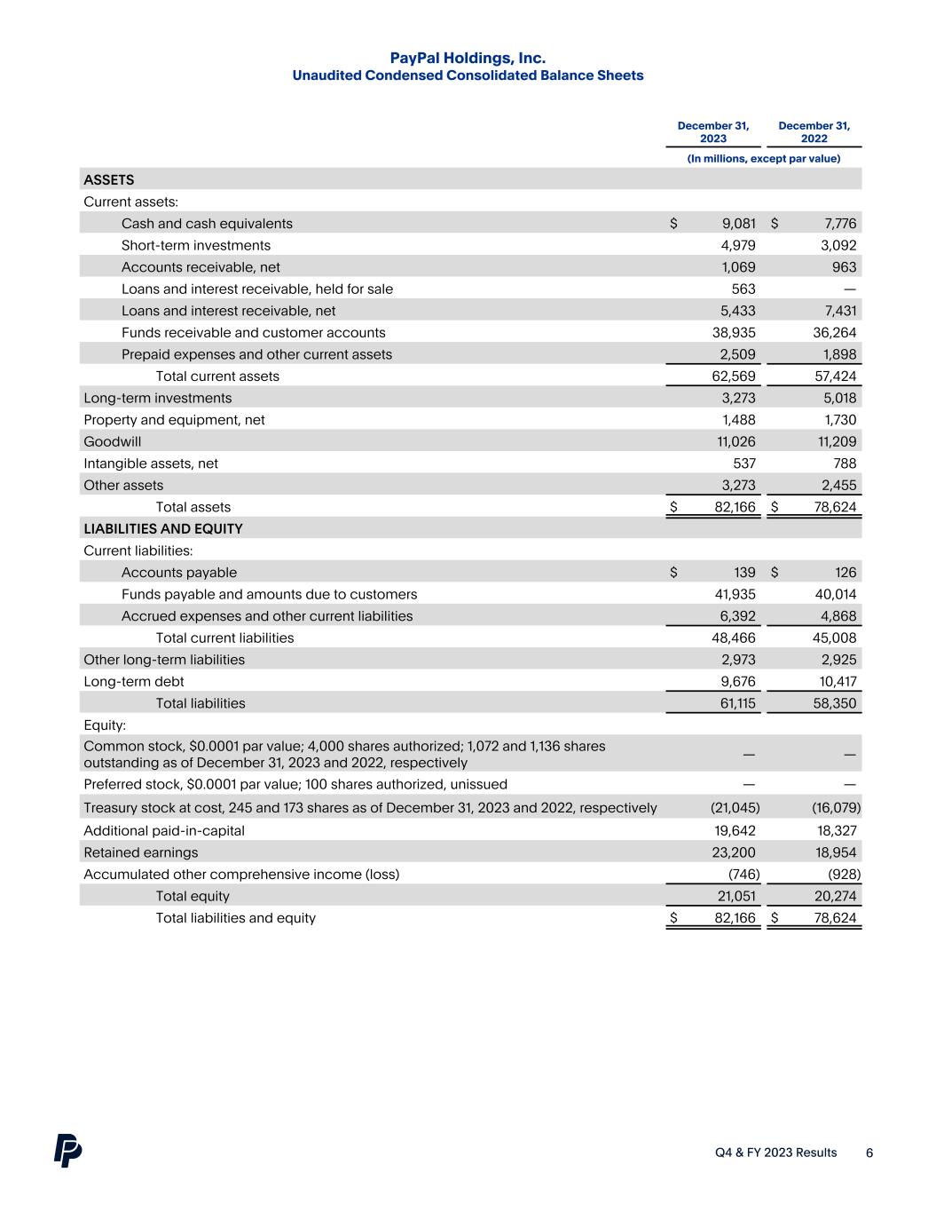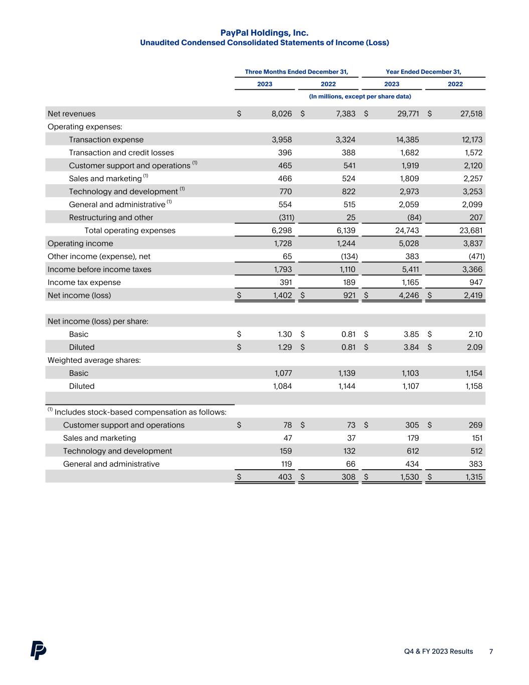 Q4 & FY 2023 Results 6 PayPal Holdings, Inc. Unaudited Condensed Consolidated Balance Sheets December 31, 2023 December 31, 2022 (In millions, except par value) ASSETS Current assets: Cash and cash equivalents $ 9,081 $ 7,776 Short-term investments 4,979 3,092 Accounts receivable, net 1,069 963 Loans and interest receivable, held for sale 563 — Loans and interest receivable, net 5,433 7,431 Funds receivable and customer accounts 38,935 36,264 Prepaid expenses and other current assets 2,509 1,898 Total current assets 62,569 57,424 Long-term investments 3,273 5,018 Property and equipment, net 1,488 1,730 Goodwill 11,026 11,209 Intangible assets, net 537 788 Other assets 3,273 2,455 Total assets $ 82,166 $ 78,624 LIABILITIES AND EQUITY Current liabilities: Accounts payable $ 139 $ 126 Funds payable and amounts due to customers 41,935 40,014 Accrued expenses and other current liabilities 6,392 4,868 Total current liabilities 48,466 45,008 Other long-term liabilities 2,973 2,925 Long-term debt 9,676 10,417 Total liabilities 61,115 58,350 Equity: Common stock, $0.0001 par value; 4,000 shares authorized; 1,072 and 1,136 shares outstanding as of December 31, 2023 and 2022, respectively — — Preferred stock, $0.0001 par value; 100 shares authorized, unissued — — Treasury stock at cost, 245 and 173 shares as of December 31, 2023 and 2022, respectively (21,045) (16,079) Additional paid-in-capital 19,642 18,327 Retained earnings 23,200 18,954 Accumulated other comprehensive income (loss) (746) (928) Total equity 21,051 20,274 Total liabilities and equity $ 82,166 $ 78,624