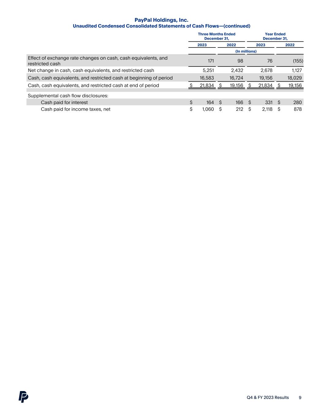 Q4 & FY 2023 Results 9 PayPal Holdings, Inc. Unaudited Condensed Consolidated Statements of Cash Flows—(continued) Three Months Ended December 31, Year Ended December 31, 2023 2022 2023 2022 (In millions) Effect of exchange rate changes on cash, cash equivalents, and restricted cash 171 98 76 (155) Net change in cash, cash equivalents, and restricted cash 5,251 2,432 2,678 1,127 Cash, cash equivalents, and restricted cash at beginning of period 16,583 16,724 19,156 18,029 Cash, cash equivalents, and restricted cash at end of period $ 21,834 $ 19,156 $ 21,834 $ 19,156 Supplemental cash flow disclosures: Cash paid for interest $ 164 $ 166 $ 331 $ 280 Cash paid for income taxes, net $ 1,060 $ 212 $ 2,118 $ 878